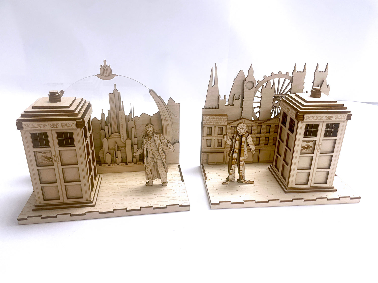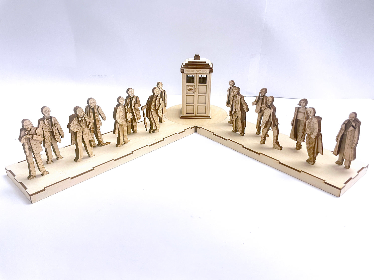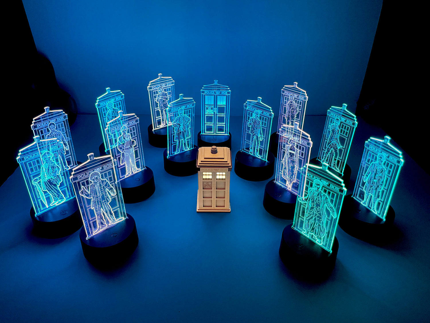 The TARDIS as beautiful wood model. Not only is it a wood model though, it is also a tea light! The light shines through the windows of the TARDIS giving any area it lands a warm inviting glow. Surrounding the TARDIS are LED Lights of the Doctor. While there are only a handful of Doctors in this image, all 15 Doctors are available as the LED lights. Behind all the doctors is a silhouette of the TARDIS as if they were just walking out of it heading off to a new adventure. We even have a few LED lights of just the TARDIS itself. Like all the other lights, they are battery or USB powered and change color. Suffice to say there is no shortage of options when coming to choosing who your Doctor wants to be that lights up your night.