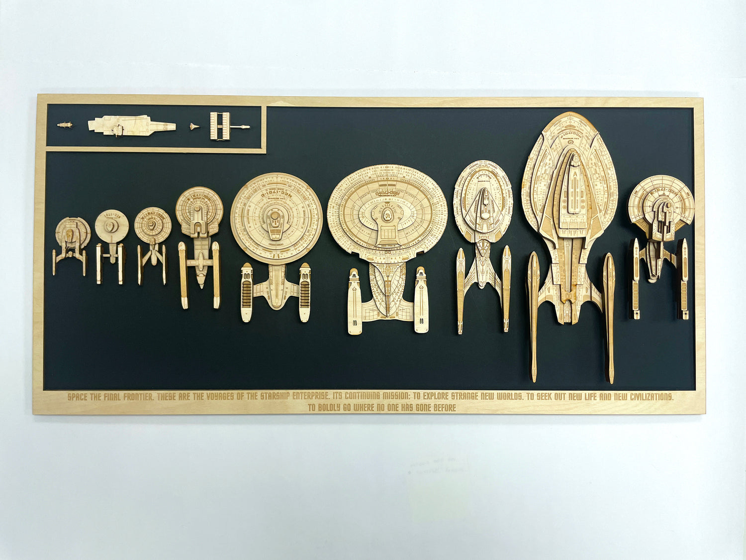 This model series showcases 40 different starship classes as top down starship graphics as a 3d pop art model. These plaques are built from strong plywood parts so those nacelle pylons are super strong and we get very tiny details. Having the black background along with the LCARS style border makes each starship really pop off the base making it nearly feel lifelike. Each model can be like their on screen counterpart with their name and registry OR you can customize your ship with your own name and registry. This is perfect for those who belong to ship based communities or groups, a birthday gift, a ship you play on your video games or just a ship that you command in your own imagination. This is a great way to start building your real life fleet in your home. The ships in the image are part of our Beta Fleet. This group is all the starships you have seen in the background of the show or as one off ships in specific episodes. If you like how this fleet looks, just think what the Alpha Fleet looks like with all the hero ships we all know and love. Please check them all out. There is a starship plaque out there for everyone.