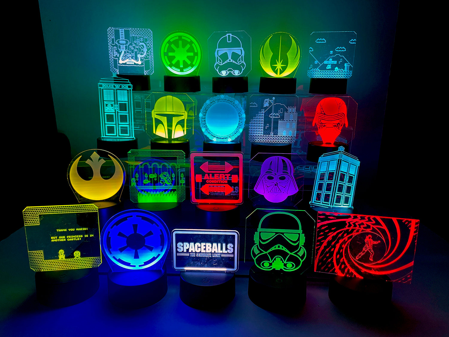 Is wood not your thing? We understand. May we interest you in acrylic lights instead? As we know, we all like Different things, so this is our way of giving you another option outside our wood pop art collection. These LED lights span all of our collections which in include Star Wars, Mario, Stargate, James Bond, Spaceballs and Doctor Who. They shine bright and are all so colorful. All these models come with the LED Light base which you can control those wonderful colors. All can be battery powered or USB. What is best about this collection is that it is ever growing. The more collection we make, the more LED light design and opportunities arise. It is always nice to see that our designs are transformative into multiple mediums and styles. This collection proves that and hopefully it showcases our ability to always come up with fresh new things!