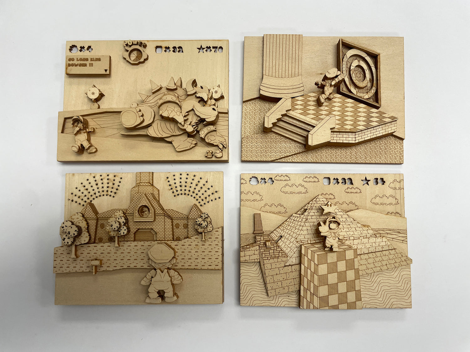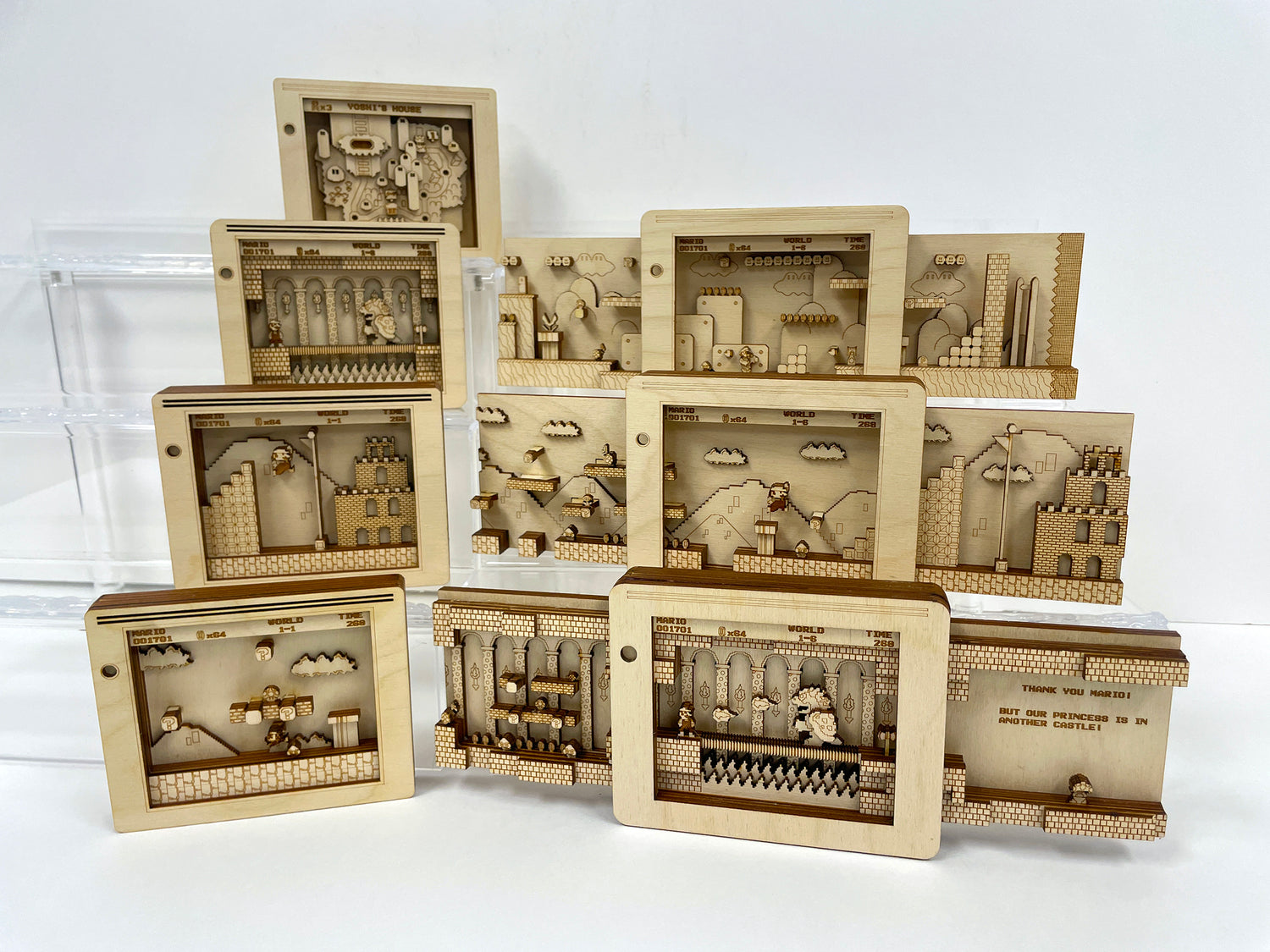 Dust off those old SNES controllers and gameboys…. Mario is back in action! The panoramas both in their large and small formats showcase Mario through his early platforming games doing what he does best, getting to the castle and saving the princess. This collection shows off how amazing the retro elements of the Super Mario gaming universe can be reimagined, reconstructed and become new again. The larger models are designed as a tri-glyphs showing off where you were, where you are and where you are going. The smaller models are more like a screenshot of one moment of gameplay. The models are all built from layers of wood giving that old two dimensional look of gaming a fresh three dimensional edge. An added bonus to the elegance of these models, you can customize them! On any of these models you have the opportunity to change the name, coin count, time, level or points. How about that for taking control of the game! Truly a unique item for that gamer in your life.