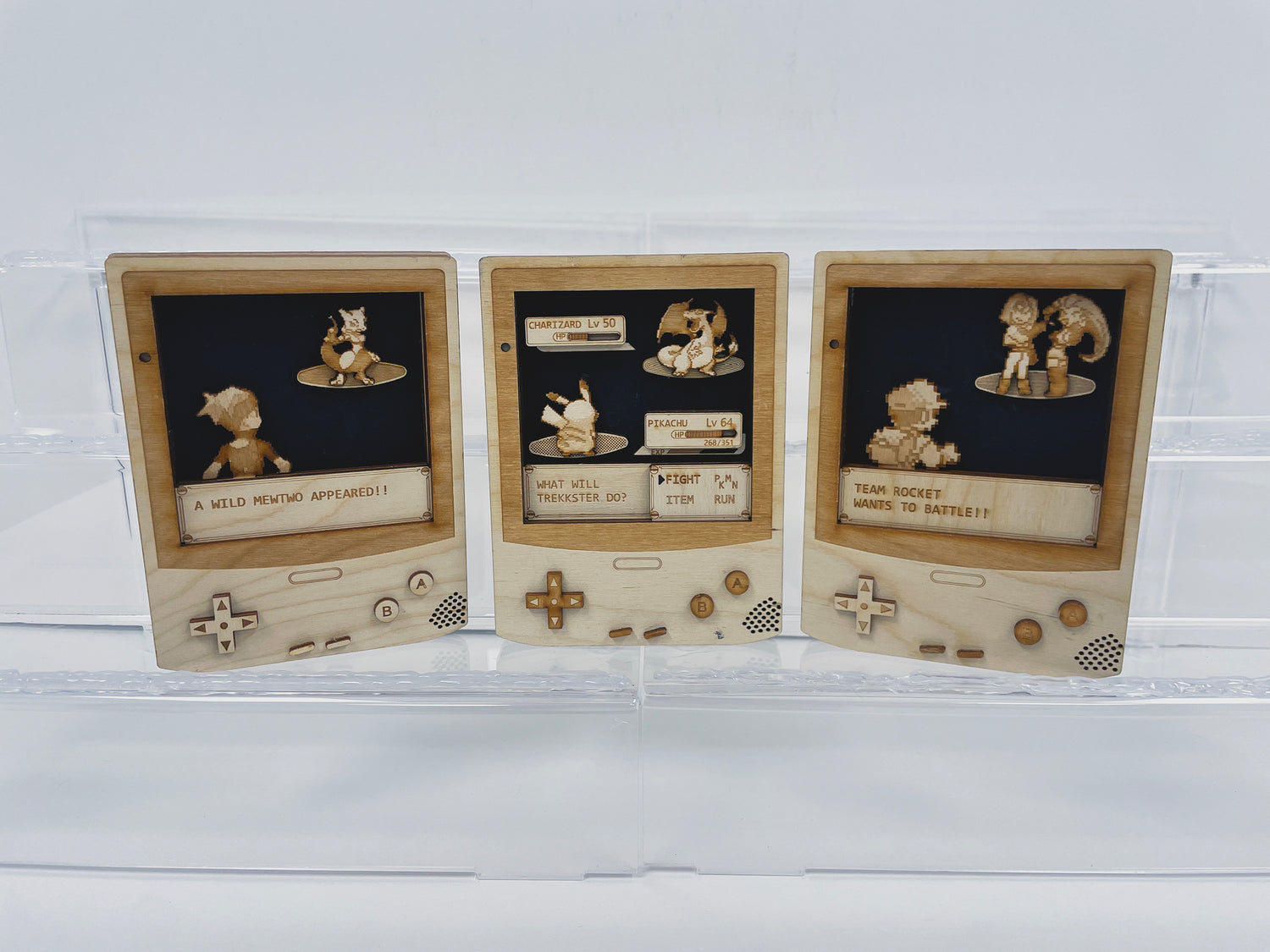 Catching that elusive Pokémon? Battling your most hated rival? This gameboy inspired shadow box Pokémon collection allows all of this to happen. Out of everything in the Trekatecture line, these are the most customizable models available. You get to pick just about every single element on these models. What that means is that each model is bespoke, one a kind, for you. Selection options include the Pokémon themselves obviously, the player sprites, the bases the Pokémon stand on, the buttons and the rival sprites. You can even customize your name, the Pokémon names and the rival names. There are a lot of decisions to make your perfect model, to be the very best. Are you up for that task?