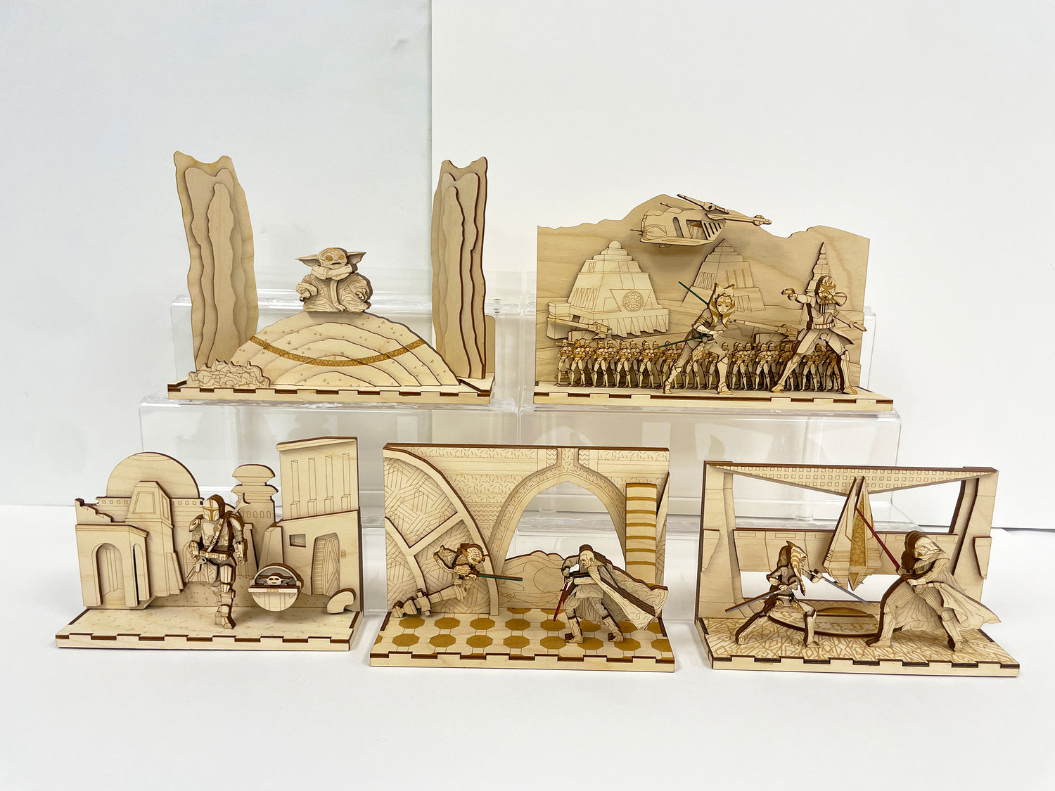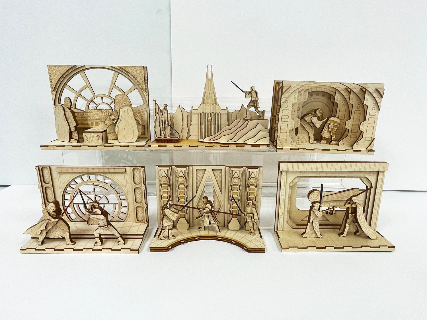 These wood models produce creative way to showcase an iconic screen cap of your favorite space western. This collection spans the entire Star Wars franchise, hand picking some of our favorite moments in the movies. They span from many of the iconic lightsaber duels between the light and lark, important messages being transmitted, traveling with some our favorite friends and more. Each model is designed to be a self-standing open air diorama with the characters of Star Wars being front and center. The three dimensional effect is further elevated having the backgrounds in perspective and the characters being built out of multiple layers. No matter which part of the franchise you are a fan of there will be a model that you will fall in love with.