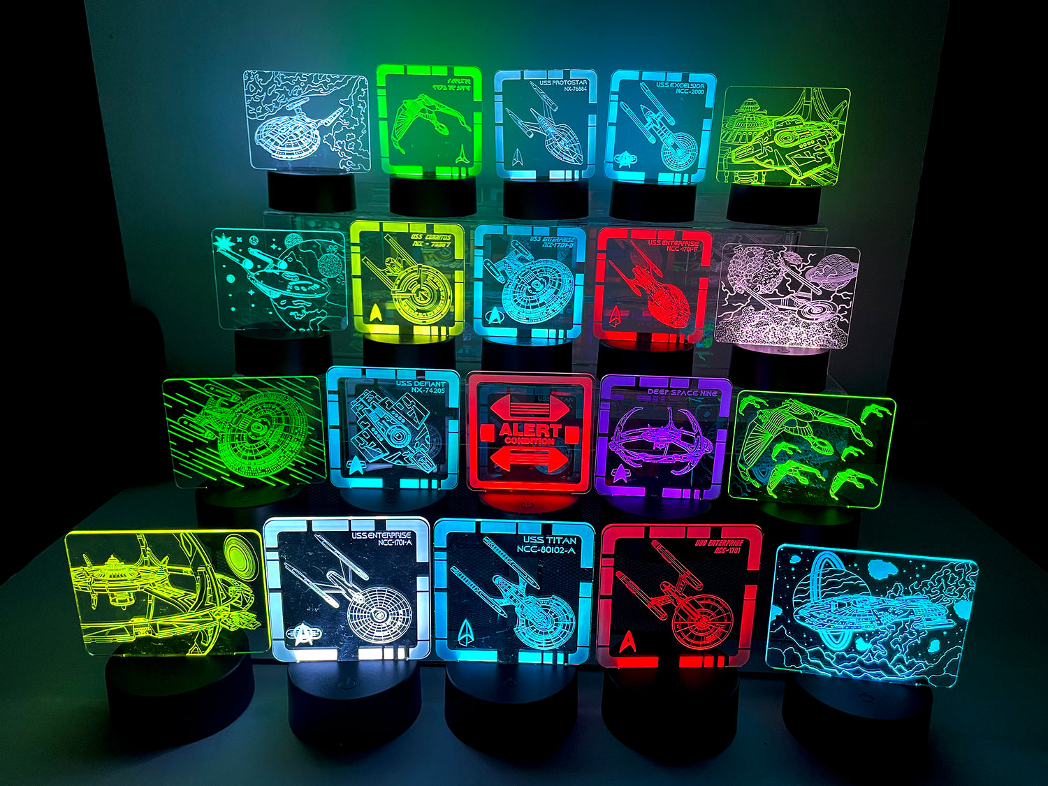 You want a light up model instead of something made of wood? This collection is for you. With nearly 75 different LED plates available, at least one of these finely detailed lights should capture your interest. The image here is a small sampling of what is available. All of the wood models can be an LED Light. All the scenes are available. All of the starship plaques are available as well. You can even customize the light with your own starship name and registry if you wish. Within the collection there are a few additional LED plates that are unique to this collection. One is the RED ALERT LED light! Is a convention favorite since it release. All the models come with a bases that can be battery or USB powered. The base can light up a solid color or rotate in a multiple color patterns. It is up to you how you like to display your piece.