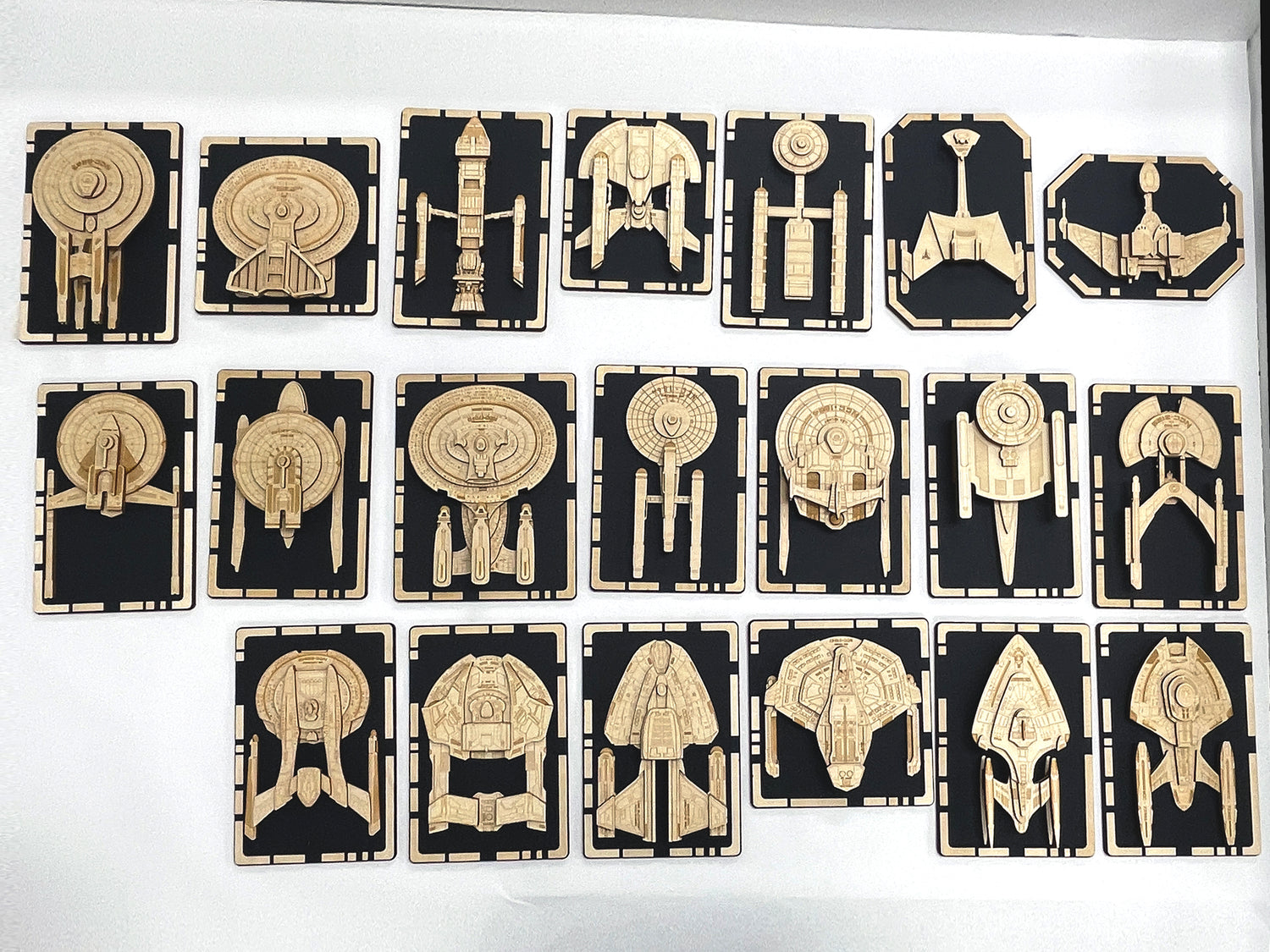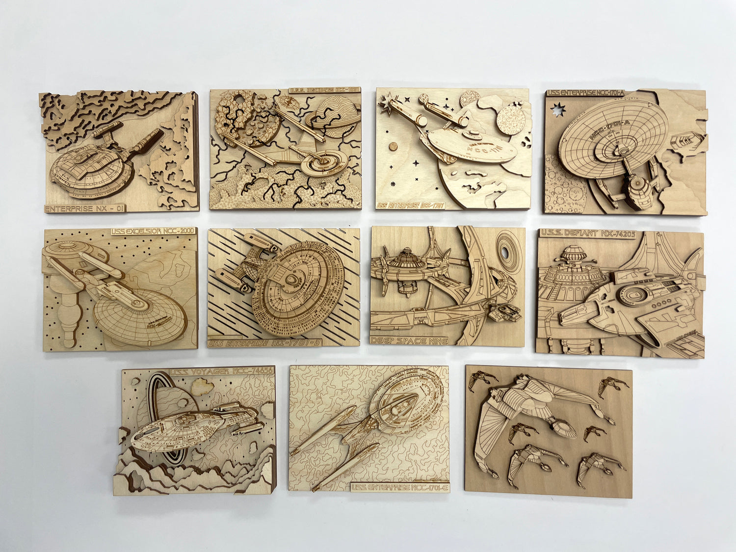 Every starship deserves a beauty shot. These wood models give each of the hero ships of Trek their well-deserved close up. Each starship scene is based around of their iconic scenes. Some of those backgrounds include traveling at warp, exploring new worlds, traveling through the unknown, saving the day or keeping watch at a wormhole. Even though each model is built to be three dimensional, the models have a forced perspective making them move as your eyes change direction. Everyone has a favorite starship and everyone is represented here. Each model also has many fun built in details throughout the backgrounds that call out elements of each franchise. The starship scenes come in two sizes, a small vignette and a larger picture size. It is up to you which version you prefer. No matter what it is guaranteed to impress your other Trekkie friends.