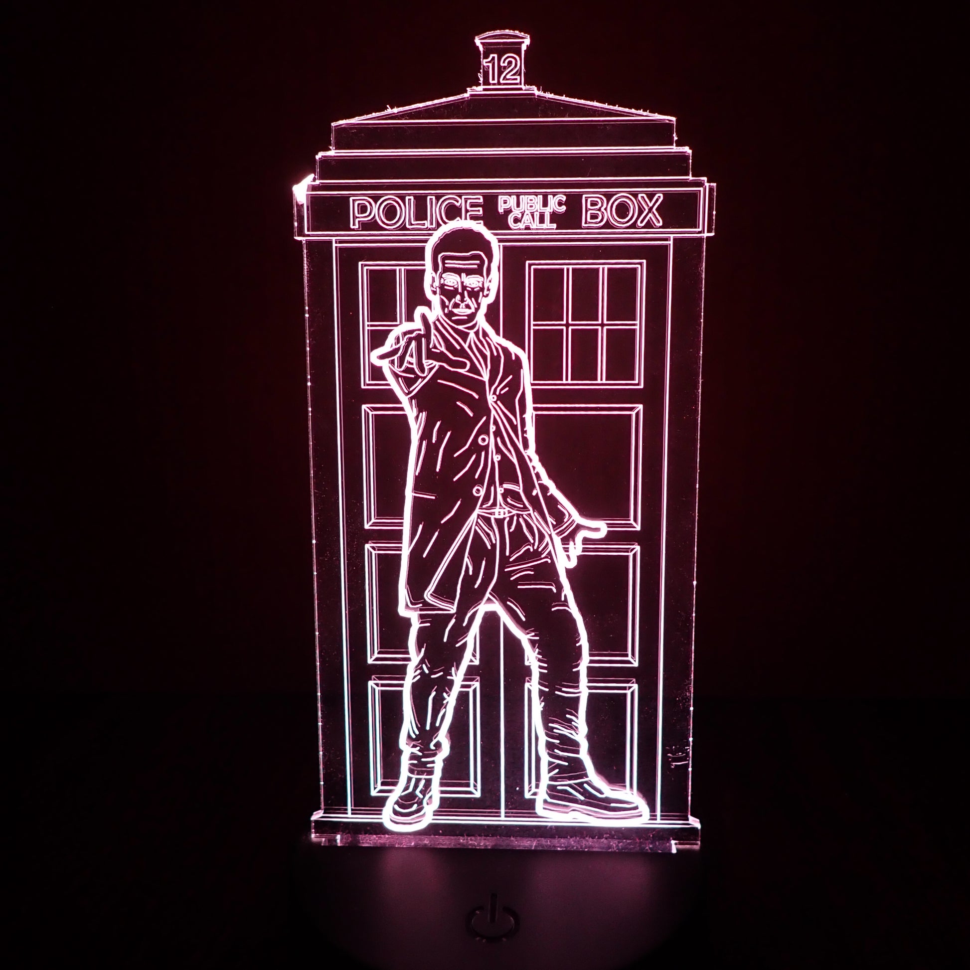 Etched acrylic LED plate of the TWELVETH DOCTOR with the TARDIS in the background. Each model comes with their own mutli-color changing LED light base. Colors include, Red, Yellow, Green, Blue, Magenta, Cyan, Orange and White. The base is either USB powered or battery powered (batteries not included). A great display item for that Whovian in your life. Put it on your desk, display rack or bookshelf. It even can be used as a night light!