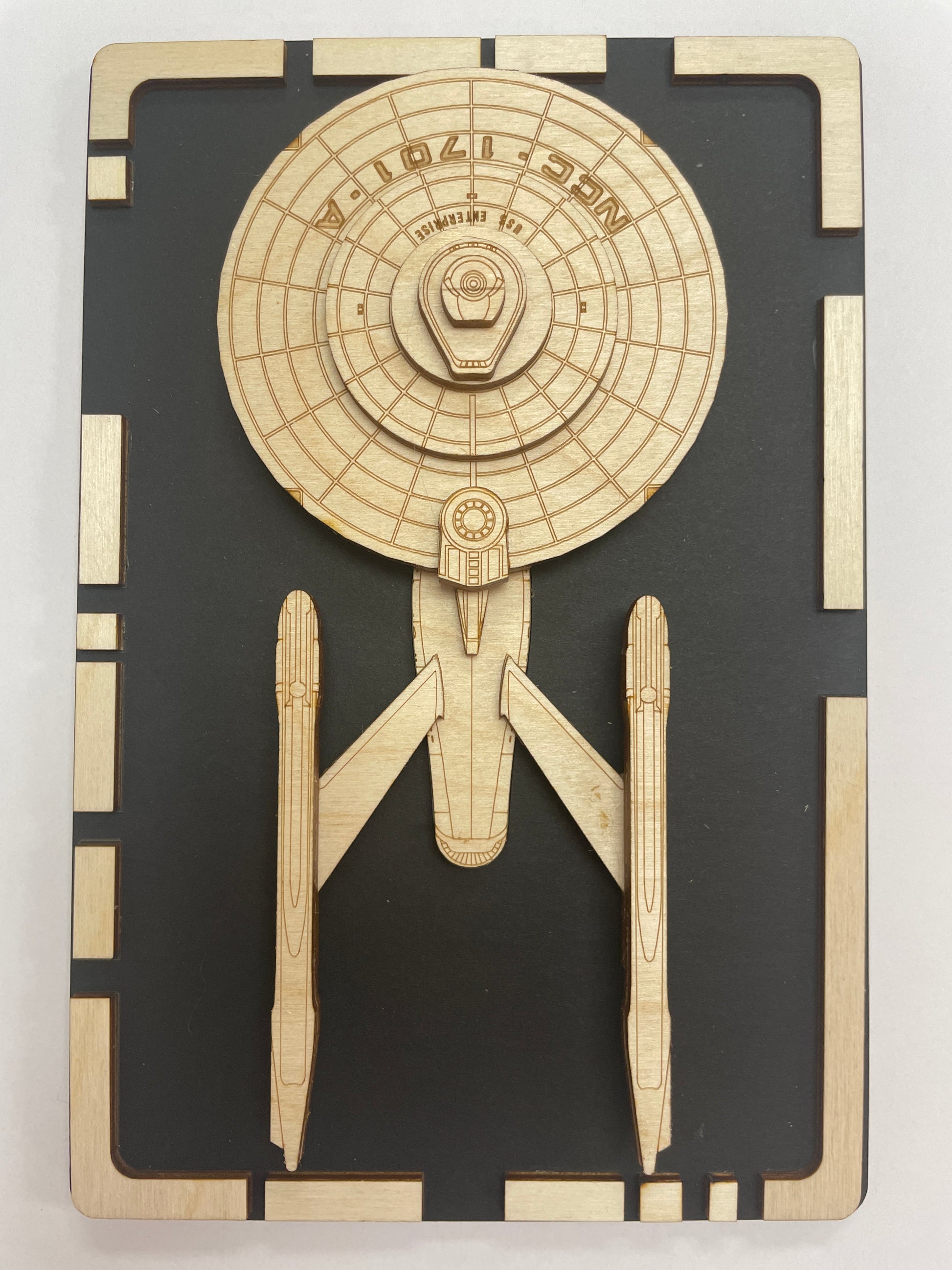 Wood pop art starship plaque of the USS ENTERPRISE NCC-1701-A (CONSTITUTION CLASS REFIT). Built from layers of durable plywood giving the model a three dimensional effect. A sheet of black museum board makes the starship’s details pop. An LCARS style border frames the models. Put it on your desk, display rack or bookshelf. A great display item for that Trekkie in your life.