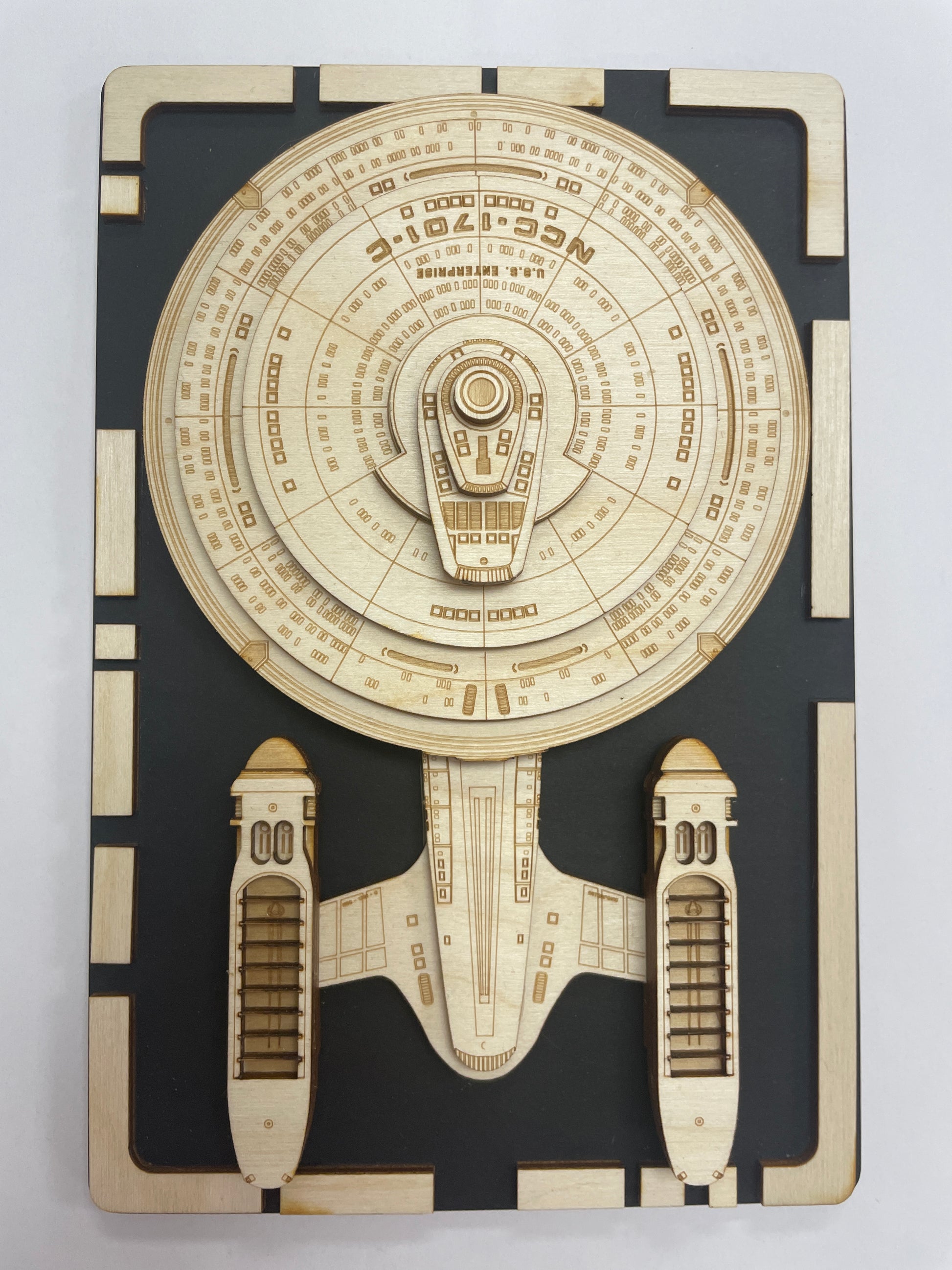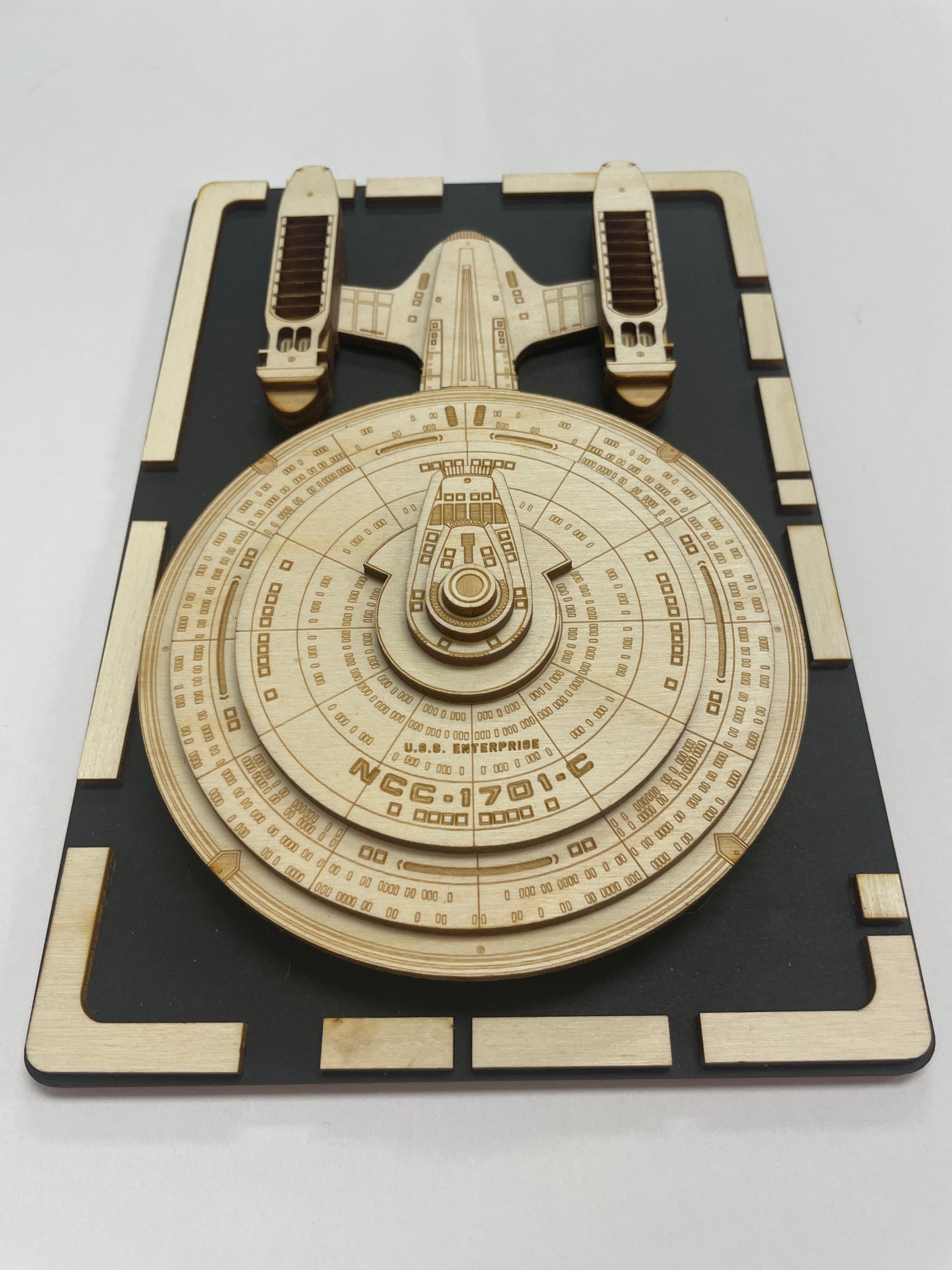 Wood pop art starship plaque of the USS ENTERPRISE NCC-1701-C (AMBASADOR CLASS). Built from layers of durable plywood giving the model a three dimensional effect. A sheet of black museum board makes the starship’s details pop. An LCARS style border frames the models. Put it on your desk, display rack or bookshelf. A great display item for that Trekkie in your life.