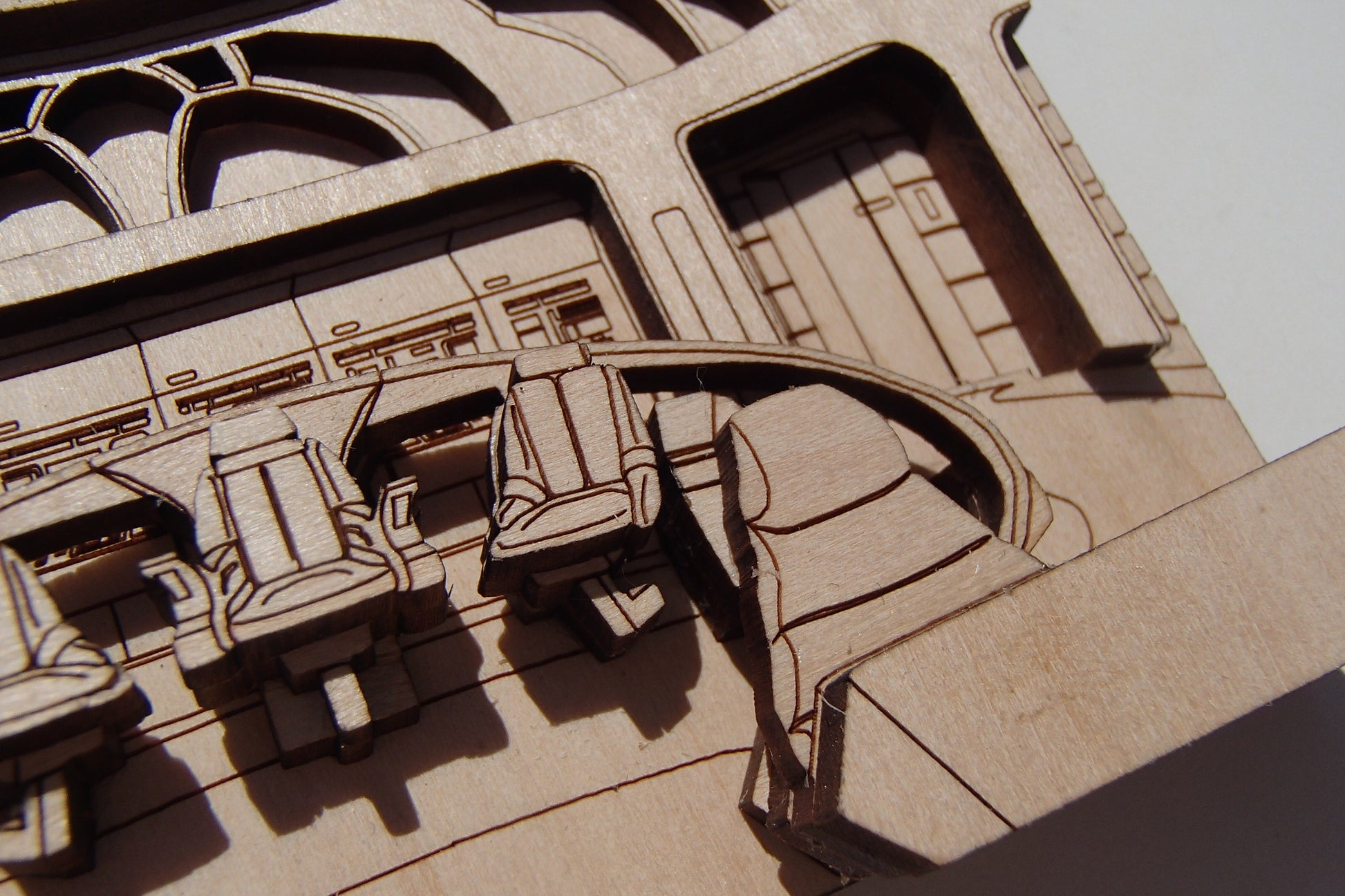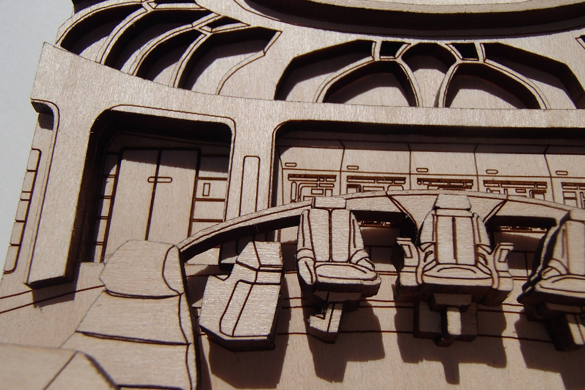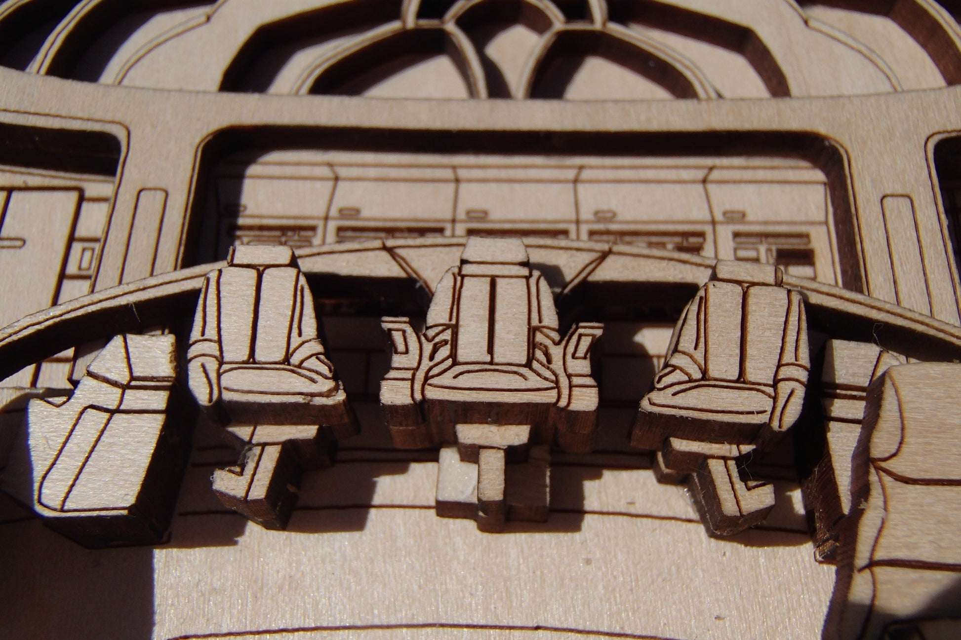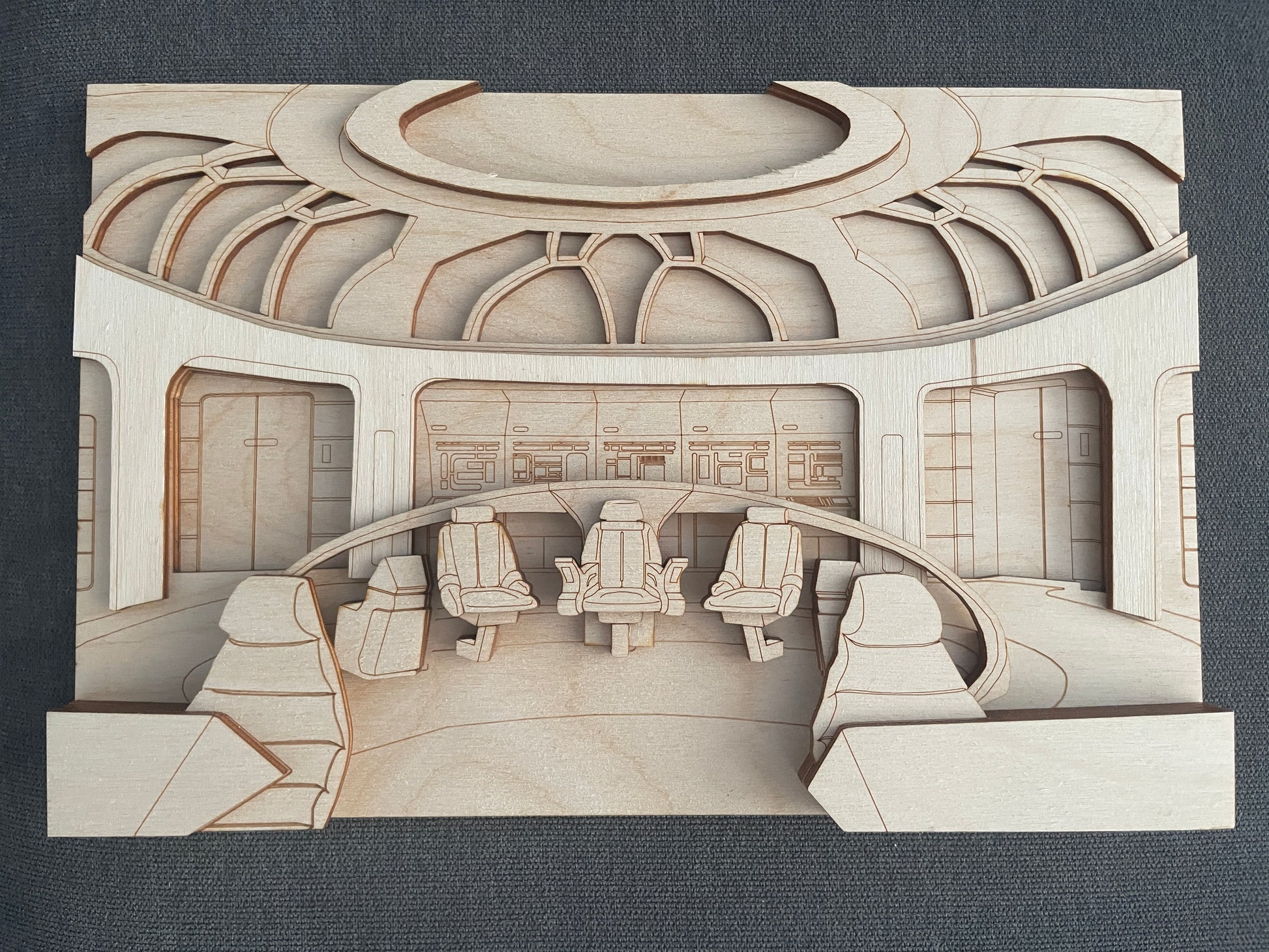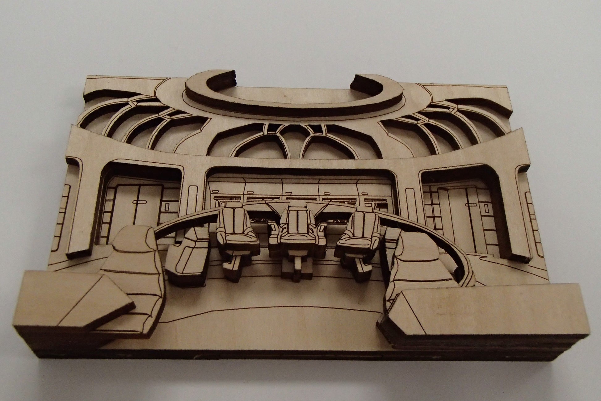 A wonderful laser cut model of the ENTERPRISE D BRIDGE! Boldly Go with Captain Picard with this model. A unique piece that would stand out in any Trek display. Laser cut from durable plywood sheets and layered to produce a three dimensional effect. Each model is hand assembled by me with all the love of a lifelong Trekkie.