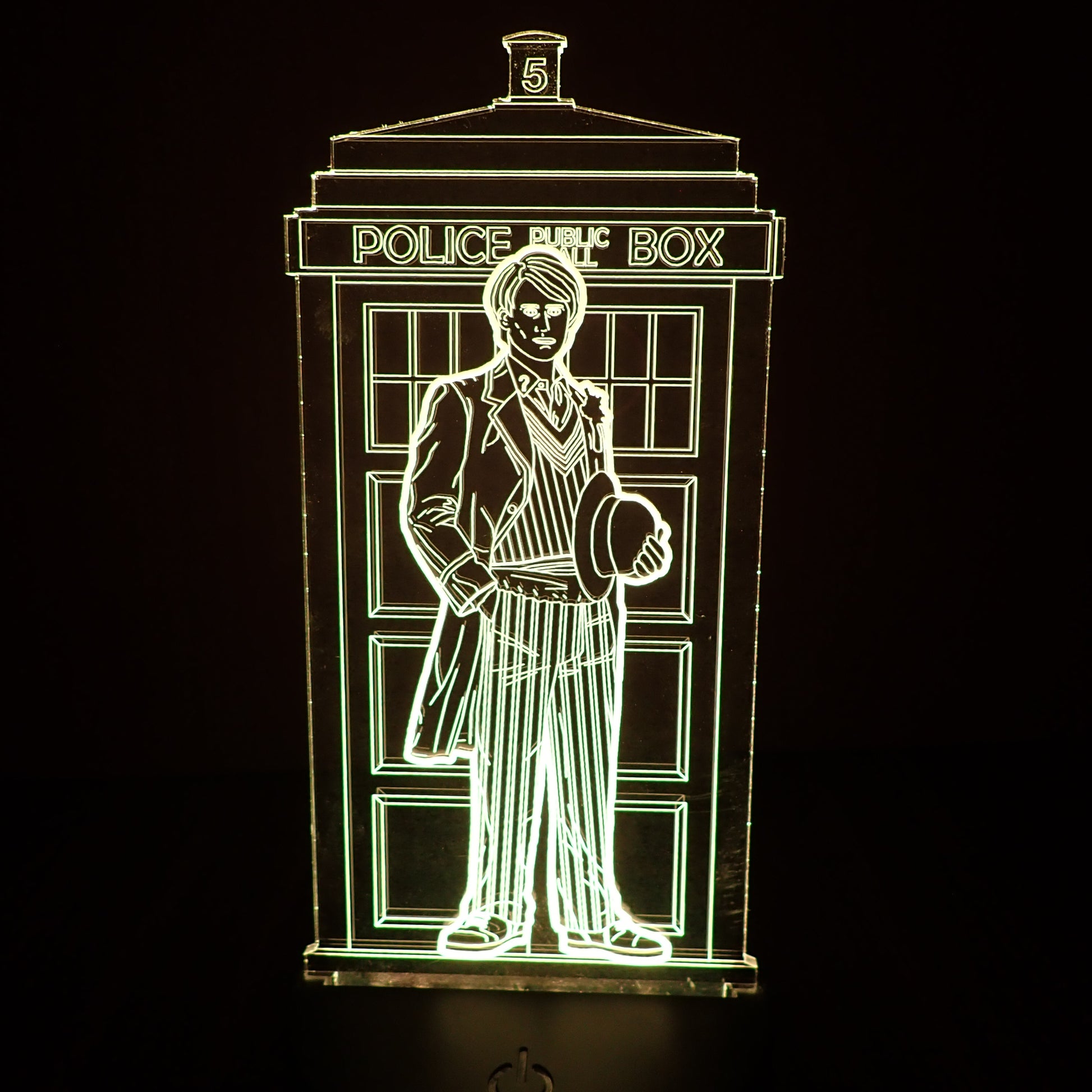 Etched acrylic LED plate of the FIFTH DOCTOR with the TARDIS in the background. Each model comes with their own mutli-color changing LED light base. Colors include, Red, Yellow, Green, Blue, Magenta, Cyan, Orange and White. The base is either USB powered or battery powered (batteries not included). A great display item for that Whovian in your life. Put it on your desk, display rack or bookshelf. It even can be used as a night light!