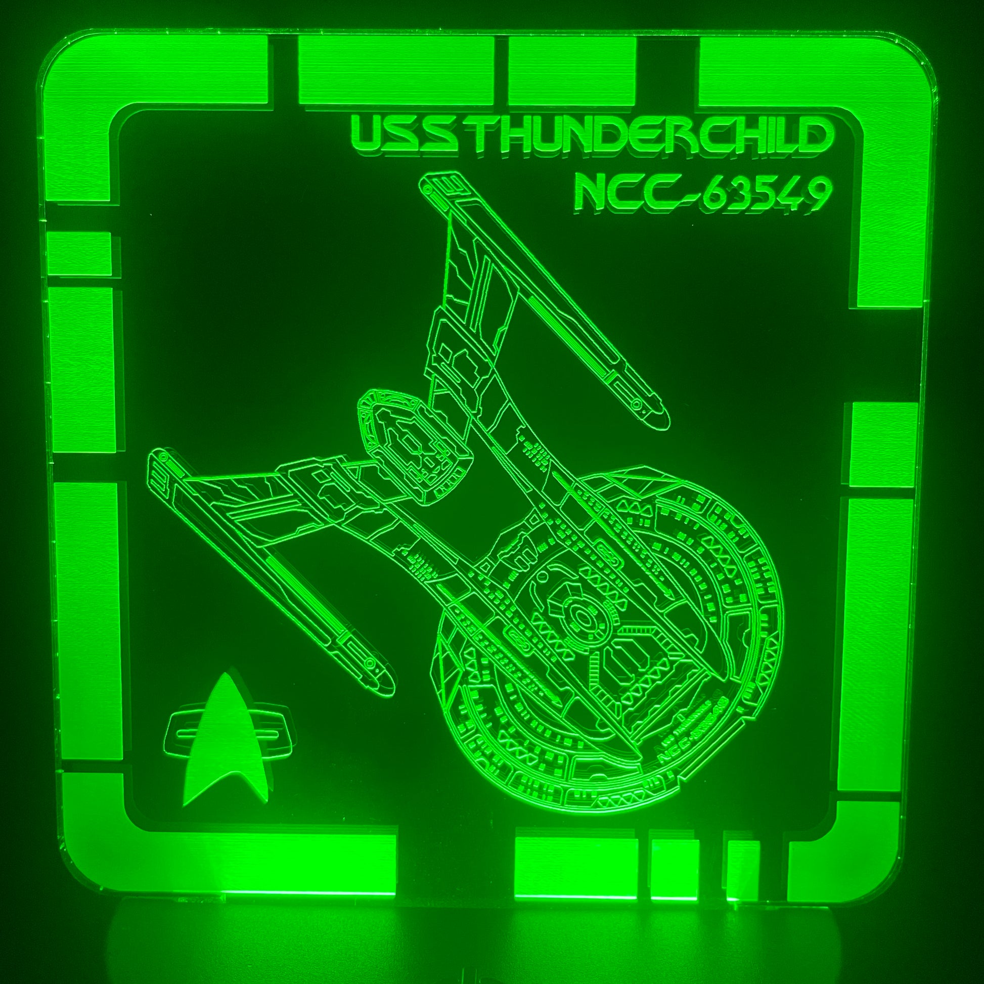 Etched acrylic starship plaque of the AKRIA CLASS STARSHIP with an LCARS style border. Each model comes with their own mutli-color changing LED light base. Colors include, Red, Yellow, Green, Blue, Magenta, Cyan, Orange and White. The base is either USB powered or battery powered (batteries not included). A great display item for that Trekkie in your life. Put it on your desk, display rack or bookshelf. It even can be used as a night light!