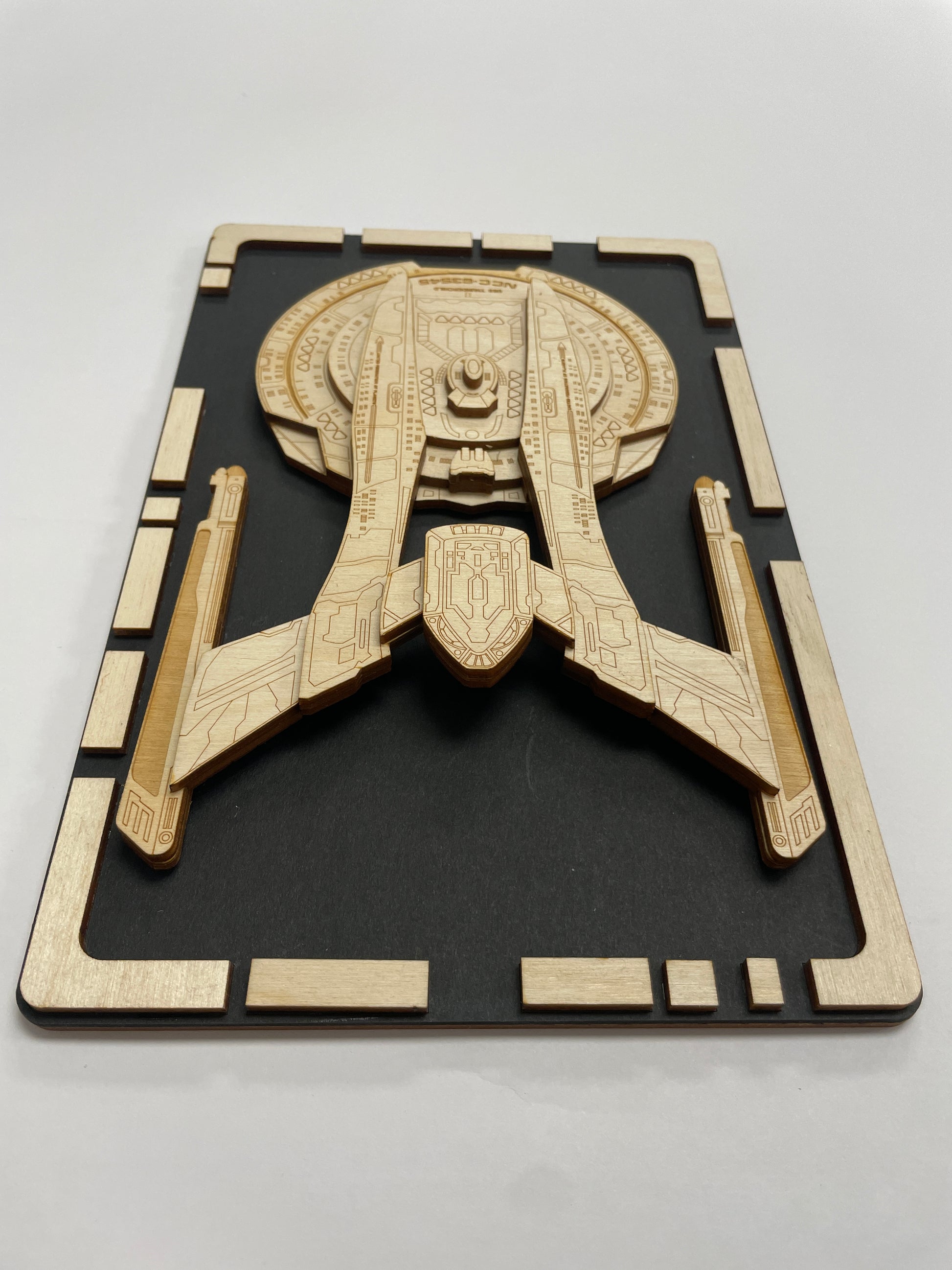 Wood pop art starship plaque of the AKIRA CLASS. Built from layers of durable plywood giving the model a three dimensional effect. A sheet of black museum board makes the starship’s details pop. An LCARS style border frames the models. Put it on your desk, display rack or bookshelf. A great display item for that Trekkie in your life.