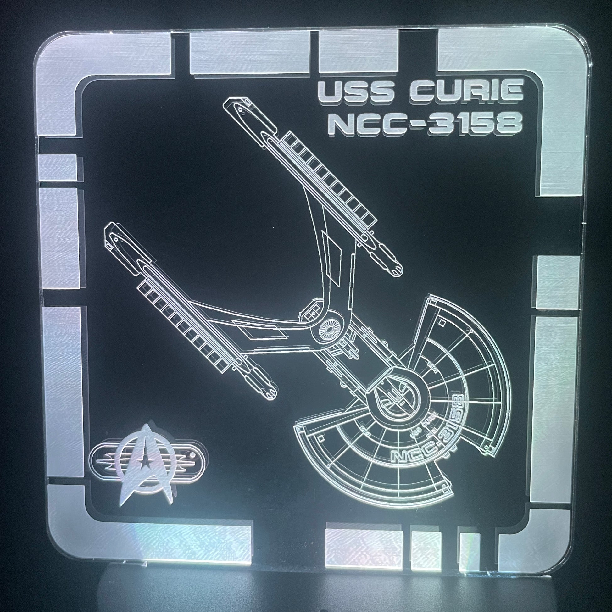 Etched acrylic starship plaque of the AKYAZI CLASS STARSHIP with an LCARS style border. Each model comes with their own mutli-color changing LED light base. Colors include, Red, Yellow, Green, Blue, Magenta, Cyan, Orange and White. The base is either USB powered or battery powered (batteries not included). A great display item for that Trekkie in your life. Put it on your desk, display rack or bookshelf. It even can be used as a night light!