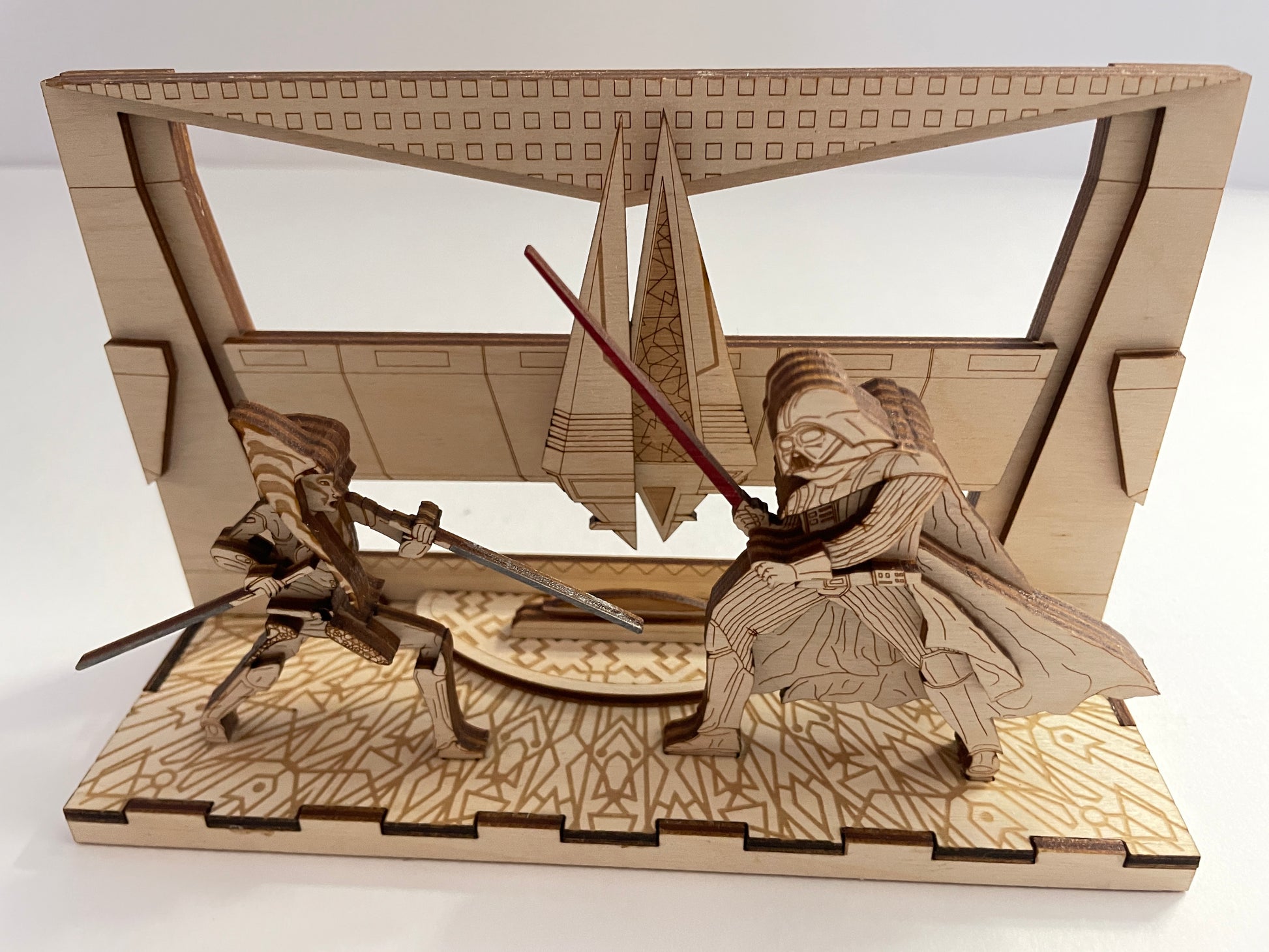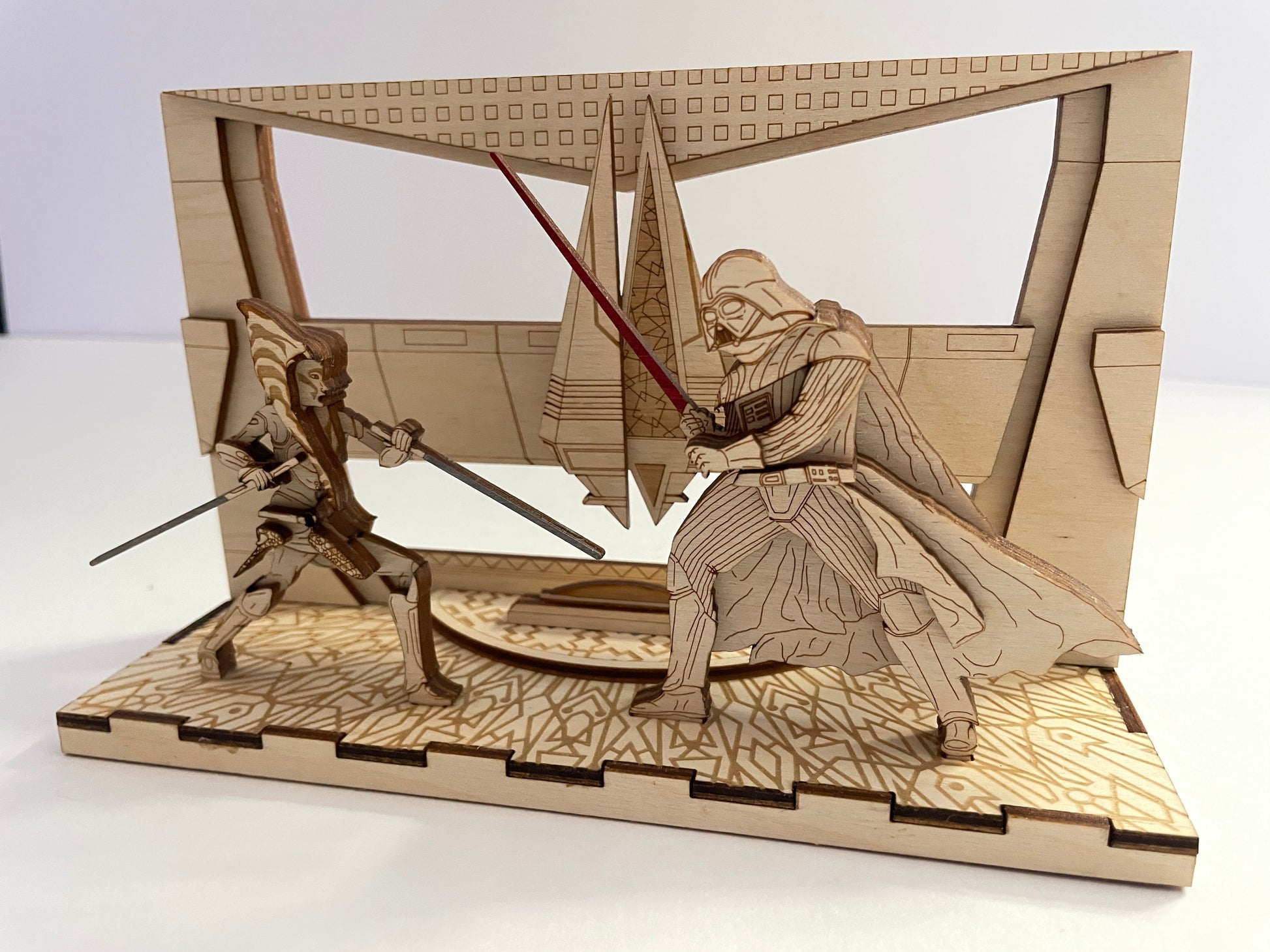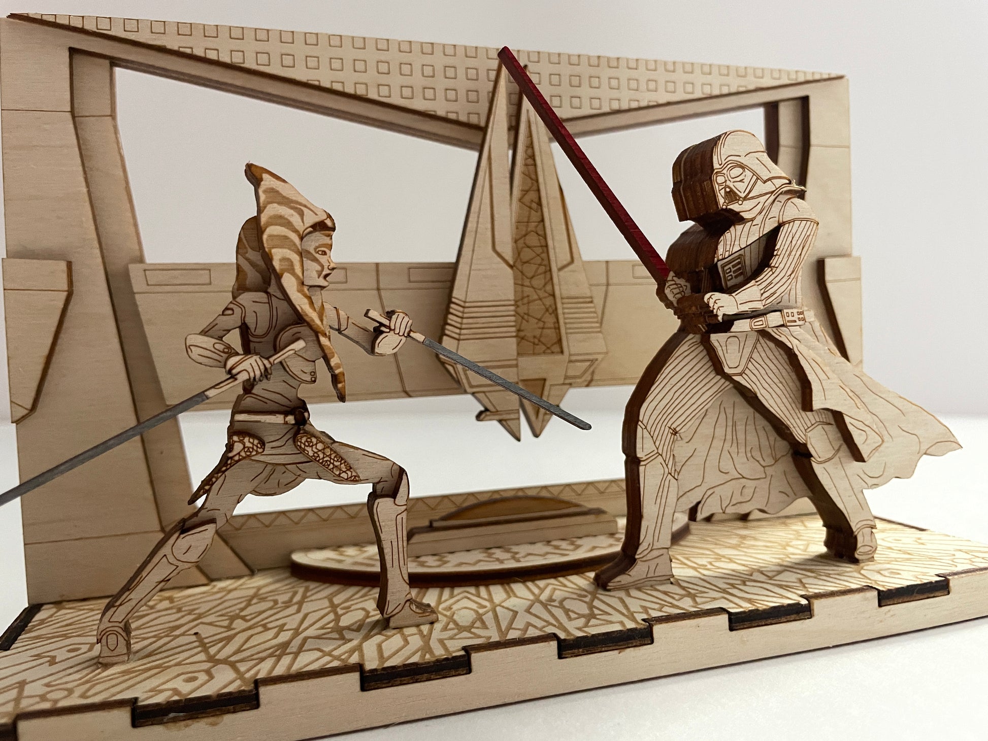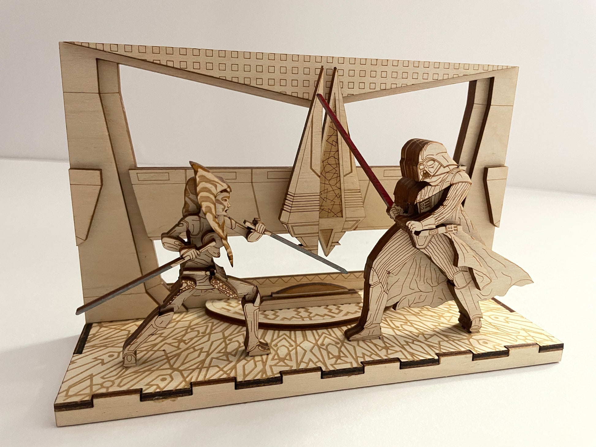 Pop art wood model of Ahsoka Tano dueling Darth Vader in a Sith Temple. Built from durable layers of plywood to create a three dimensional effect. A perfect model for your Star Wars fan in your life. It can sit on a desk, a shelf, inside a display case. This model is a great addition to your Star Wars collection. Own this one of a kind product showing off one of the iconic scenes of the franchise.
