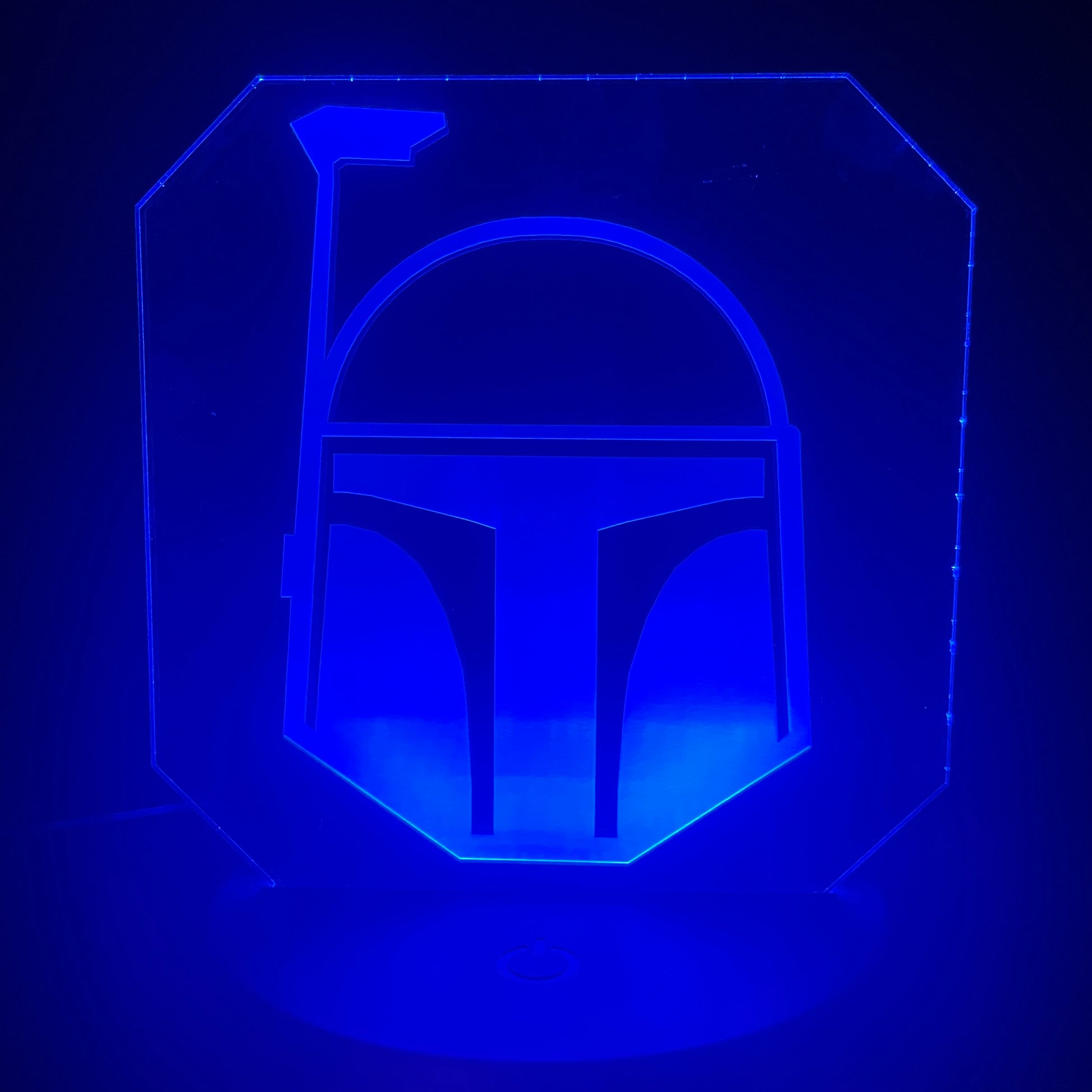Etched acrylic plate of BOBA FETT’S HELMET. Each model comes with their own mutli-color changing LED light base. Colors include, Red, Yellow, Green, Blue, Magenta, Cyan, Orange and White. The base is either USB powered or battery powered (batteries not included). A great display item for that Star Wars fan in your life. Put it on your desk, display rack or bookshelf. It even can be used as a night light!