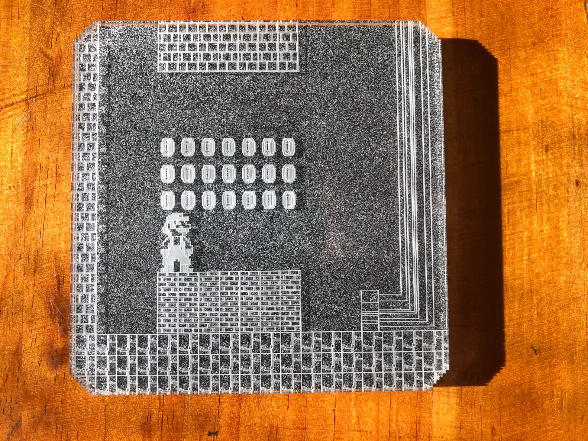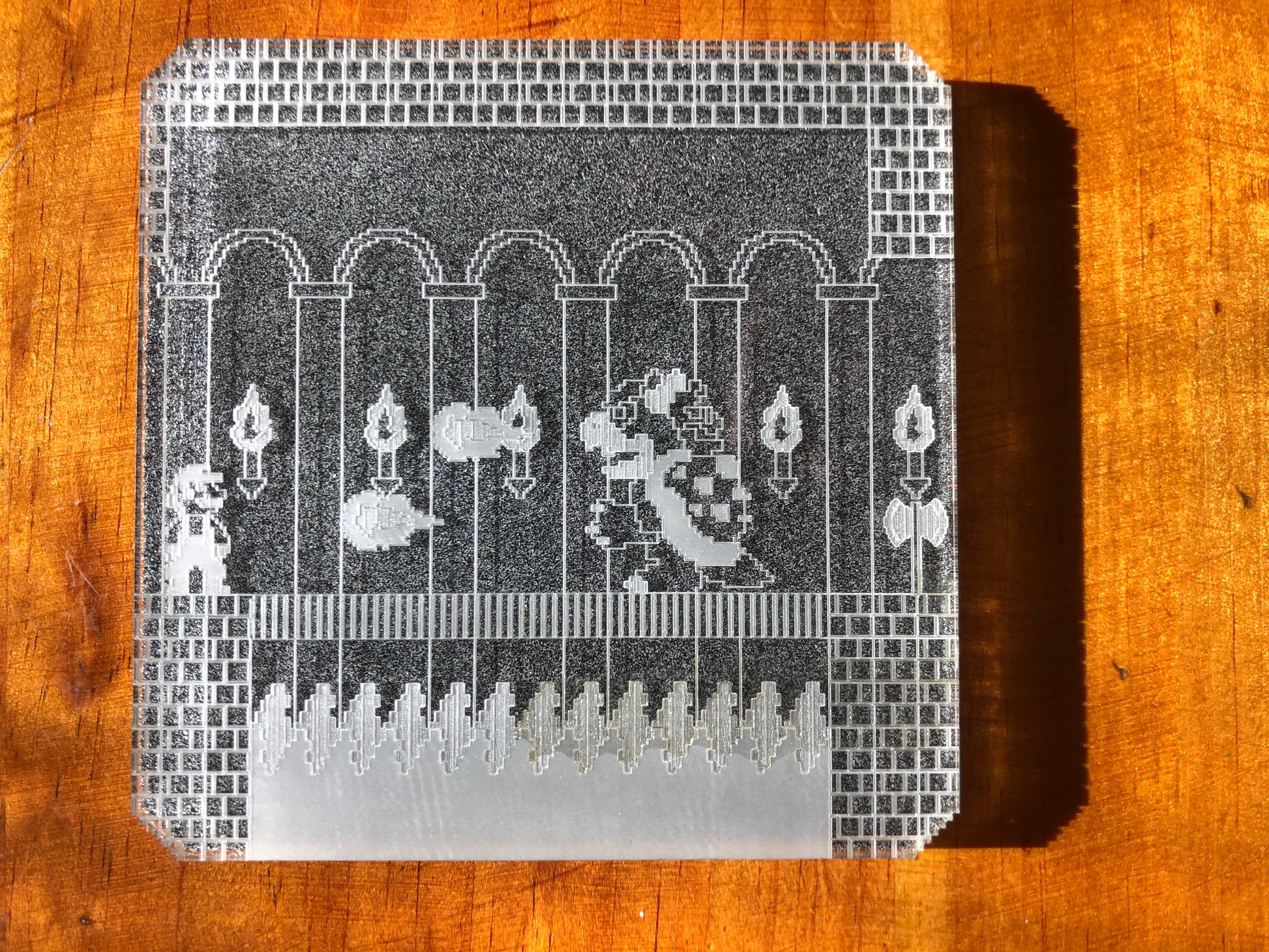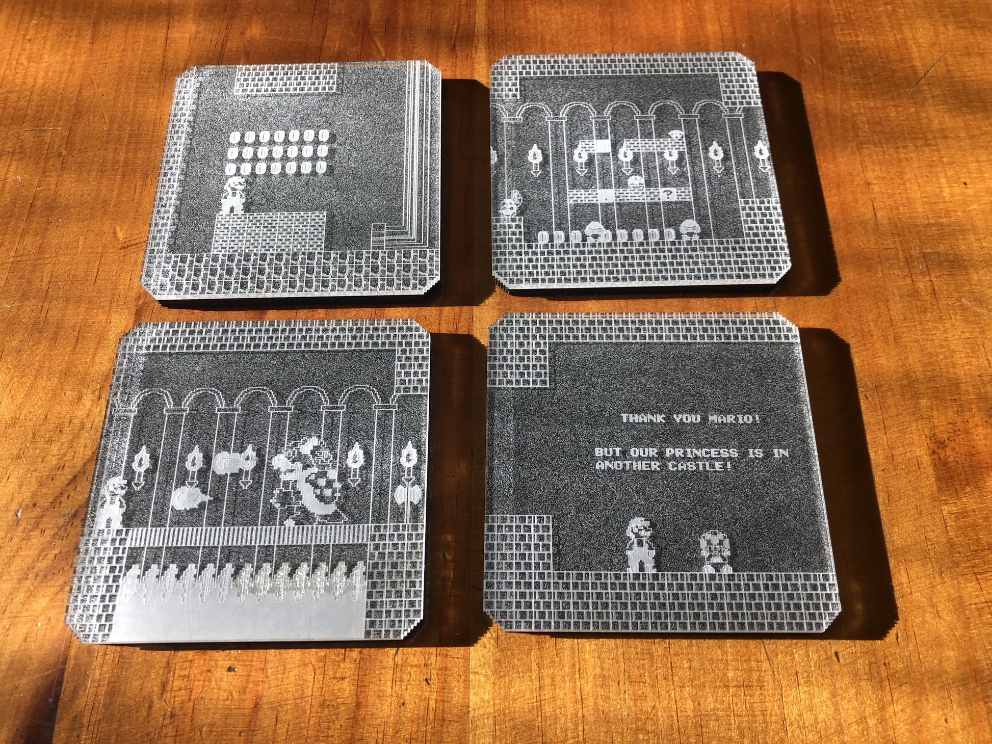A wonderful set of Acrylic Mario coasters depicting inspired designs of a dungeon level and battling Bowsers in a platform game setting. This set includes four coasters per set. Each coaster is made from 1/8" thick durable clear acrylic sheets with a felt backer to prevent slipping/scratching.