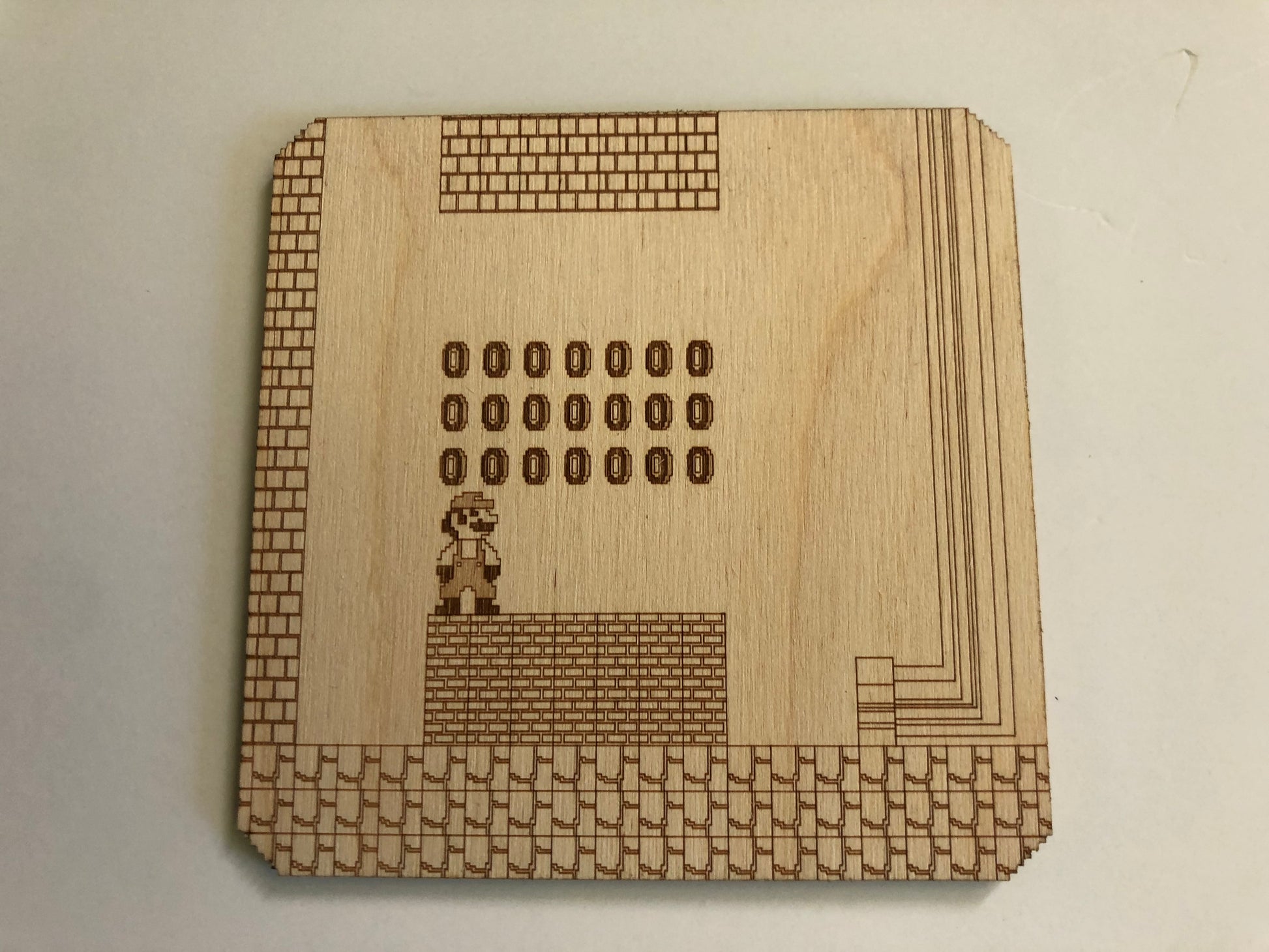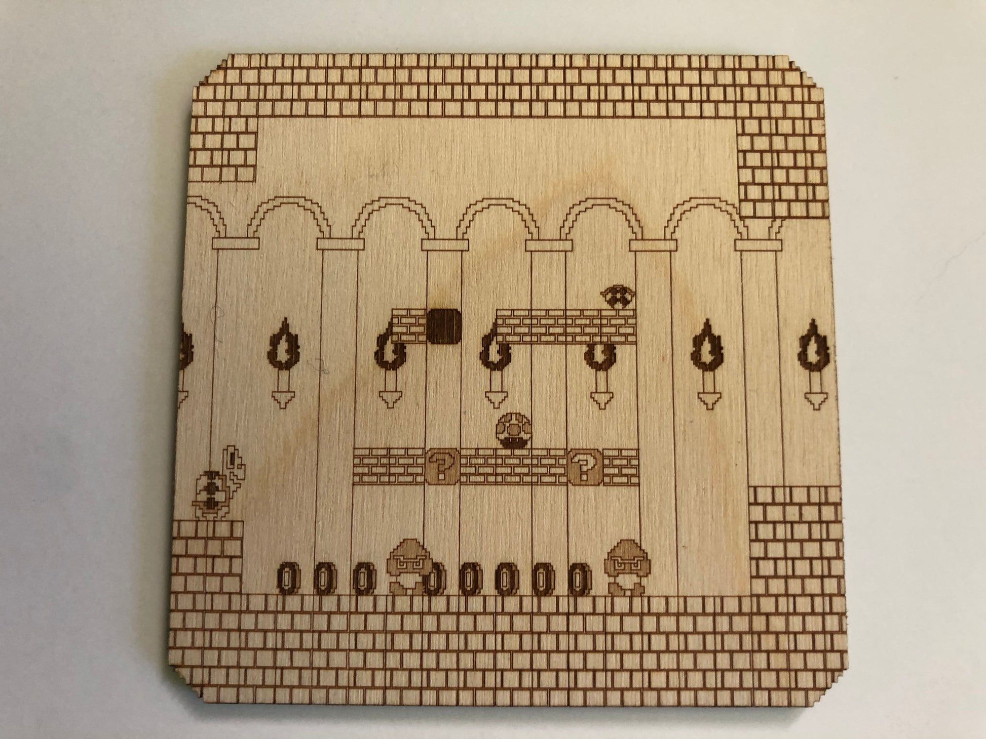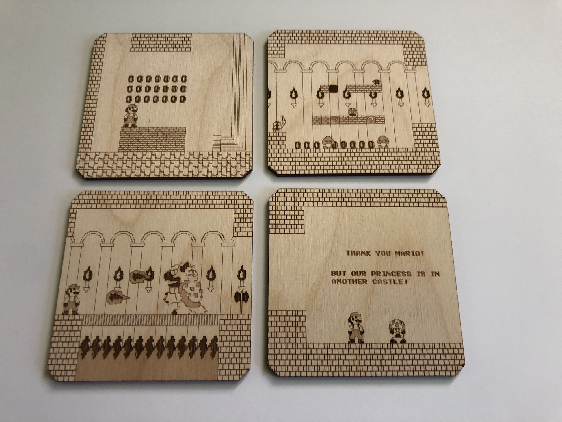 A wonderful set of wood Mario coasters depicting inspired designs of a dungeon level and battling Bowsers in a platform game setting. This set includes four coasters per set. Each coaster is made from 1/8" thick durable plywood.