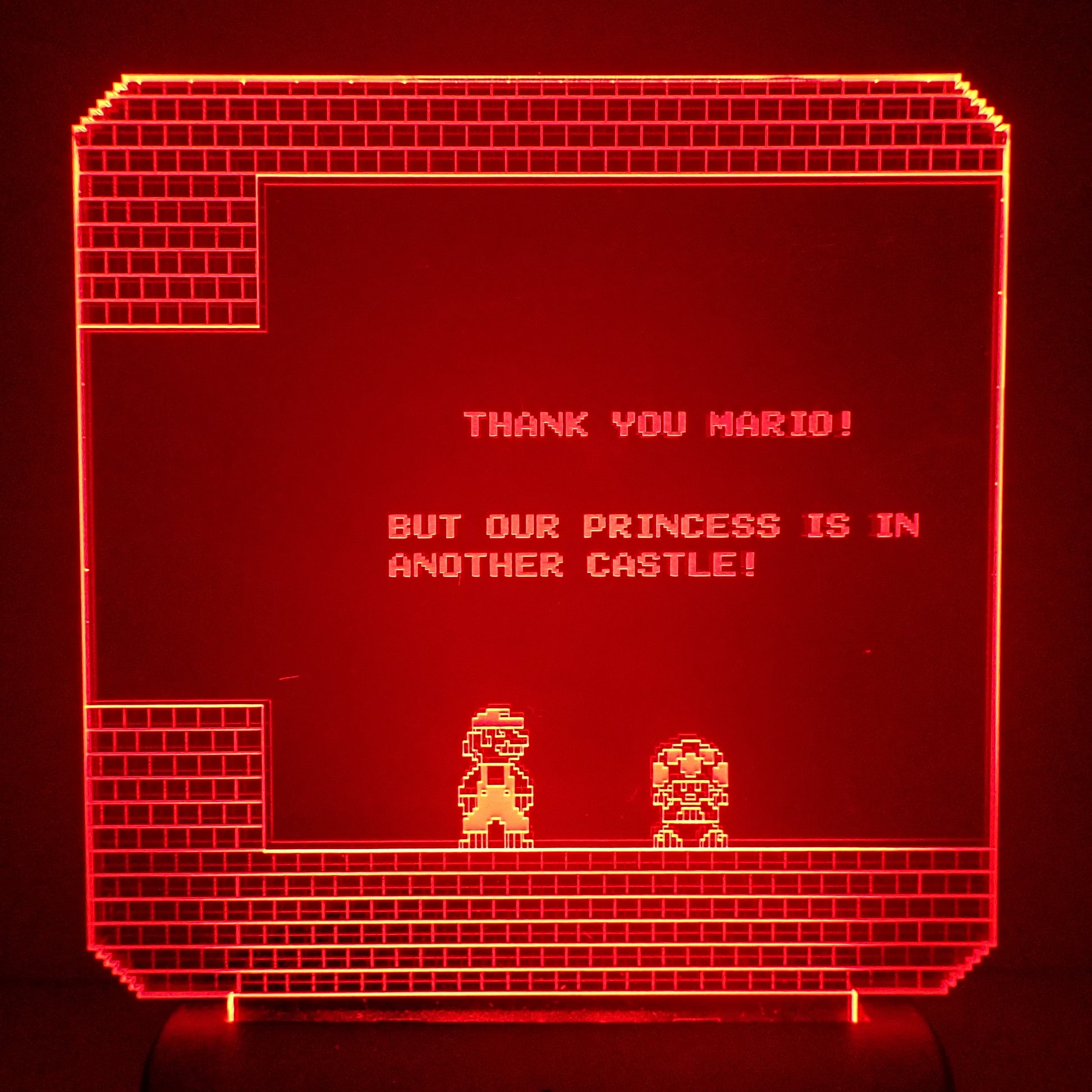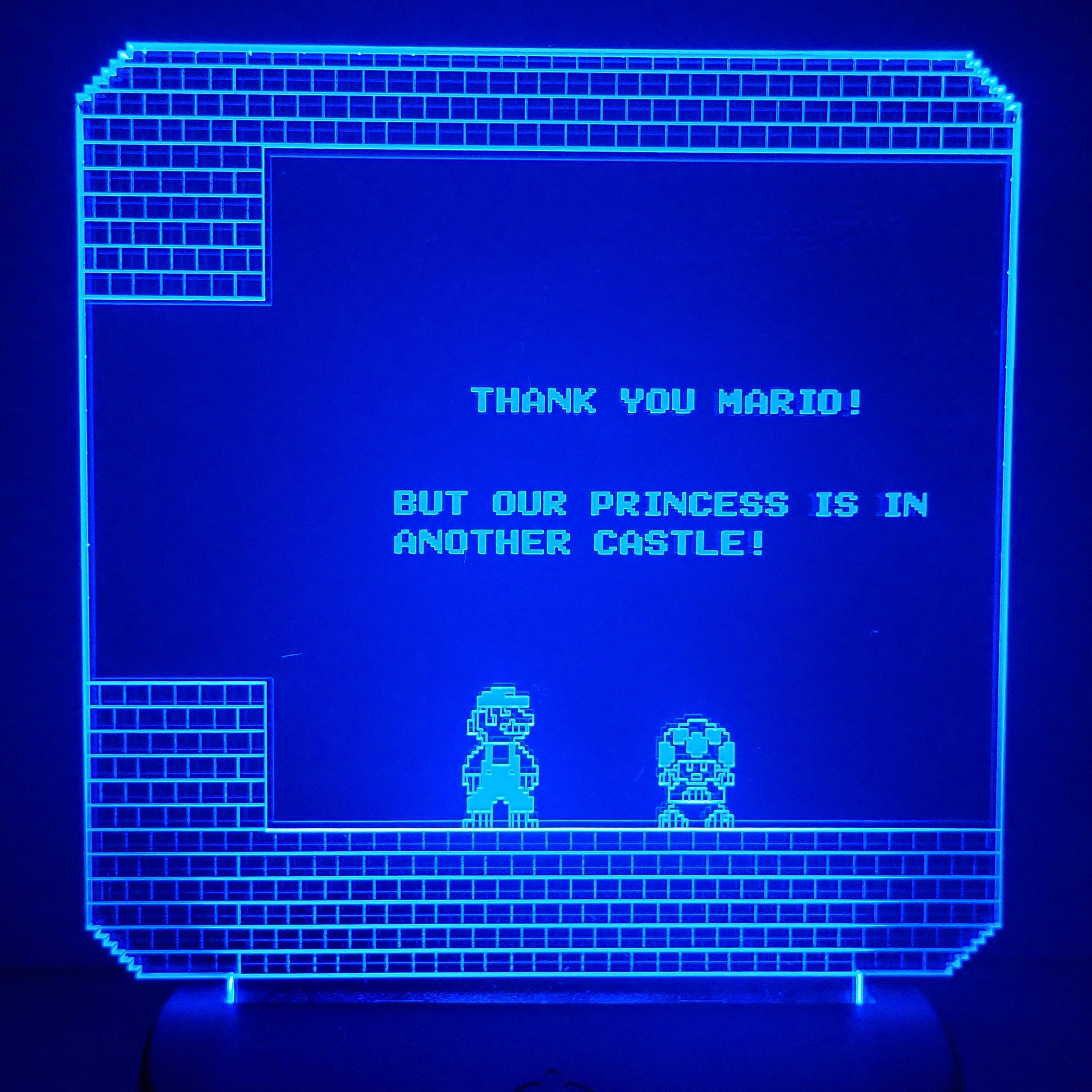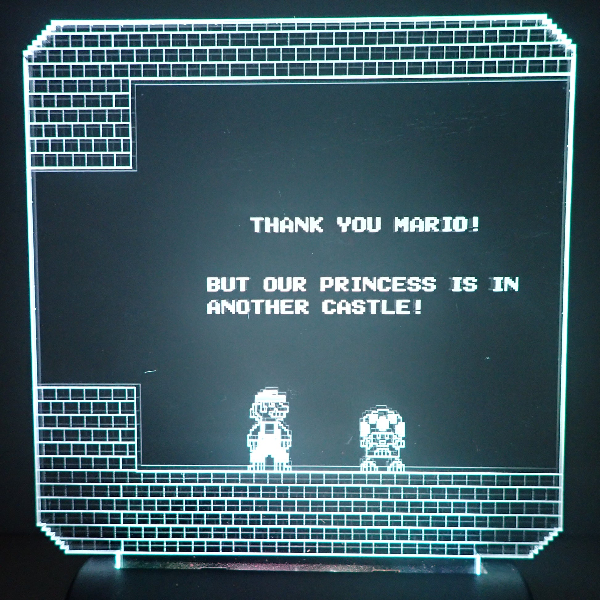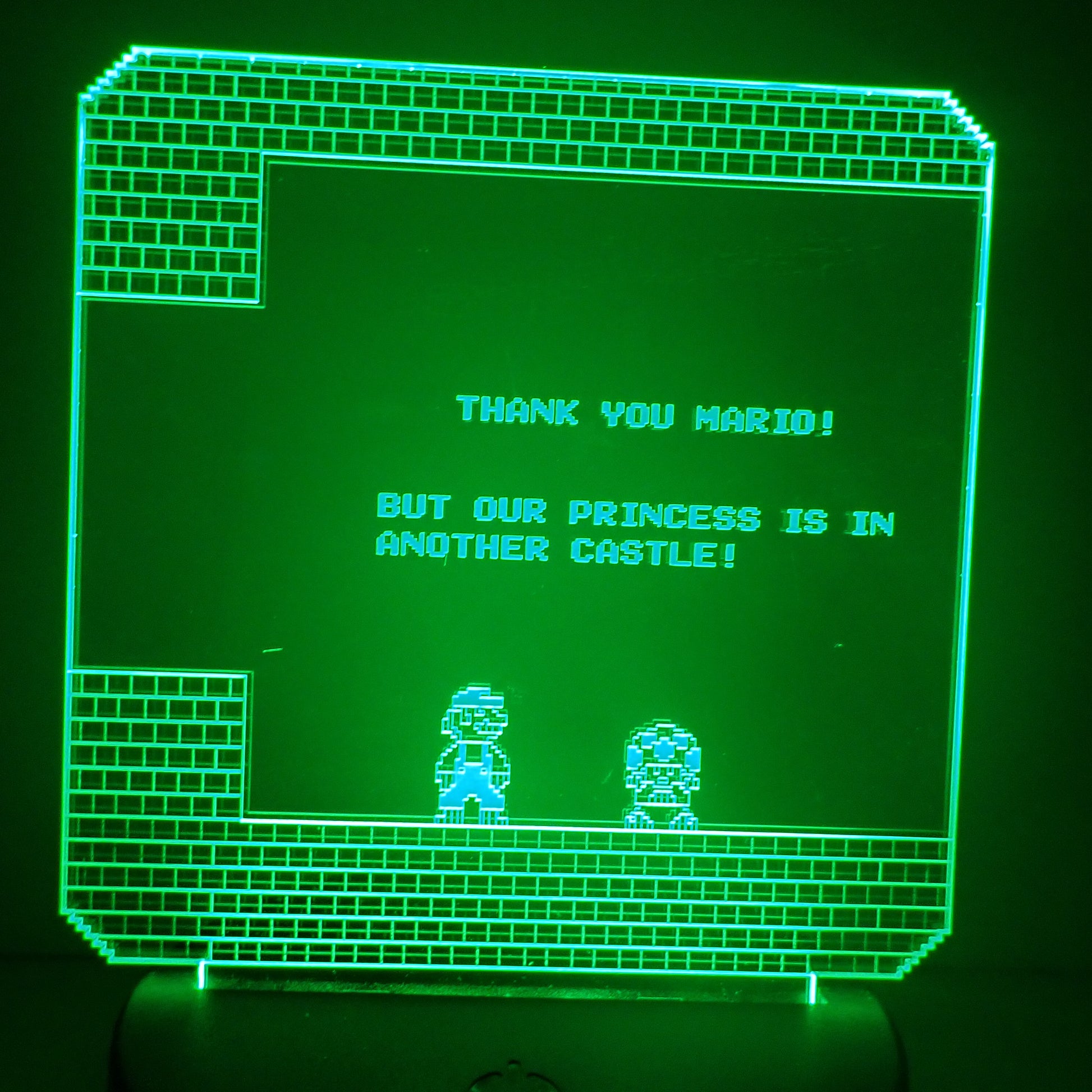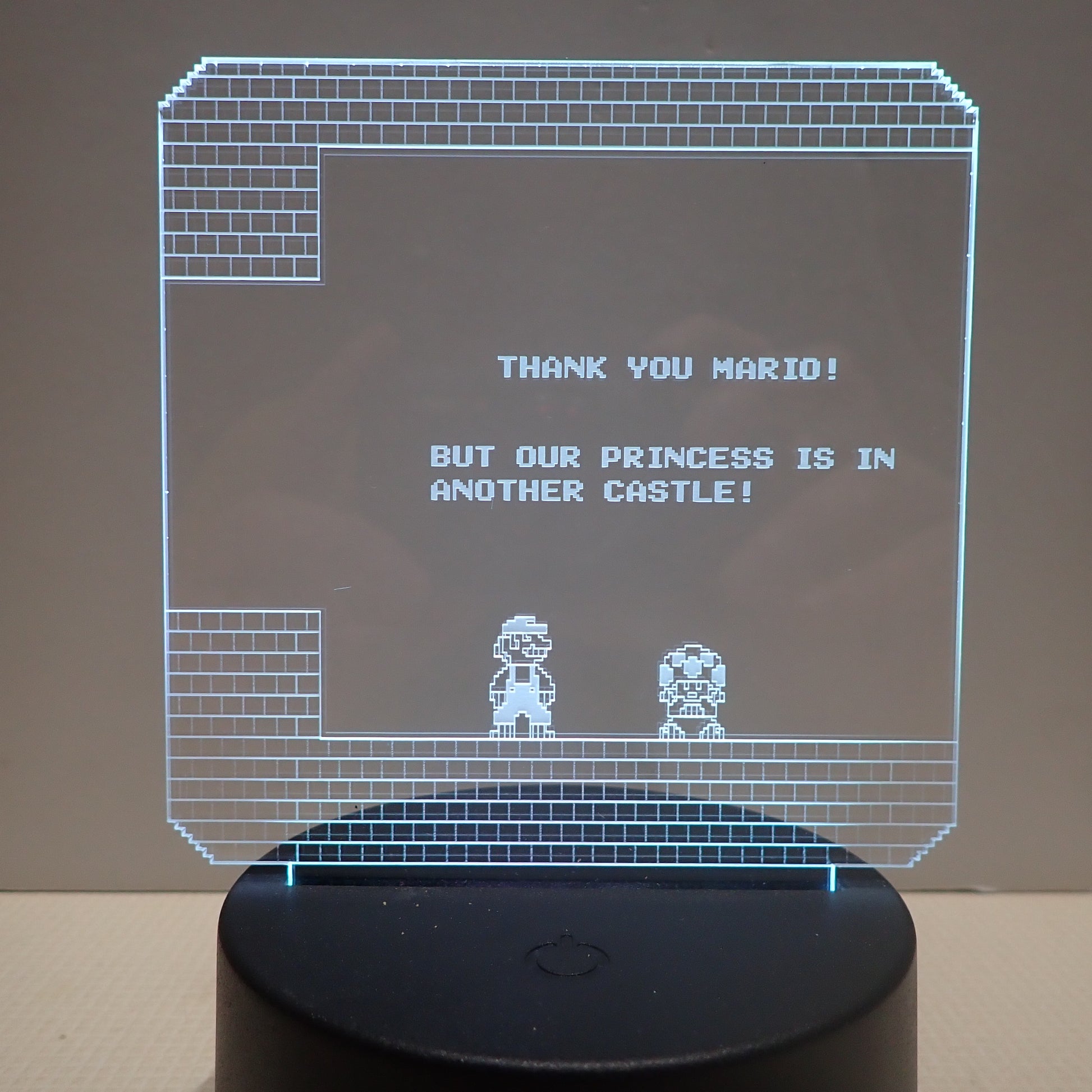 Etched acrylic plate of the SUPER MARO DUNGEON LEVEL. Each model comes with their own mutli-color changing LED light base. Colors include, Red, Yellow, Green, Blue, Magenta, Cyan, Orange and White. The base is either USB powered or battery powered (batteries not included). A great display item for that Mario fan in your life. Put it on your desk, display rack or bookshelf. It even can be used as a night light!