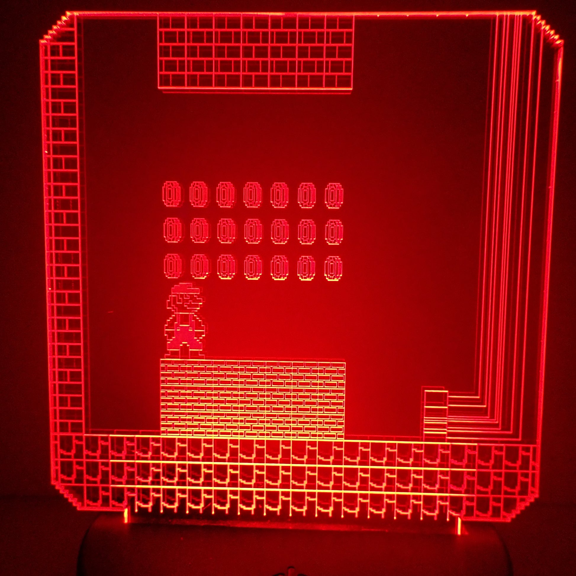 Etched acrylic plate of the SUPER MARO DUNGEON LEVEL. Each model comes with their own mutli-color changing LED light base. Colors include, Red, Yellow, Green, Blue, Magenta, Cyan, Orange and White. The base is either USB powered or battery powered (batteries not included). A great display item for that Mario fan in your life. Put it on your desk, display rack or bookshelf. It even can be used as a night light!