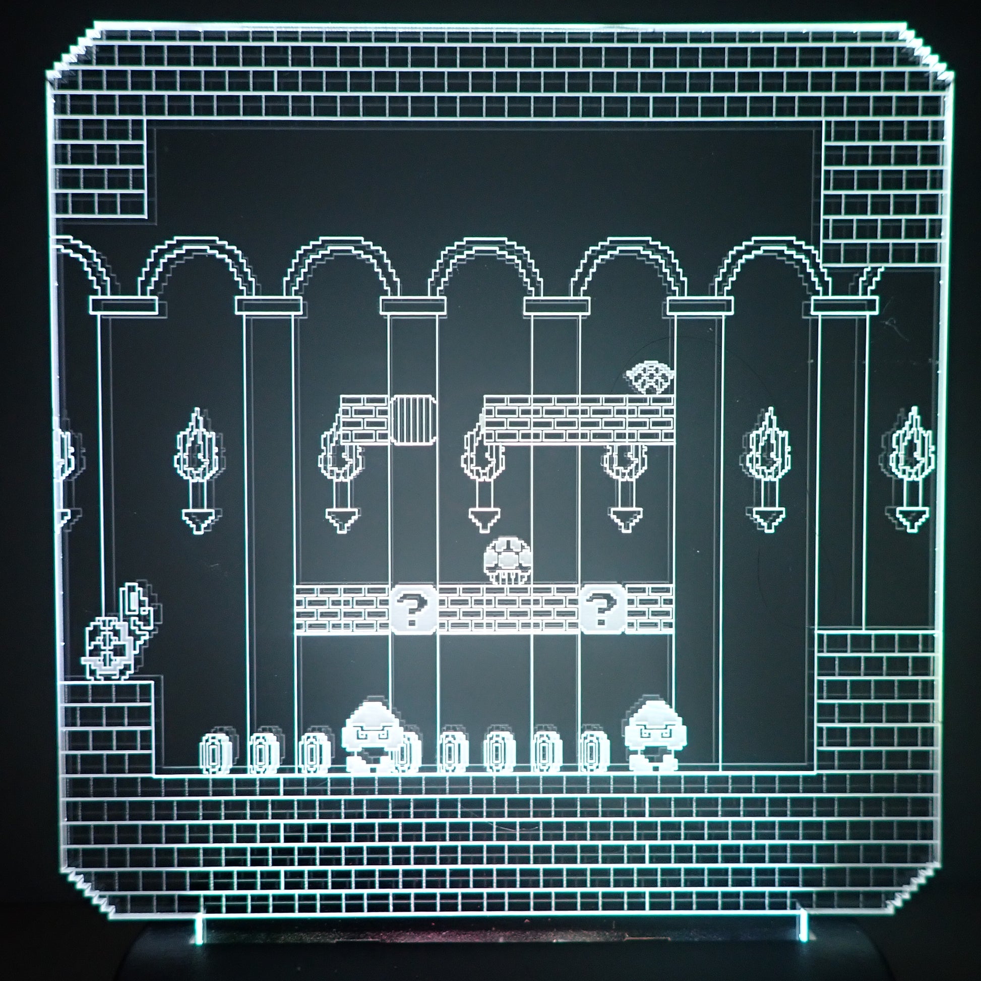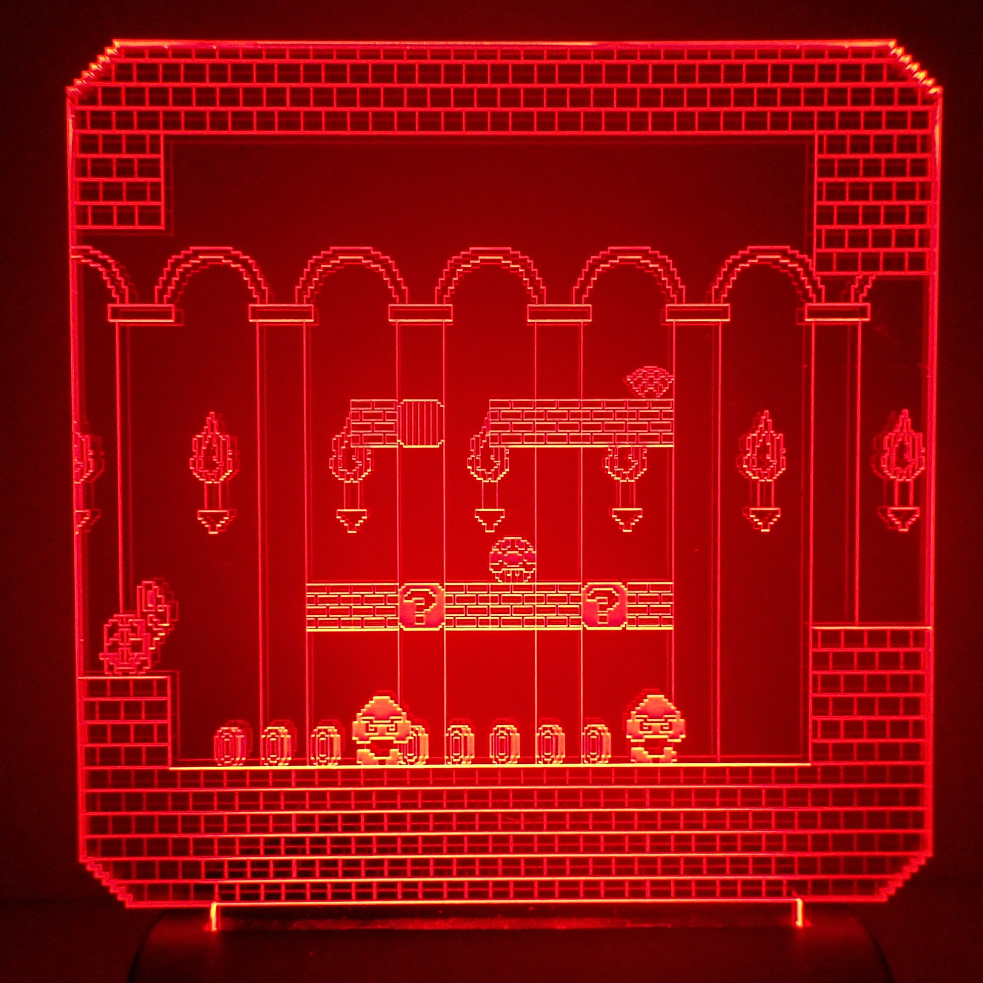 Etched acrylic plate of the SUPER MARO DUNGEON LEVEL. Each model comes with their own mutli-color changing LED light base. Colors include, Red, Yellow, Green, Blue, Magenta, Cyan, Orange and White. The base is either USB powered or battery powered (batteries not included). A great display item for that Mario fan in your life. Put it on your desk, display rack or bookshelf. It even can be used as a night light!