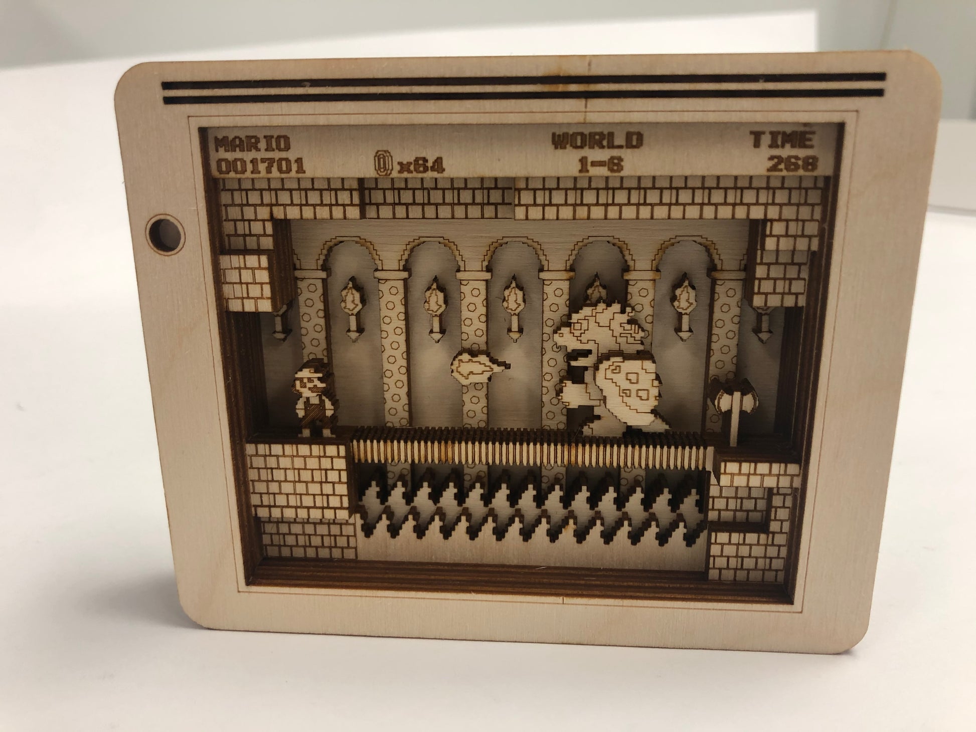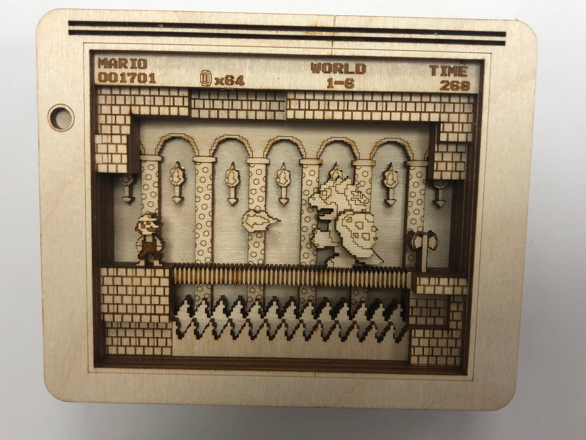 This Super Mario Brothers inspired wood pop art model has Mario battling Bowser in the dungeon to save the Princess. Too bad she is in another castle! This lovely screencap built into its own Gameboy style shadow box brings the action back to life. This model is built from durable layers of plywood and hand assembled! A perfect piece of décor for any gamer's shelf, desk or wall!