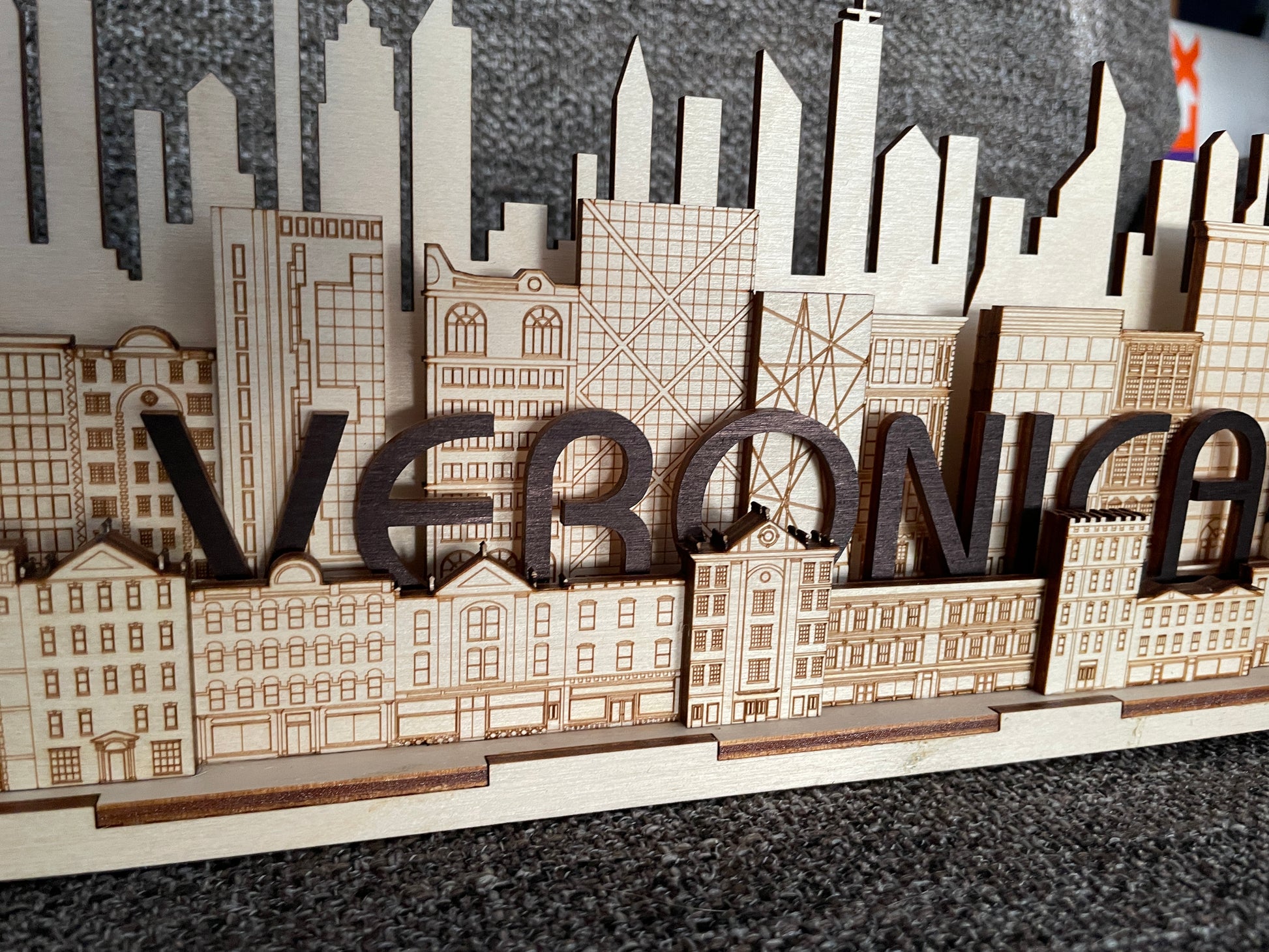 A multi layered 3D wood art model of an idealized cityscape skyline. The depth of the model comes from the different heights and types of buildings. Built from layers of plywood sheets and hand assembled. You have the option to customize the model by adding a name into the skyline. A great gift for the one in your life who likes to travel or architecture!