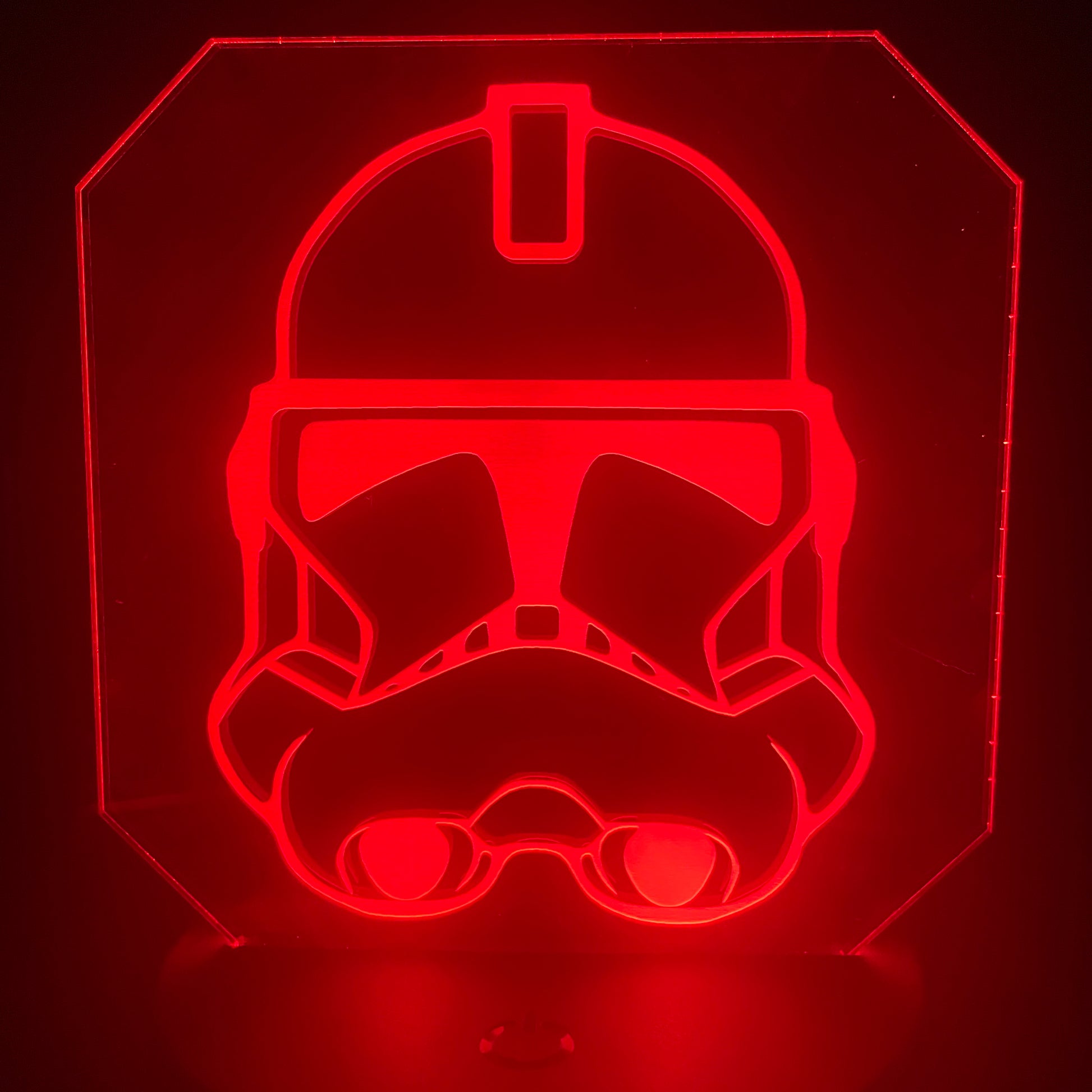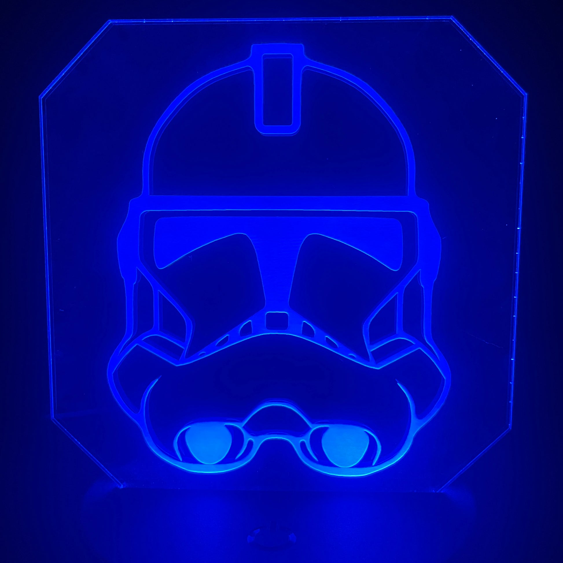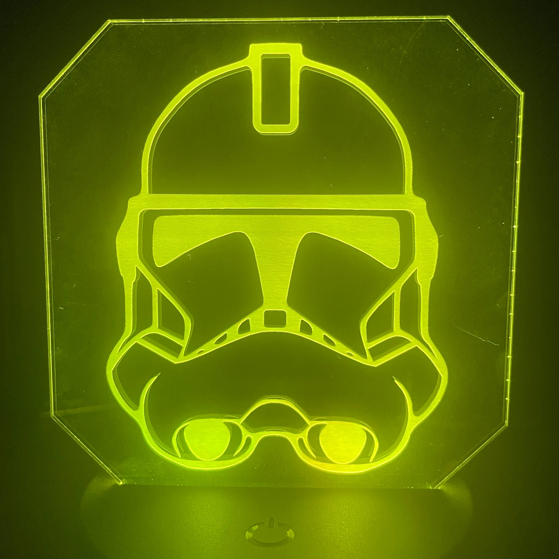 Etched acrylic plate of A CLONE TROOPER VERSION 2 HELMET. Each model comes with their own mutli-color changing LED light base. Colors include, Red, Yellow, Green, Blue, Magenta, Cyan, Orange and White. The base is either USB powered or battery powered (batteries not included). A great display item for that Star Wars fan in your life. Put it on your desk, display rack or bookshelf. It even can be used as a night light!