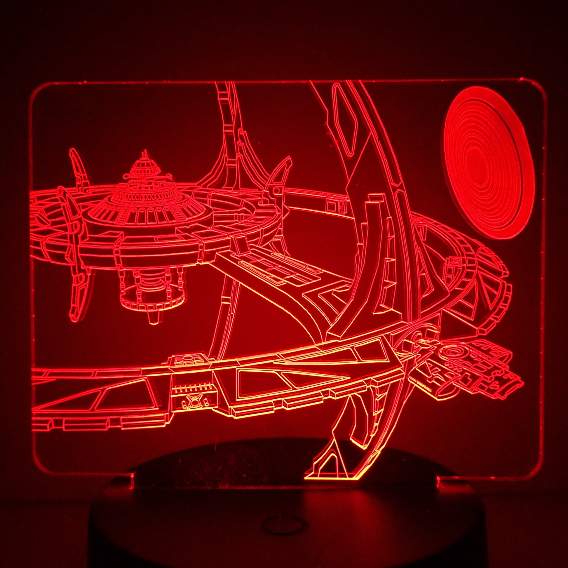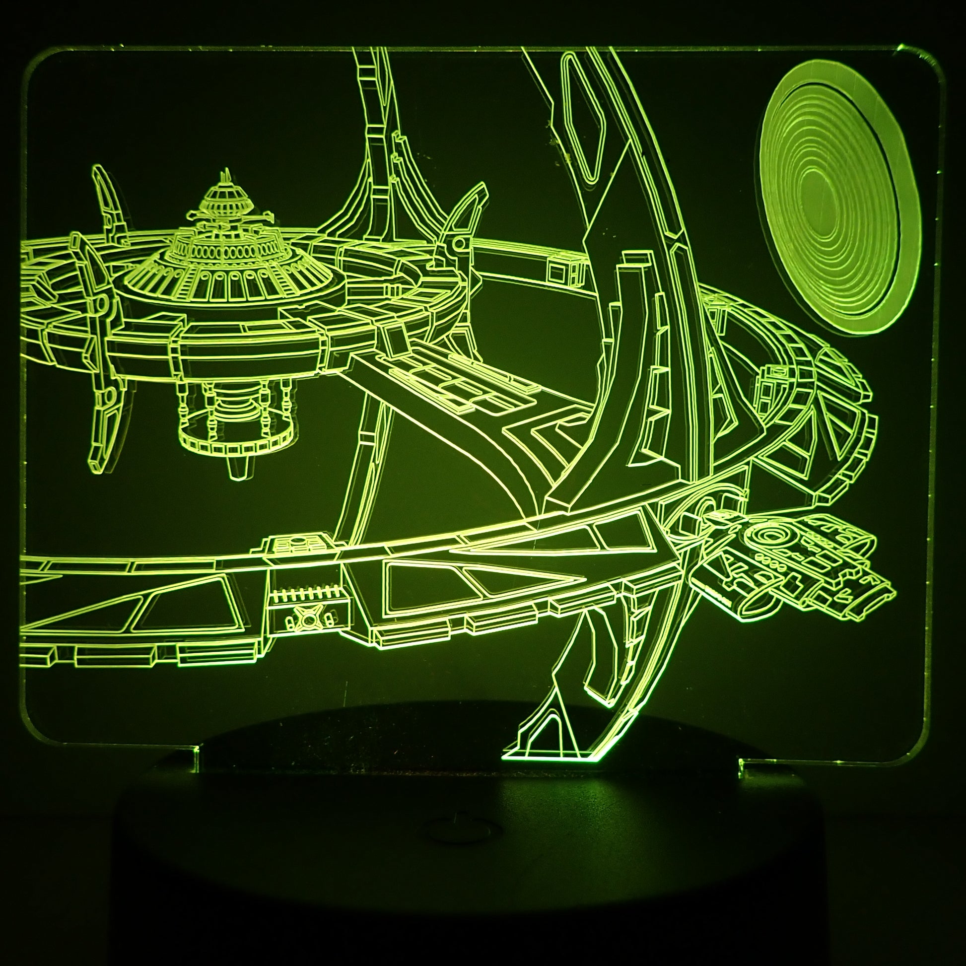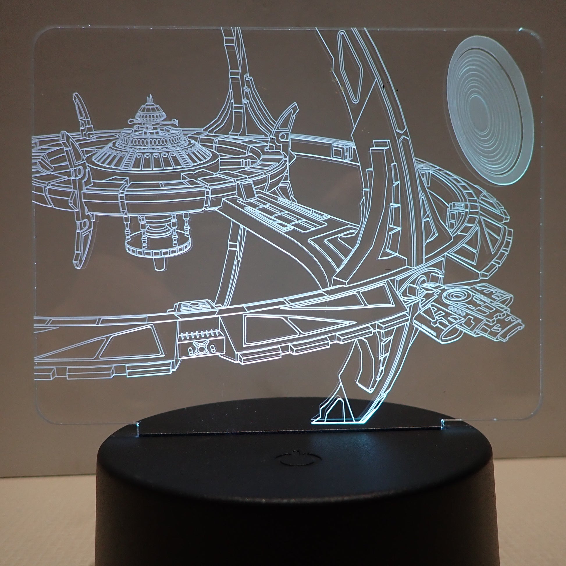 Etched acrylic display plate of the DEEP SPACE NINE with the USS Defiant overlooking the Bajorian Wormhole. The Defiant is docked waiting and ready to go into the Gamma Quadrant to explore. Each model comes with their own mutli-color changing LED light base. Colors include, Red, Yellow, Green, Blue, Magenta, Cyan, Orange and White. The base is either USB powered or battery powered (batteries not included). A great display item for that Trekkie in your life. Put it on your desk, display rack or bookshelf. It even can be used as a night light!