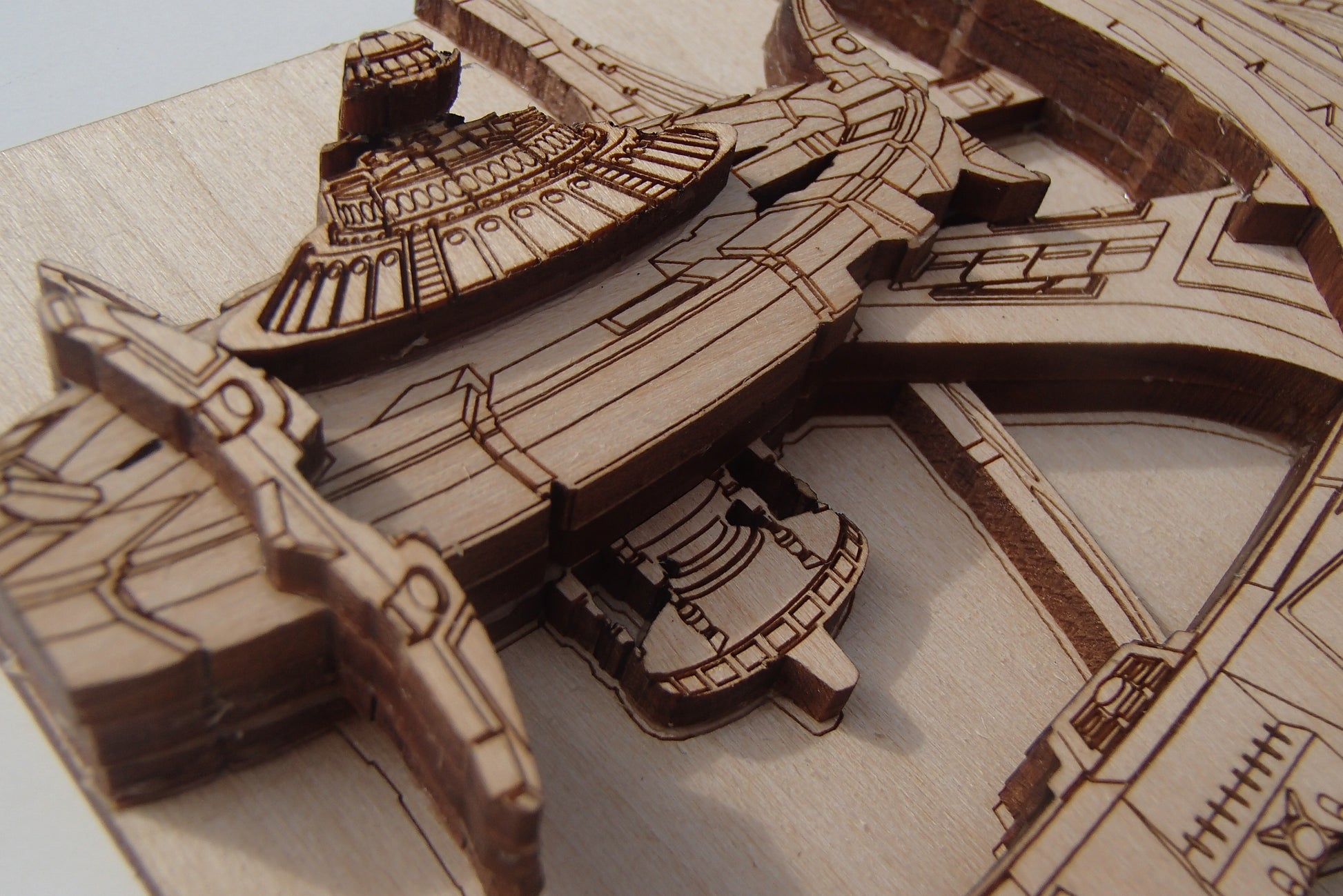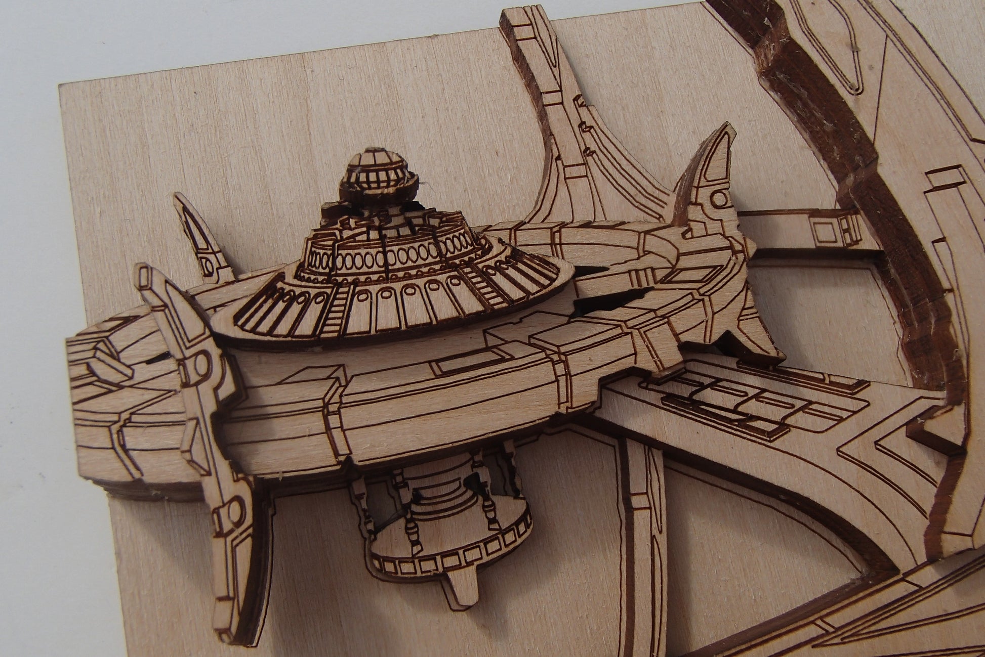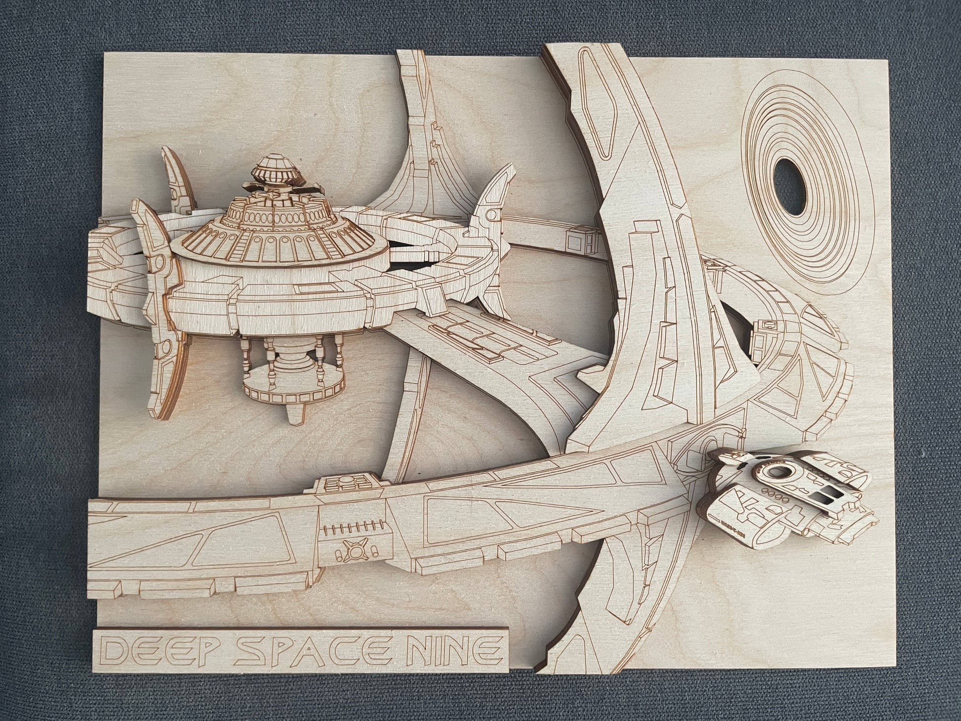 A magnificent laser cut model of Deep Space Nine, standing guard at the Bajoran Wormhole. The Defiant docked ready for mission. A unique piece that would stand out in any Trek display. Laser cut from durable plywood sheets and layered to produce a three dimensional effect. Each model is hand assembled by me with all the love of a lifelong Trekkie.