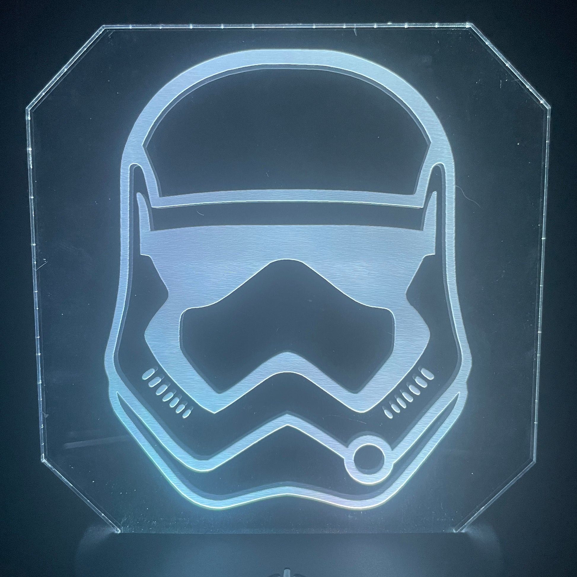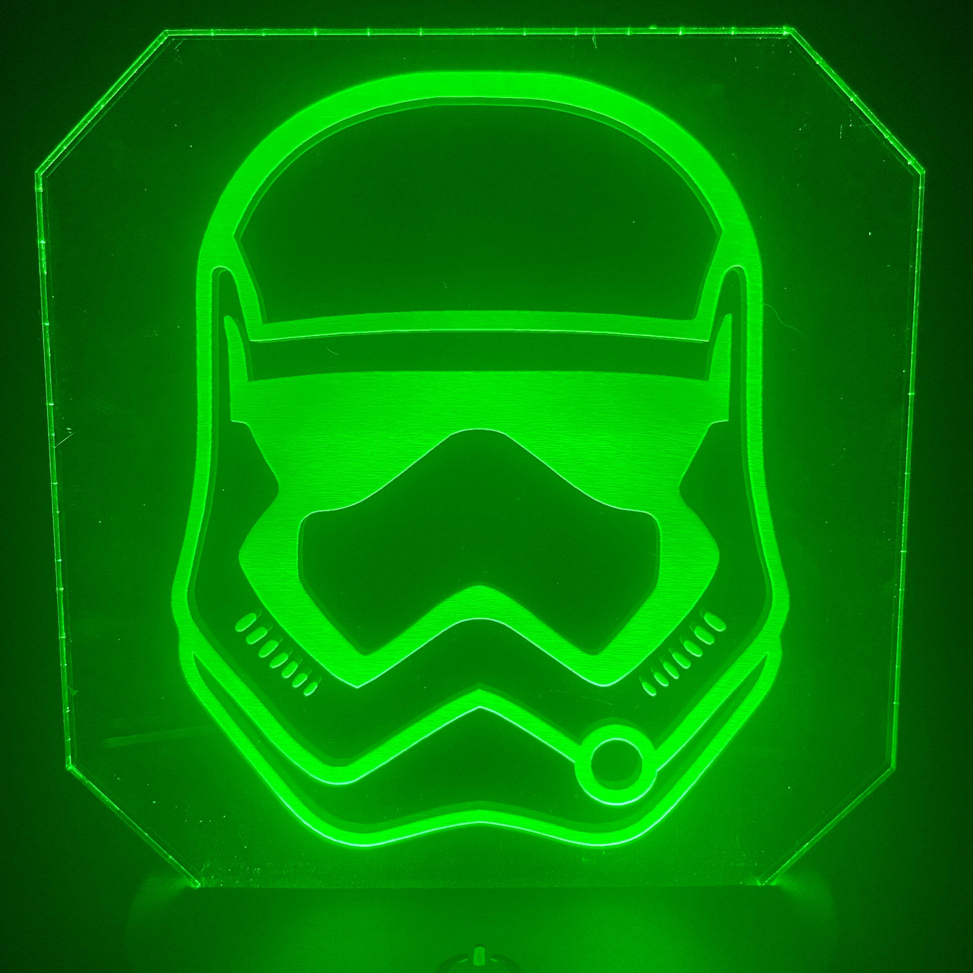 Etched acrylic plate of A FIRST ORDER HELMET. Each model comes with their own mutli-color changing LED light base. Colors include, Red, Yellow, Green, Blue, Magenta, Cyan, Orange and White. The base is either USB powered or battery powered (batteries not included). A great display item for that Star Wars fan in your life. Put it on your desk, display rack or bookshelf. It even can be used as a night light!