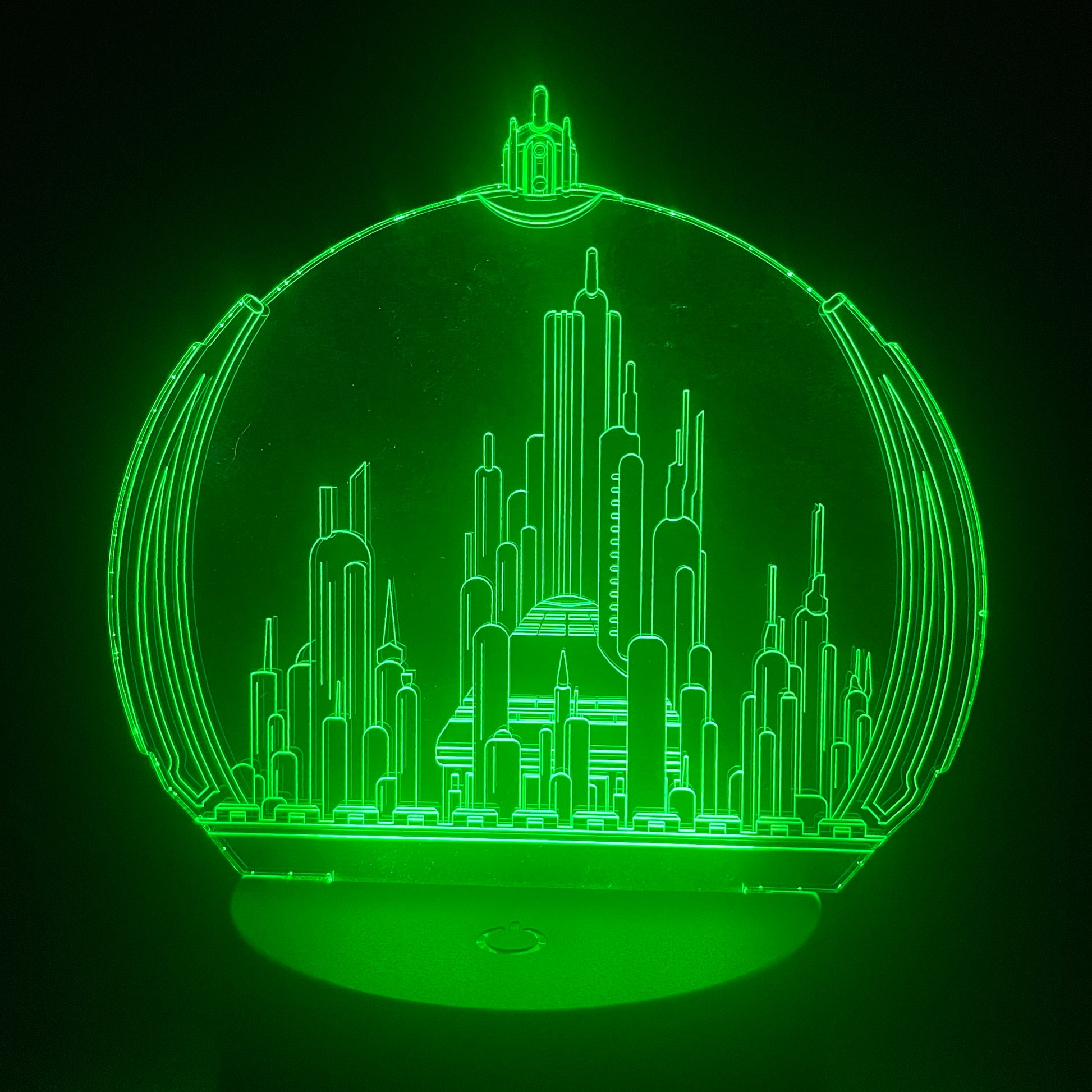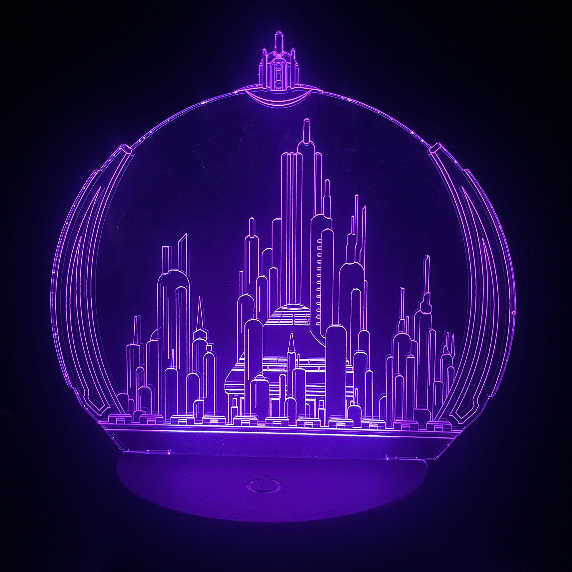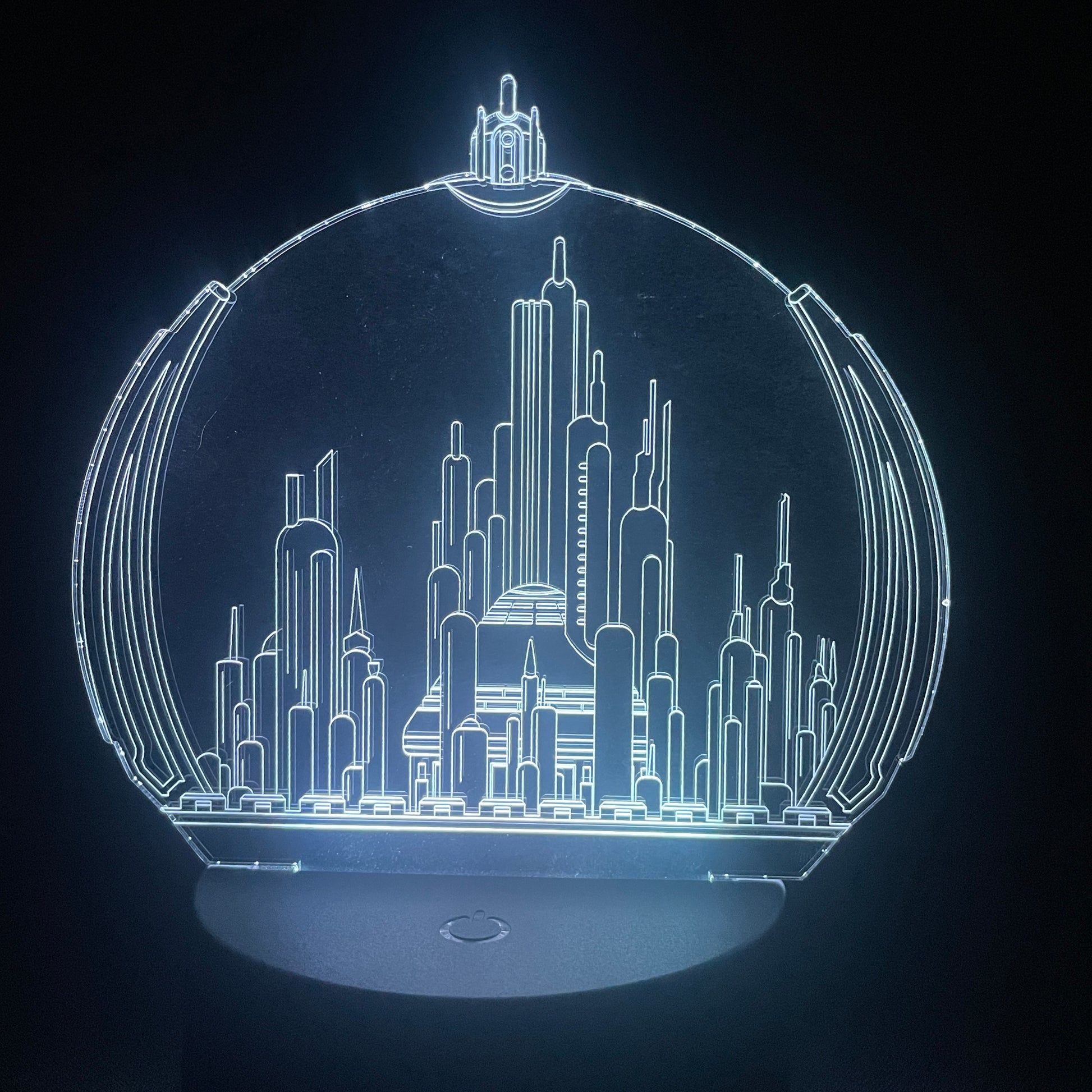 Etched acrylic LED plate of the Gallifrey Citadel. Each model comes with their own mutli-color changing LED light base. Colors include, Red, Yellow, Green, Blue, Magenta, Cyan, Orange and White. The base is either USB powered or battery powered (batteries not included). A great display item for that Whovian in your life. Put it on your desk, display rack or bookshelf. It even can be used as a night light!