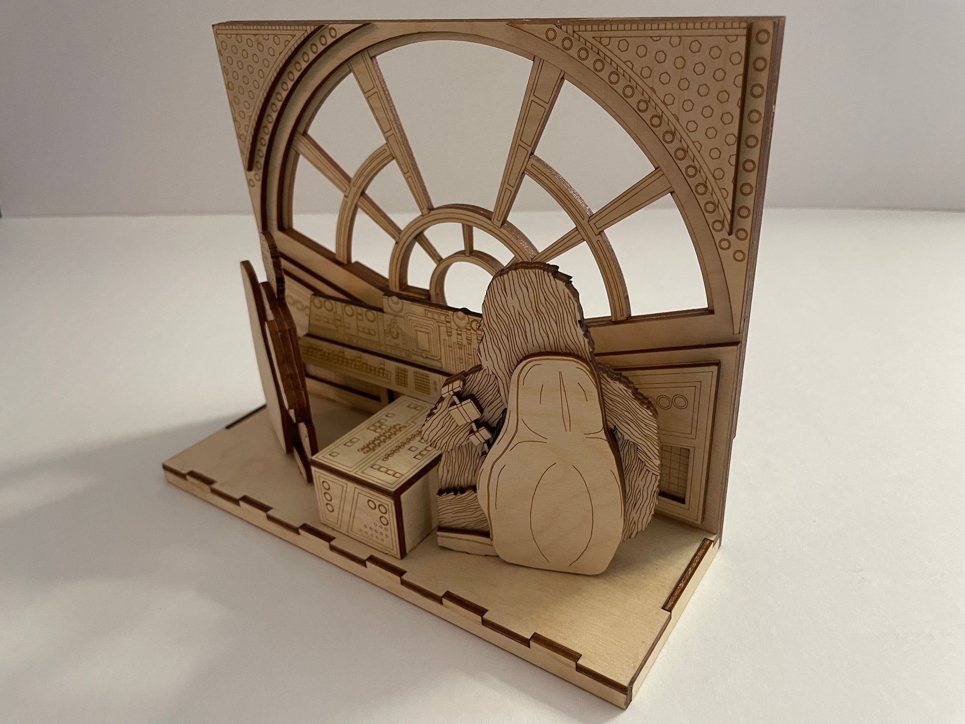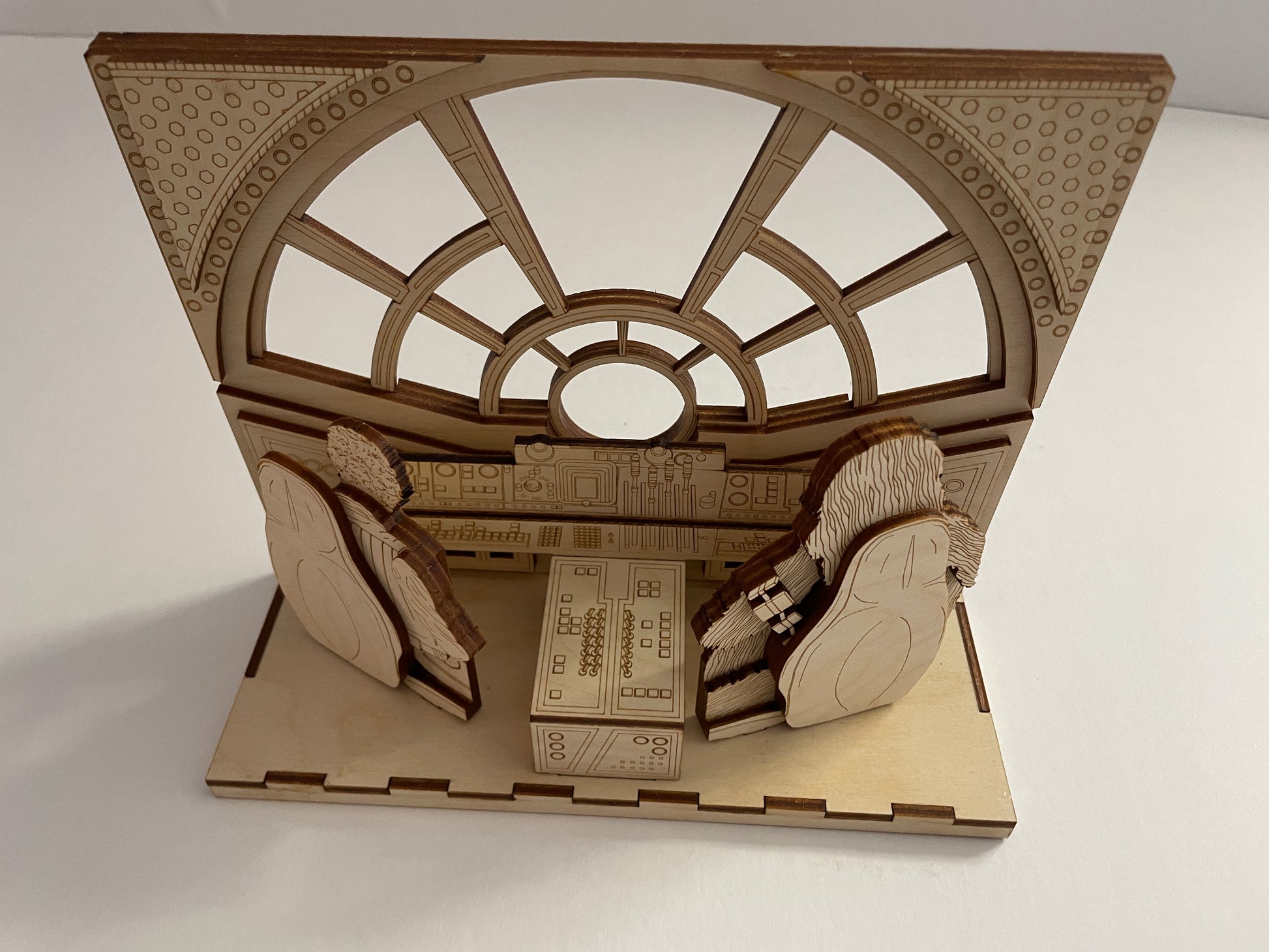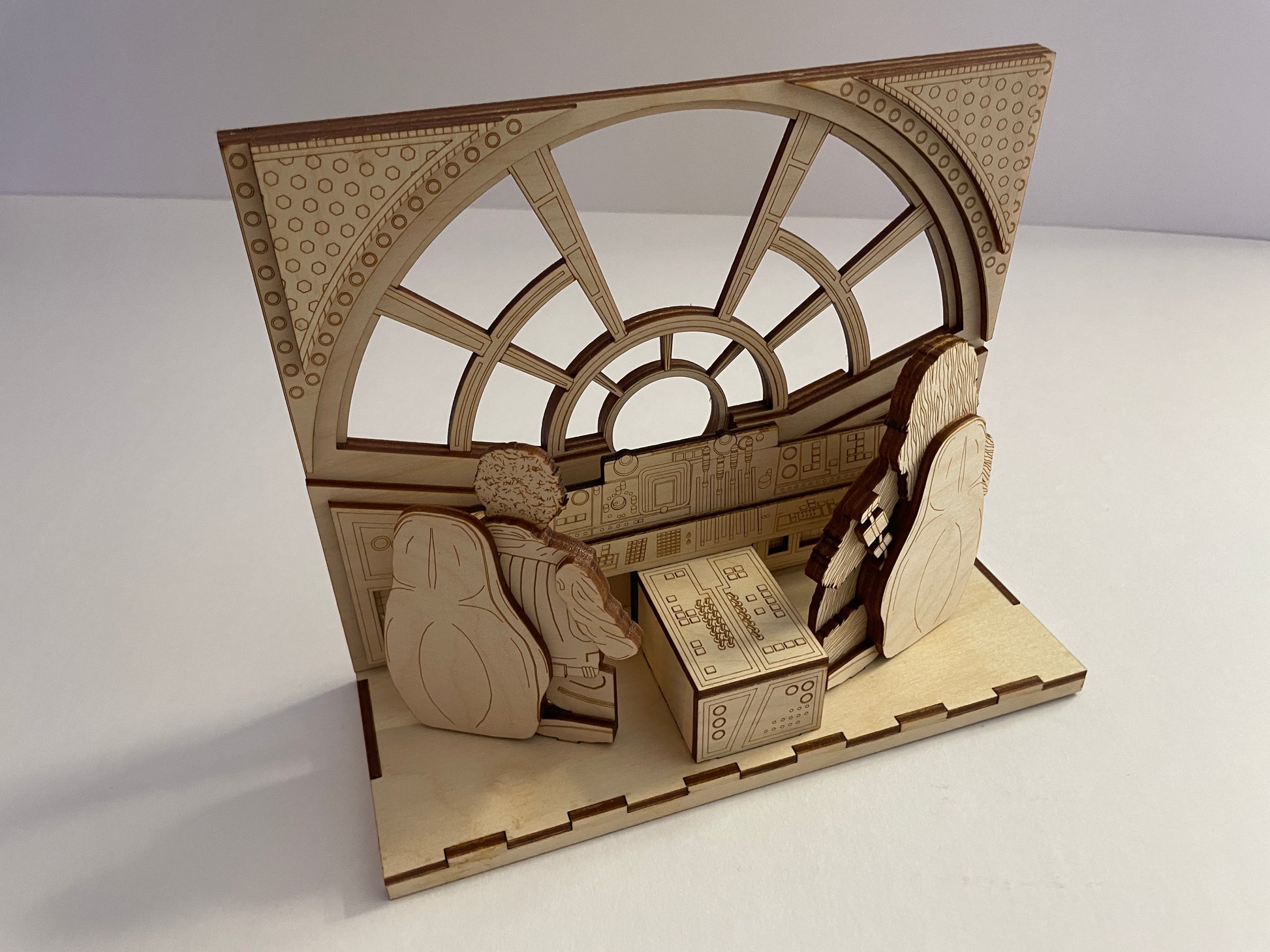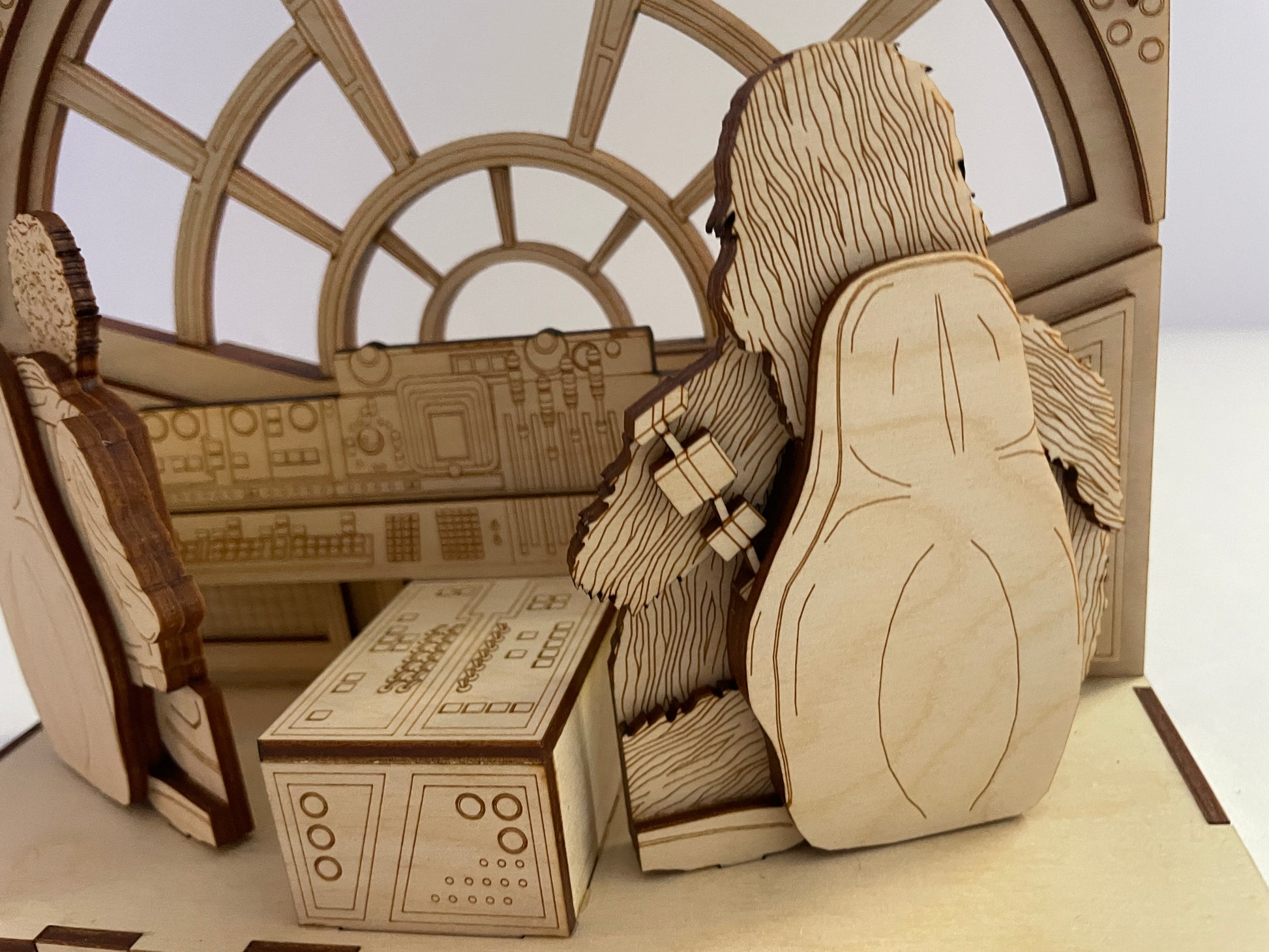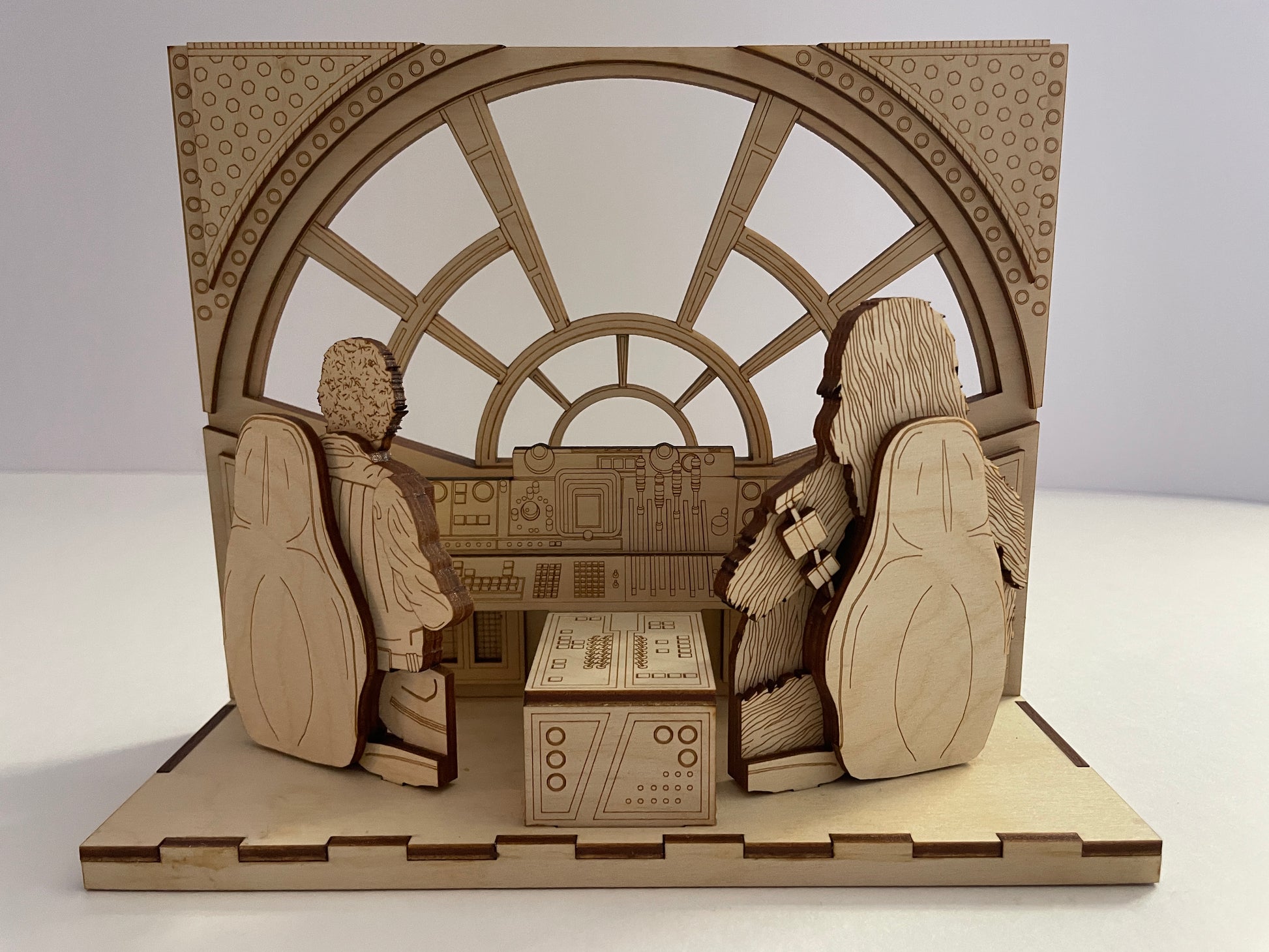 Pop art wood model of Han Solo and Chewbacca flying the Millennium Falcon. Built from durable layers of plywood to create a three dimensional effect. A perfect model for your Star Wars fan in your life. It can sit on a desk, a shelf, inside a display case. This model is a great addition to your Star Wars collection. Own this one of a kind product showing off one of the iconic scenes of the franchise.