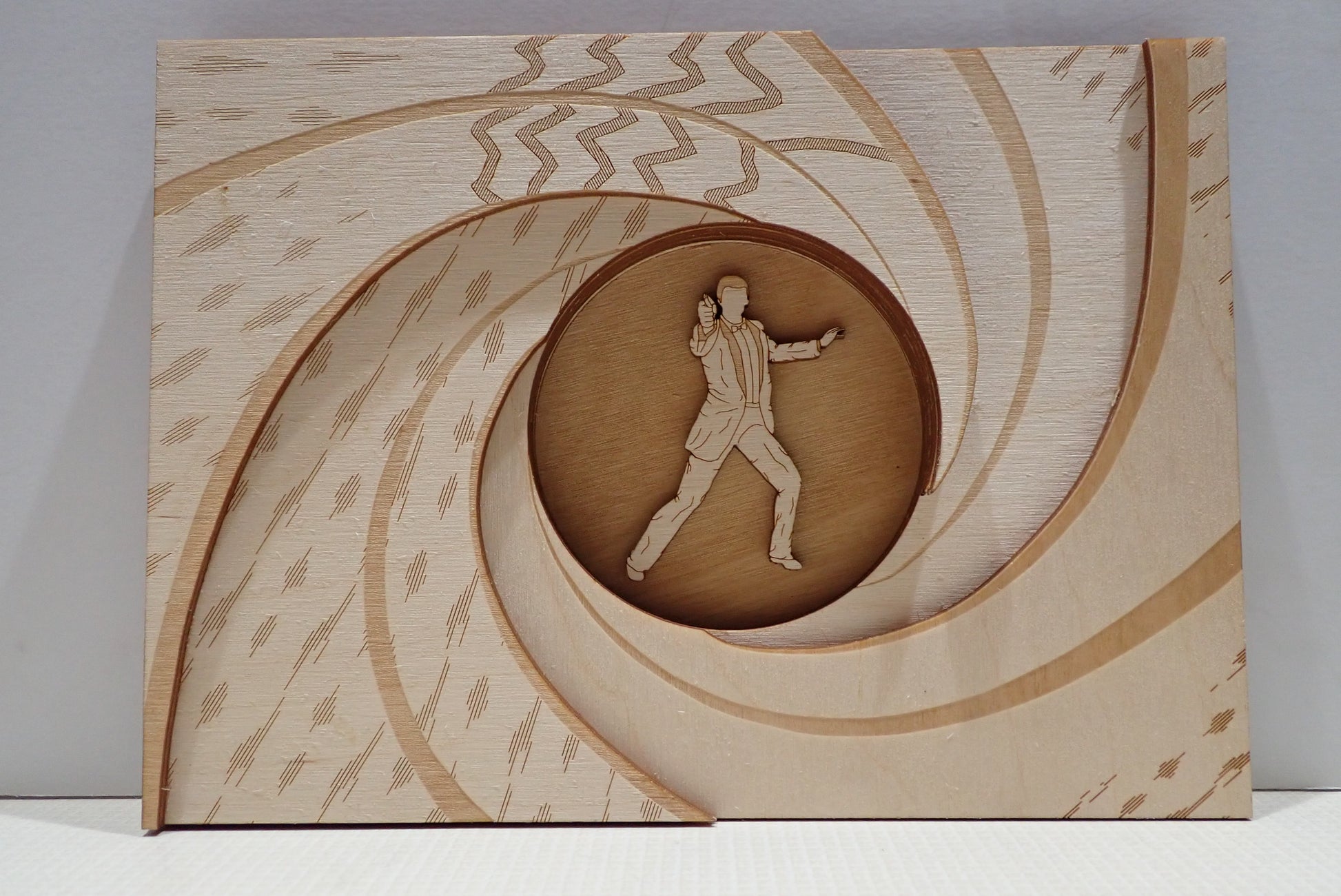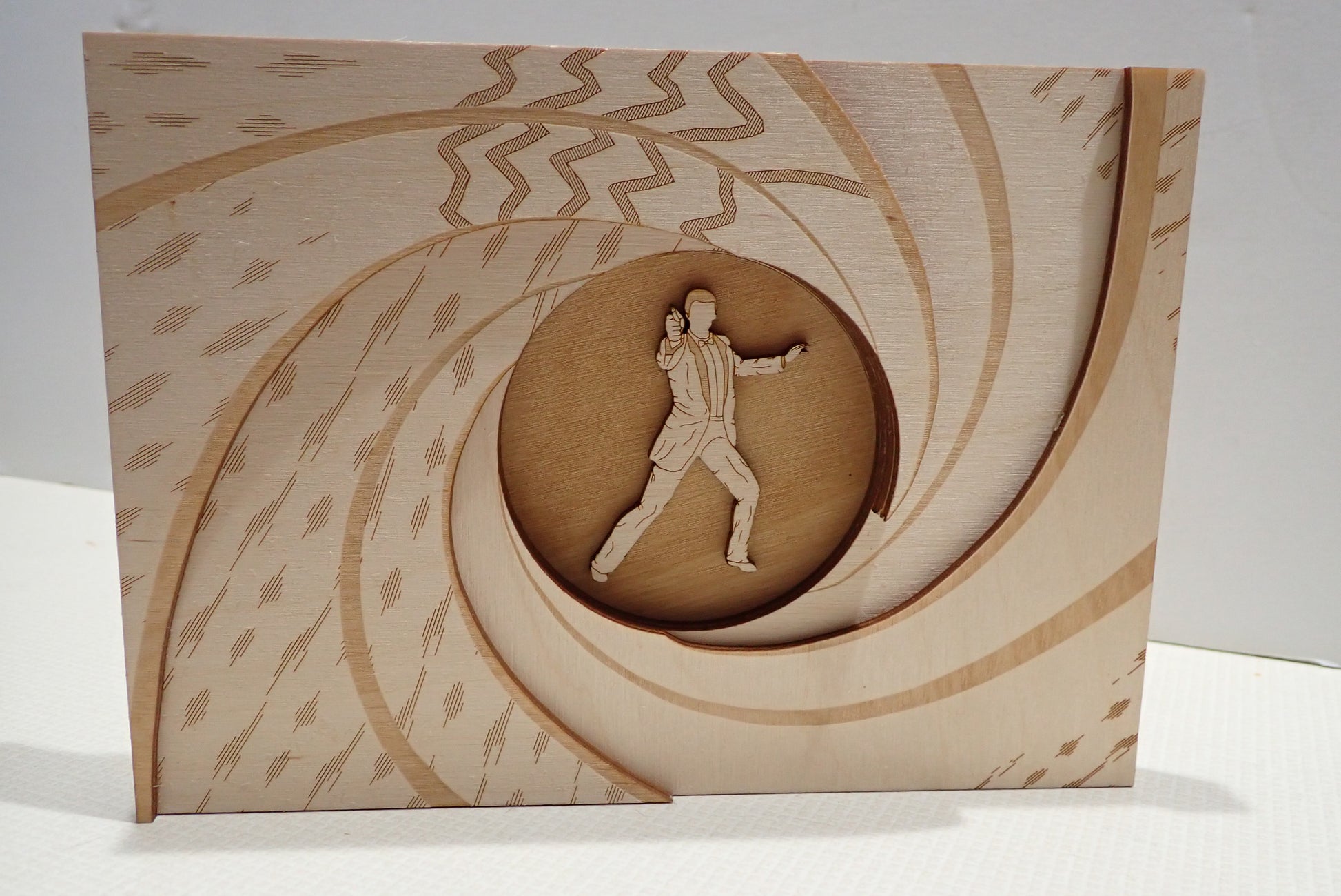 The iconic James Bond gun barrel! You can almost hear the theme music playing looking at this wonderful wooden pop art model. Each model is laser cut from durable sheets of plywood and hand assembled. Can be for a desk, a shelf, table or anywhere else! A perfect piece for that 007 fan in your life.