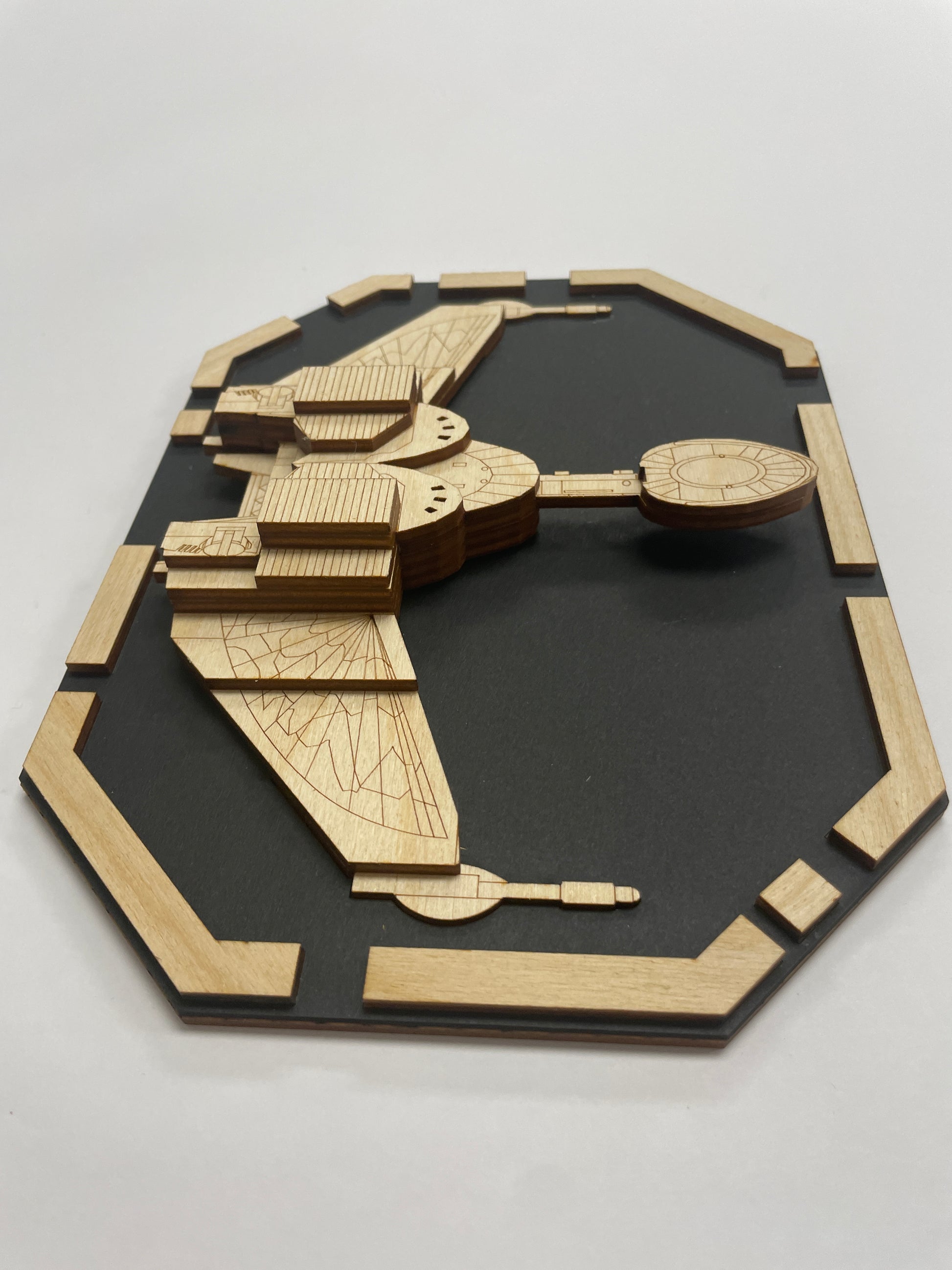 Wood pop art starship plaque of the KLINGON BIRD OF PREY. Built from layers of durable plywood giving the model a three dimensional effect. A sheet of black museum board makes the starship’s details pop. An LCARS style border frames the models. Put it on your desk, display rack or bookshelf. A great display item for that Trekkie in your life.