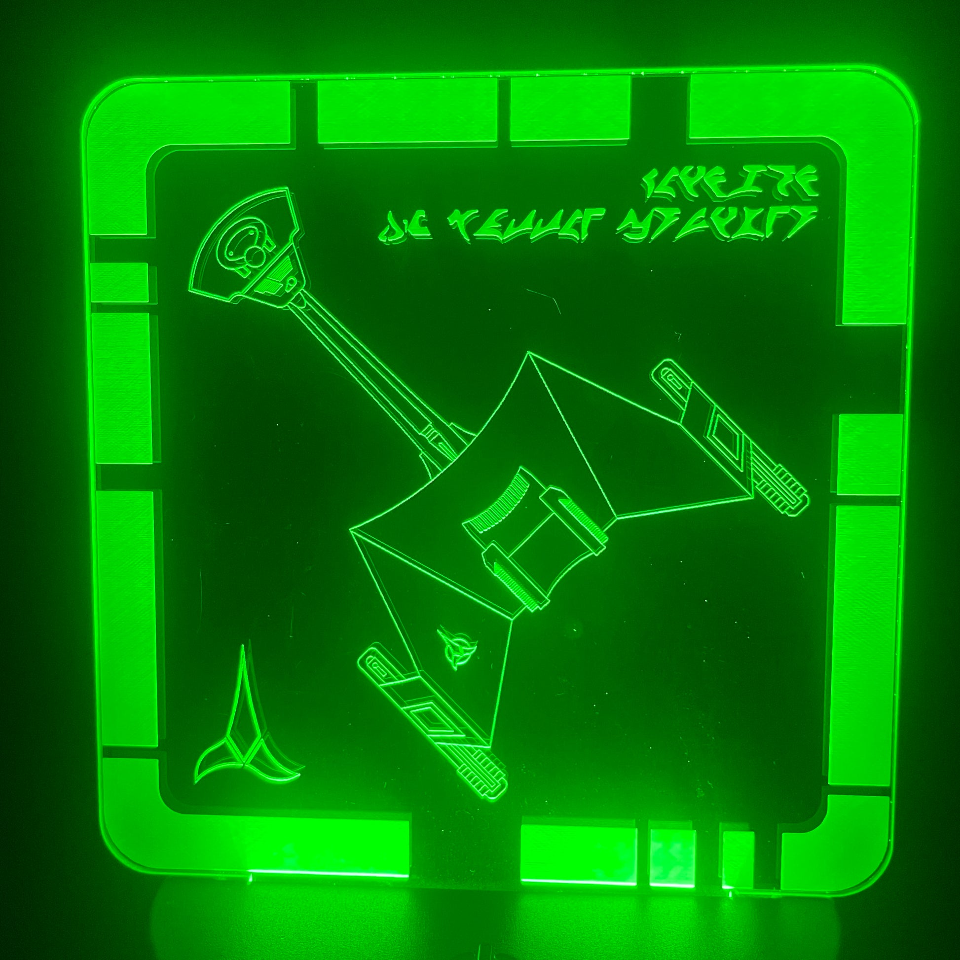 Etched acrylic starship plaque of the KLINGON D-7 BATTLECRUISER with an LCARS style border. Each model comes with their own mutli-color changing LED light base. Colors include, Red, Yellow, Green, Blue, Magenta, Cyan, Orange and White. The base is either USB powered or battery powered (batteries not included). A great display item for that Trekkie in your life. Put it on your desk, display rack or bookshelf. It even can be used as a night light!