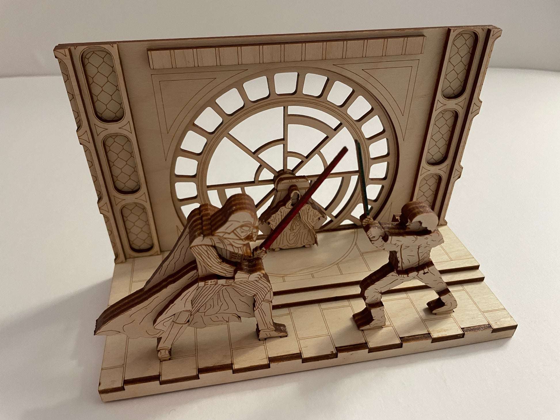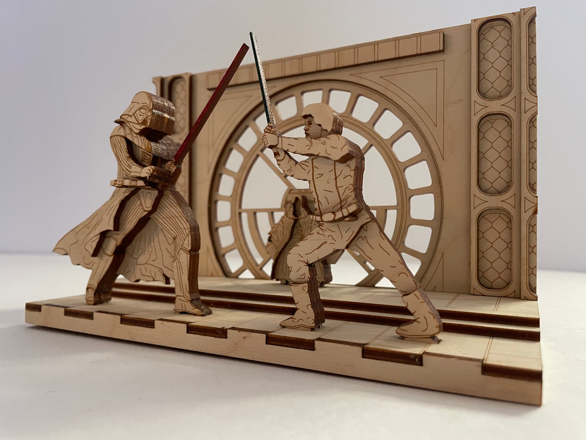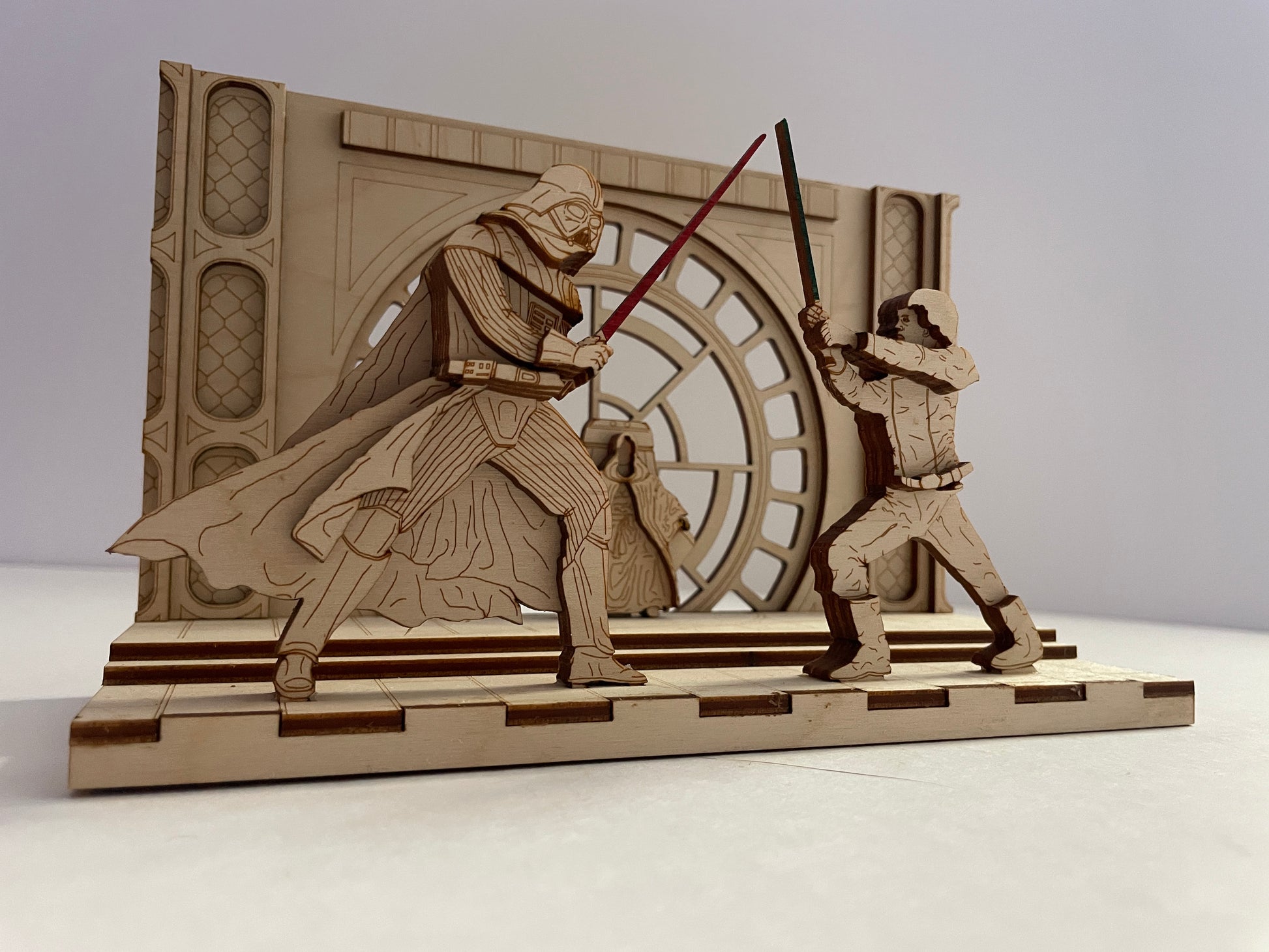 Pop art wood model of Luke Skywalker vs Darth Vader on the Death Star with Emperor Palpatine in the background. Built from durable layers of plywood to create a three dimensional effect. A perfect model for your Star Wars fan in your life. It can sit on a desk, a shelf, inside a display case. This model is a great addition to your Star Wars collection. Own this one of a kind product showing off one of the iconic scenes of the franchise.