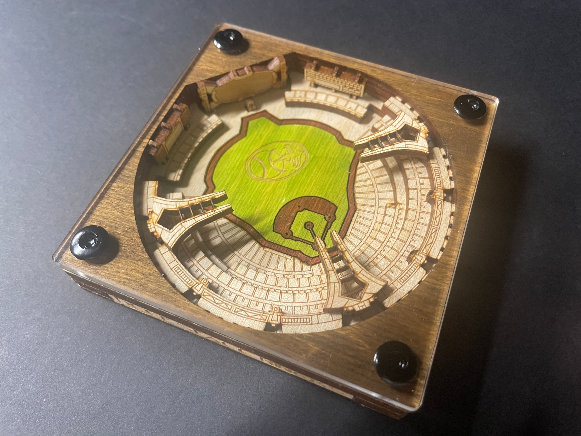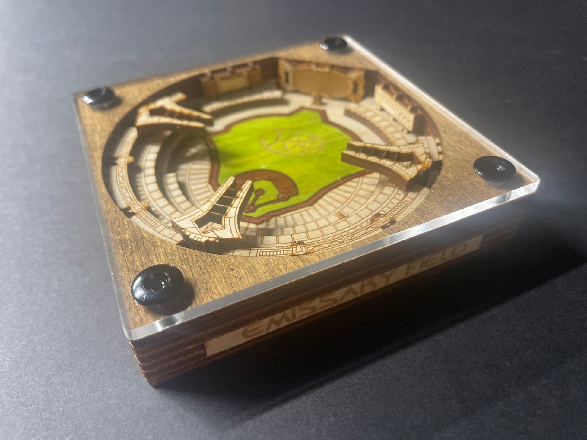 Welcome to Emissary Field, home of the Deep Space Niners. A three dimensional wooden coaster that can double as a wonderful desktop model when not in use. Cut from sturdy plywood sheets and topped in acrylic, this might be your new favorite place to put your Rakatajino or Earl Grey Tea.