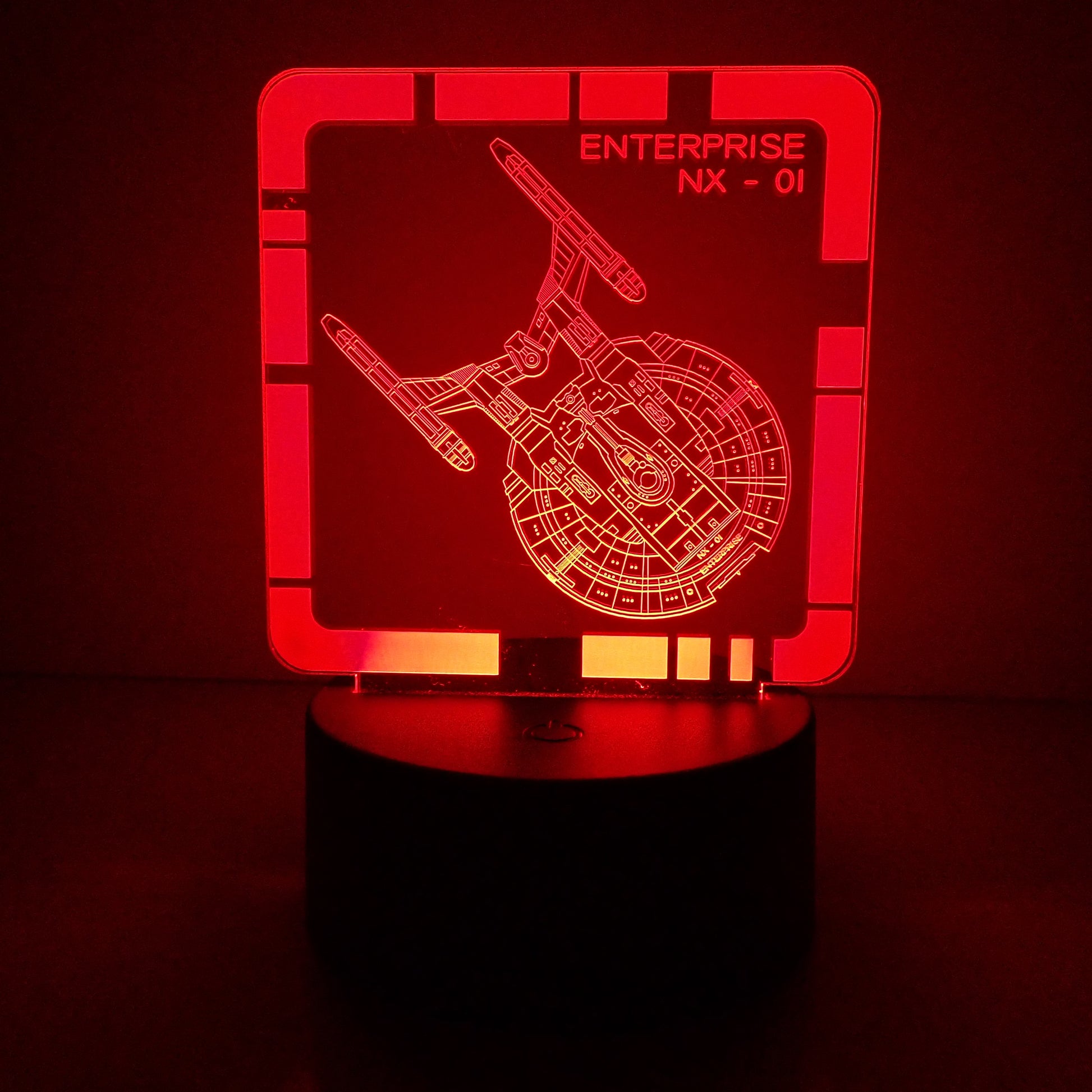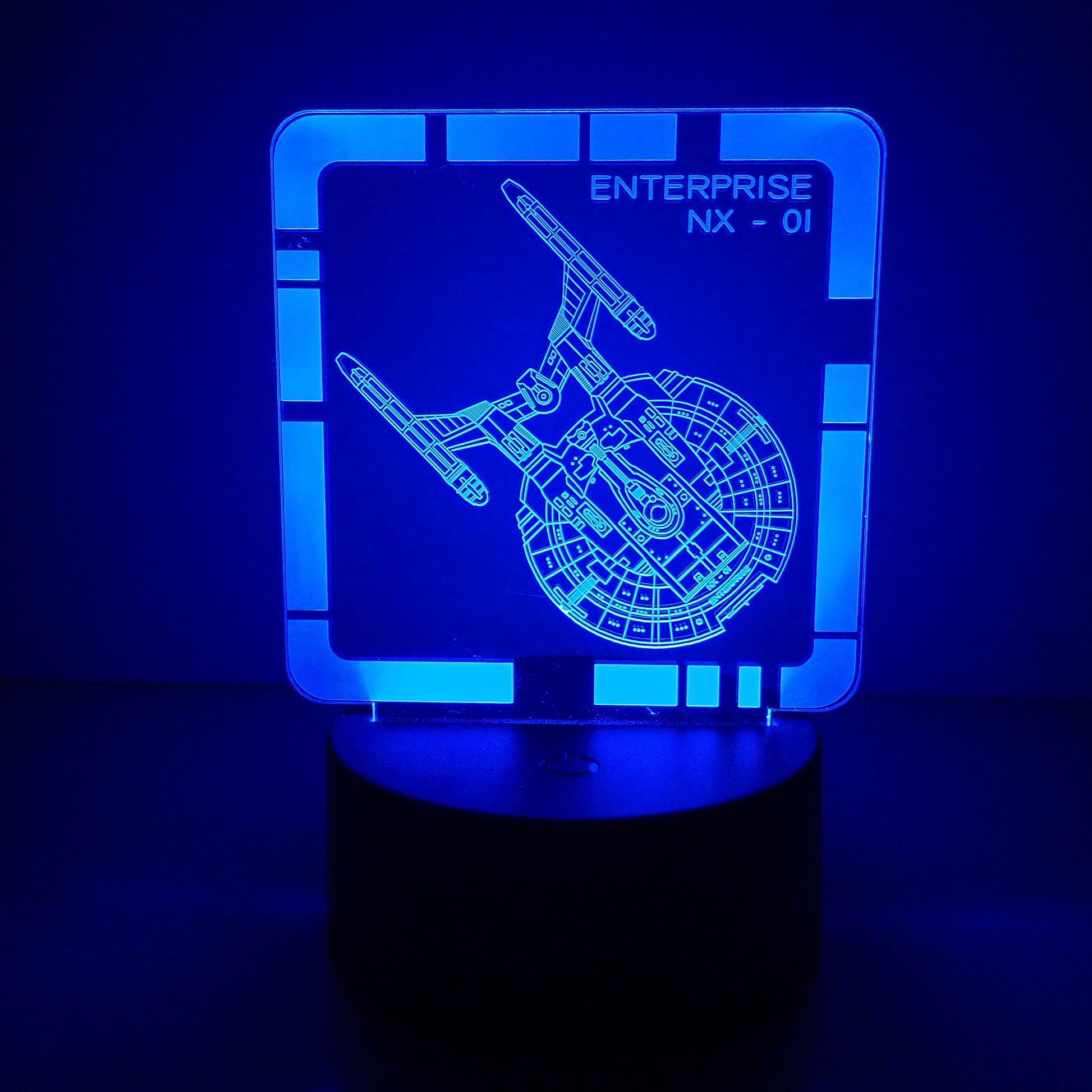 Etched acrylic starship plaque of the ENTERPRISE NX-01 with an LCARS style border. Each model comes with their own mutli-color changing LED light base. Colors include, Red, Yellow, Green, Blue, Magenta, Cyan, Orange and White. The base is either USB powered or battery powered (batteries not included). A great display item for that Trekkie in your life. Put it on your desk, display rack or bookshelf. It even can be used as a night light!