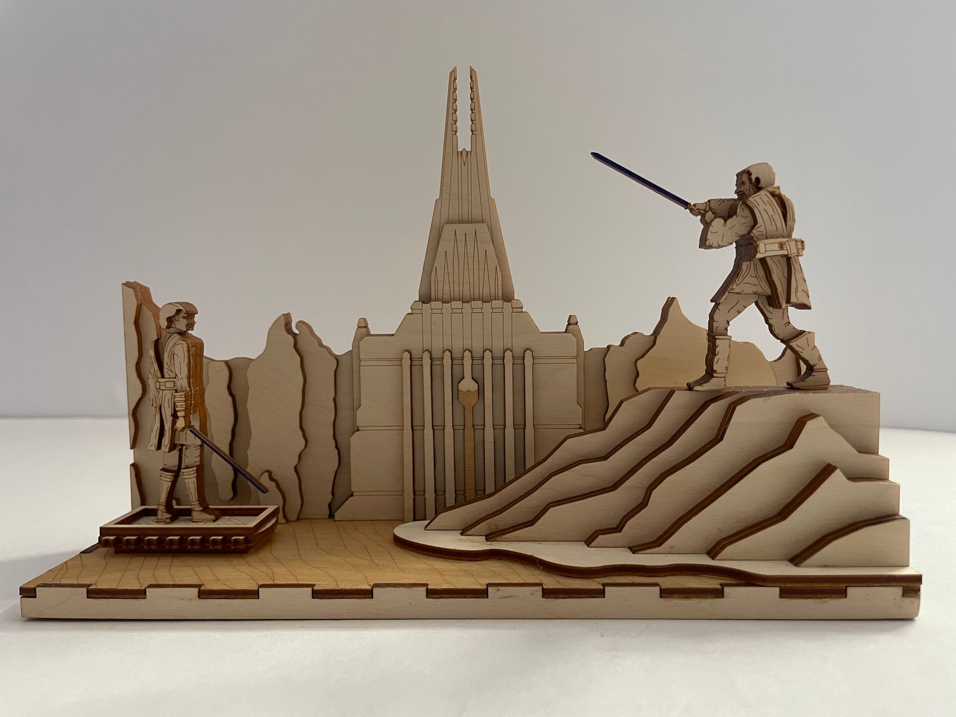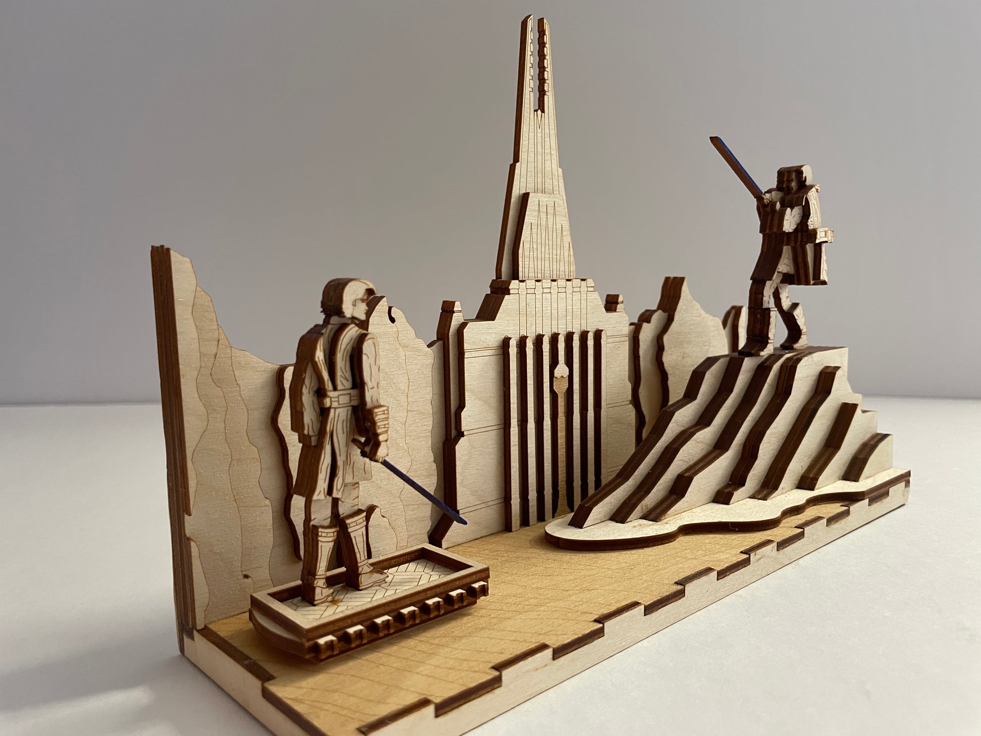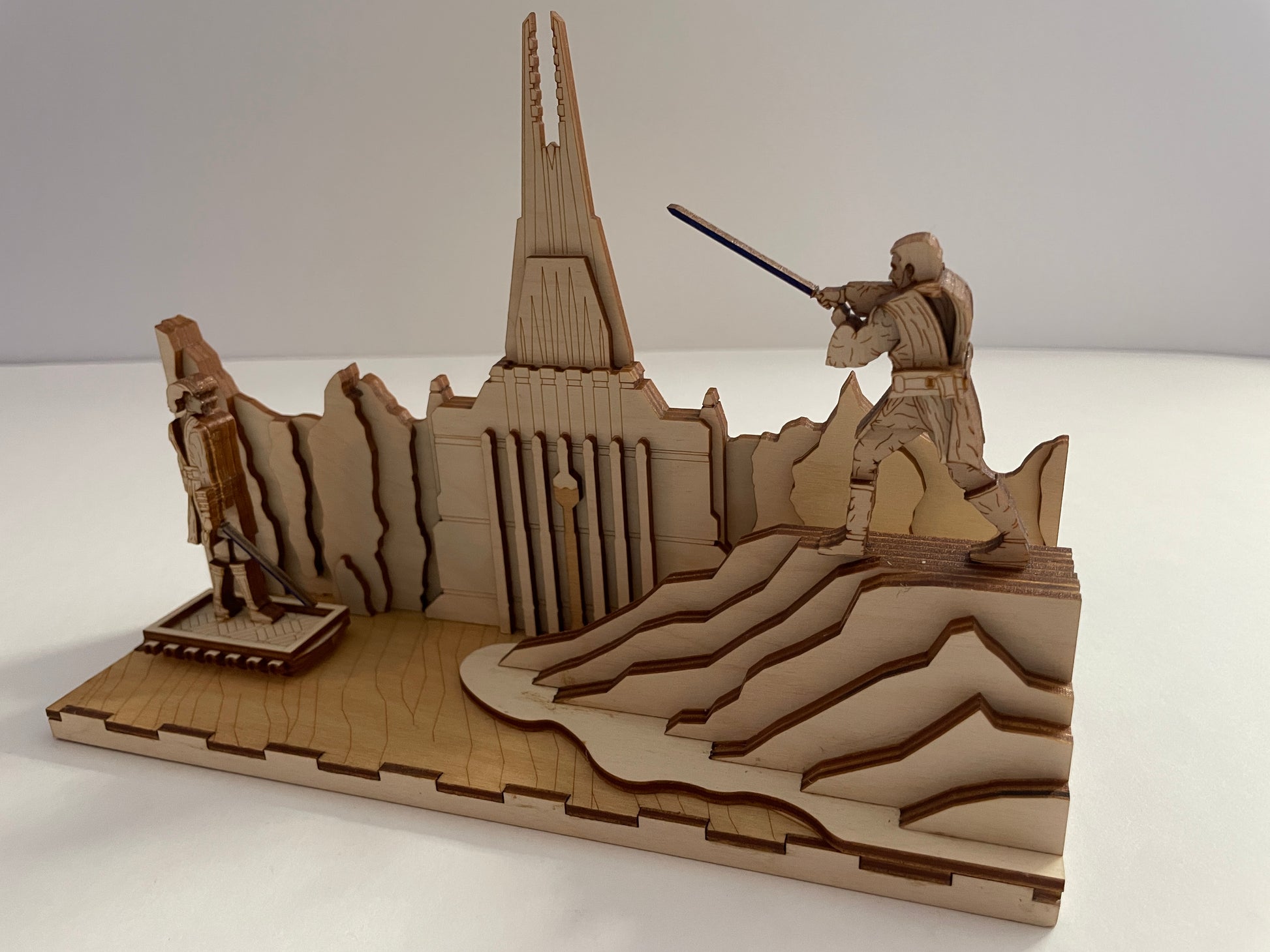 Pop art wood model of Obi-Wan Kenobi vs Anakin Skywalker on Mustafar. The High Ground! Built from durable layers of plywood to create a three dimensional effect. A perfect model for your Star Wars fan in your life. It can sit on a desk, a shelf, inside a display case. This model is a great addition to your Star Wars collection. Own this one of a kind product showing off one of the iconic scenes of the franchise.