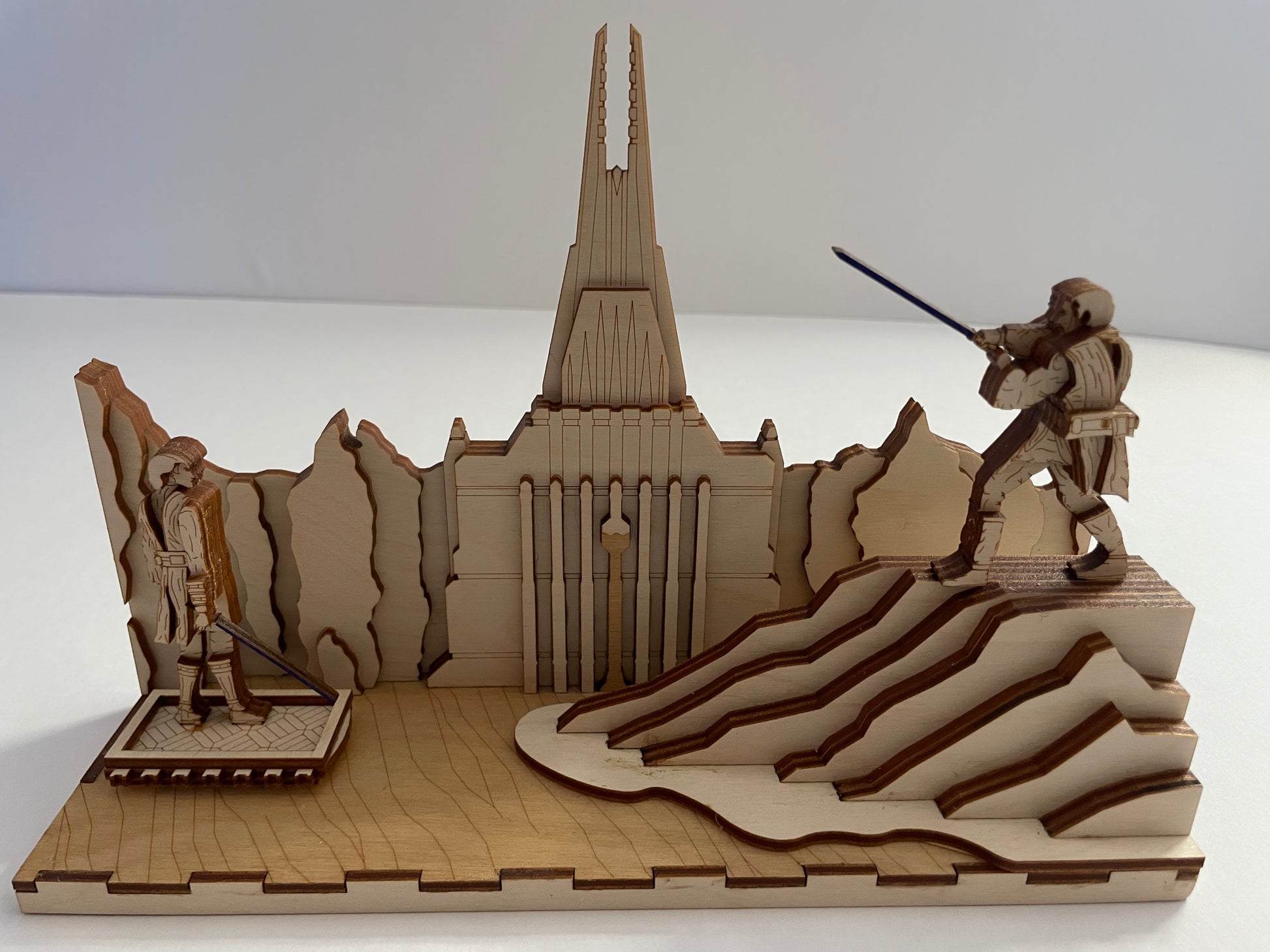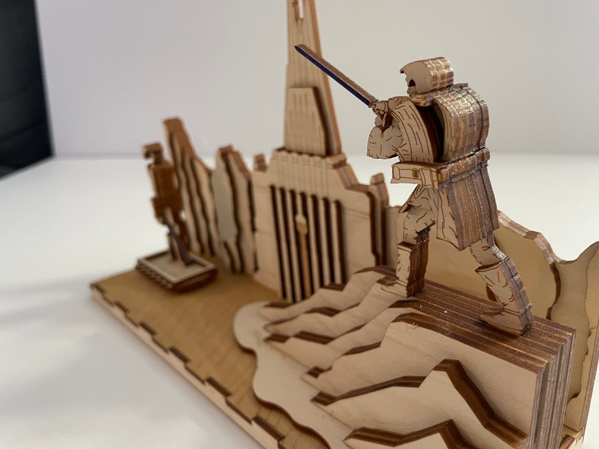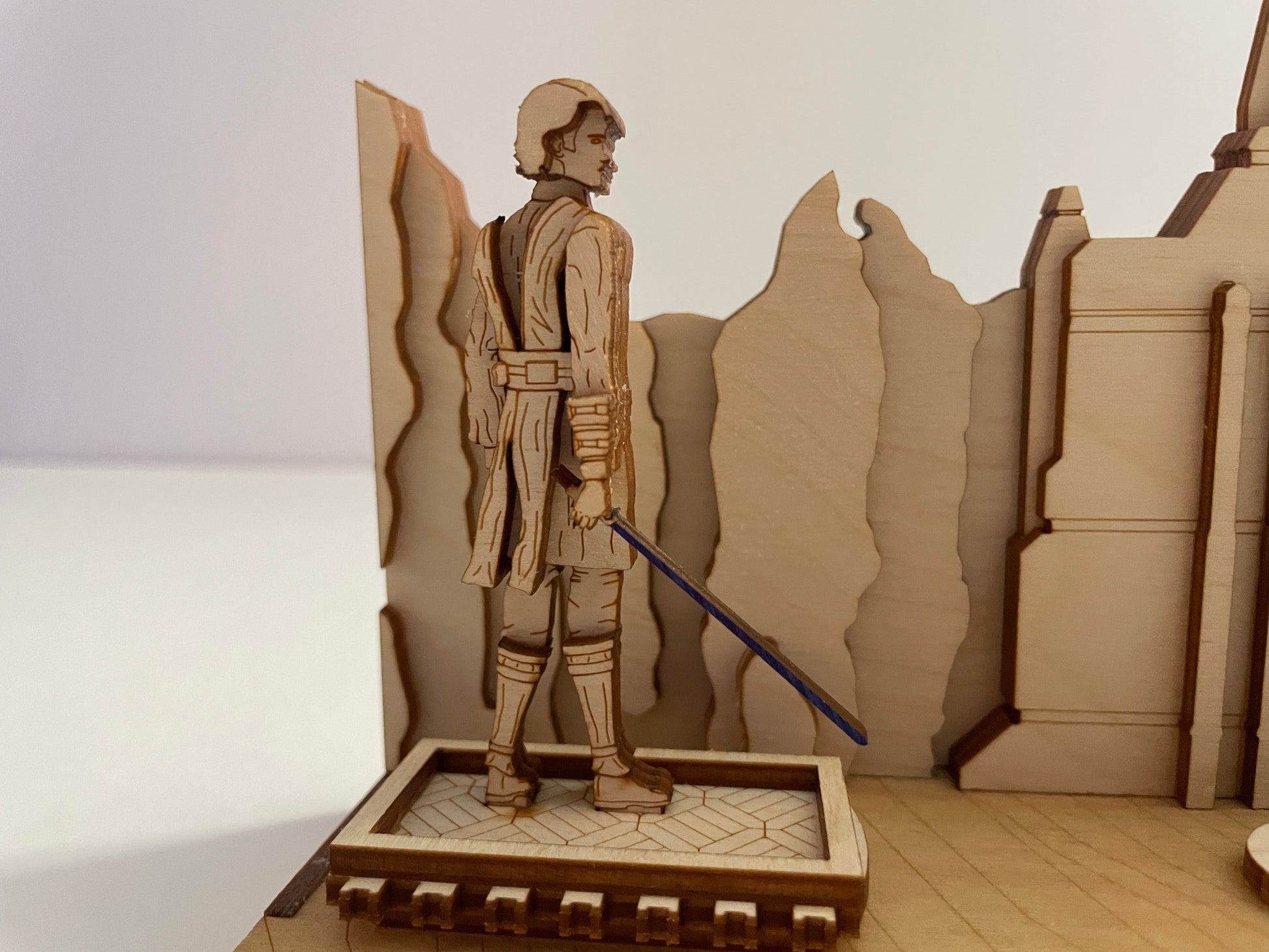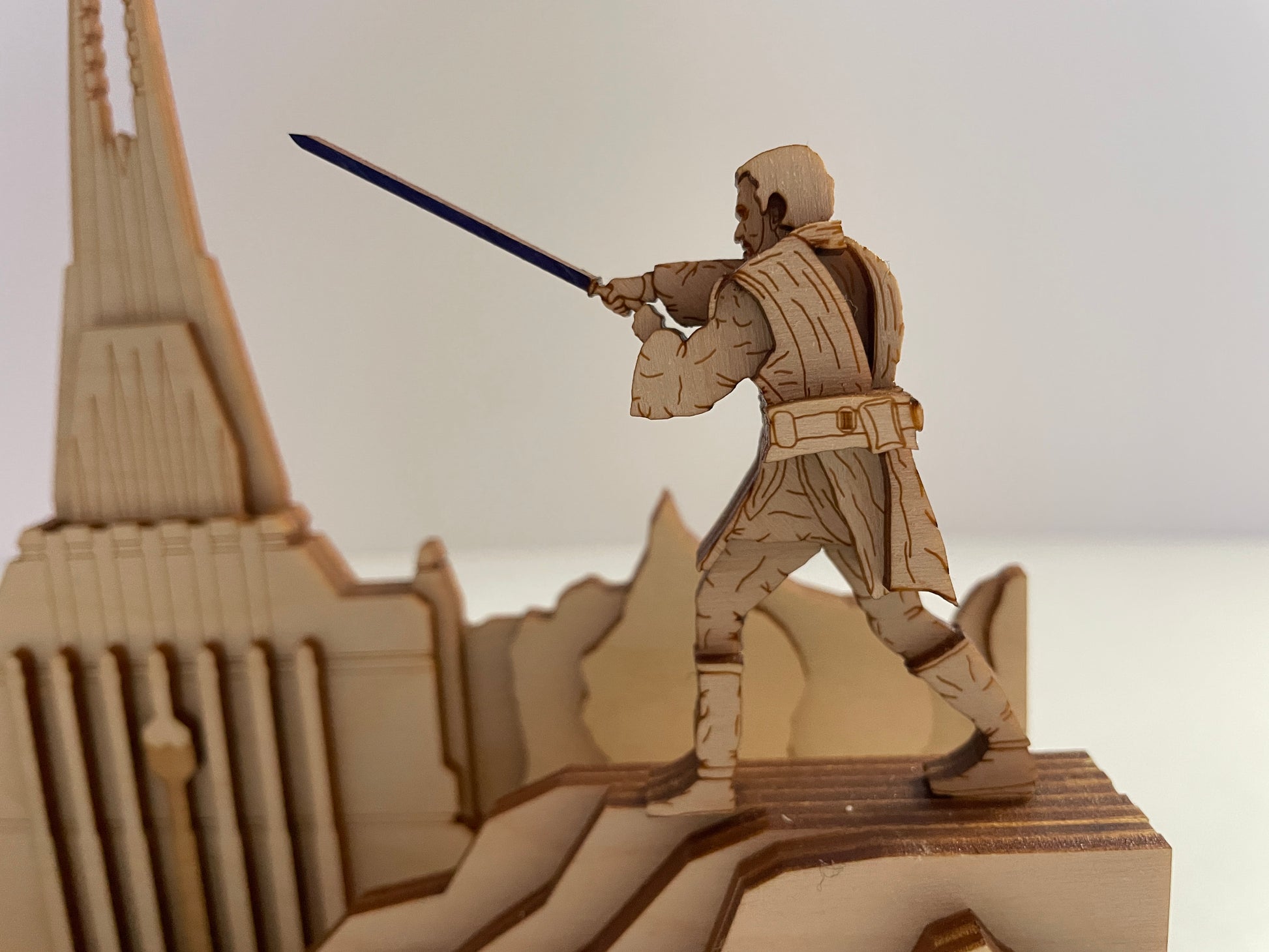 Pop art wood model of Obi-Wan Kenobi vs Anakin Skywalker on Mustafar. The High Ground! Built from durable layers of plywood to create a three dimensional effect. A perfect model for your Star Wars fan in your life. It can sit on a desk, a shelf, inside a display case. This model is a great addition to your Star Wars collection. Own this one of a kind product showing off one of the iconic scenes of the franchise.