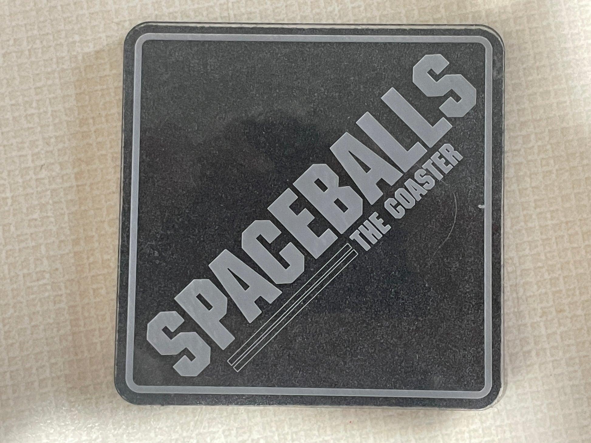 SPACEBALLS THE COASTER SET! A wonderful set of FOUR Acrylic coasters. Each coaster is made from 1/8" thick durable clear acrylic sheets with a black felt backer to prevent slipping/scratching.