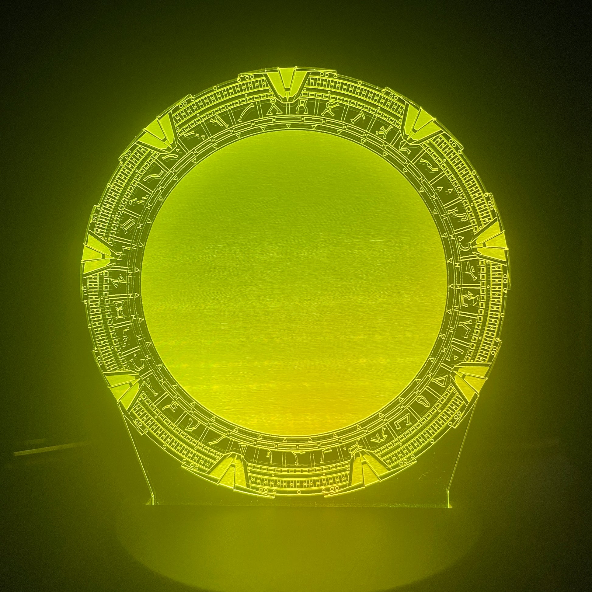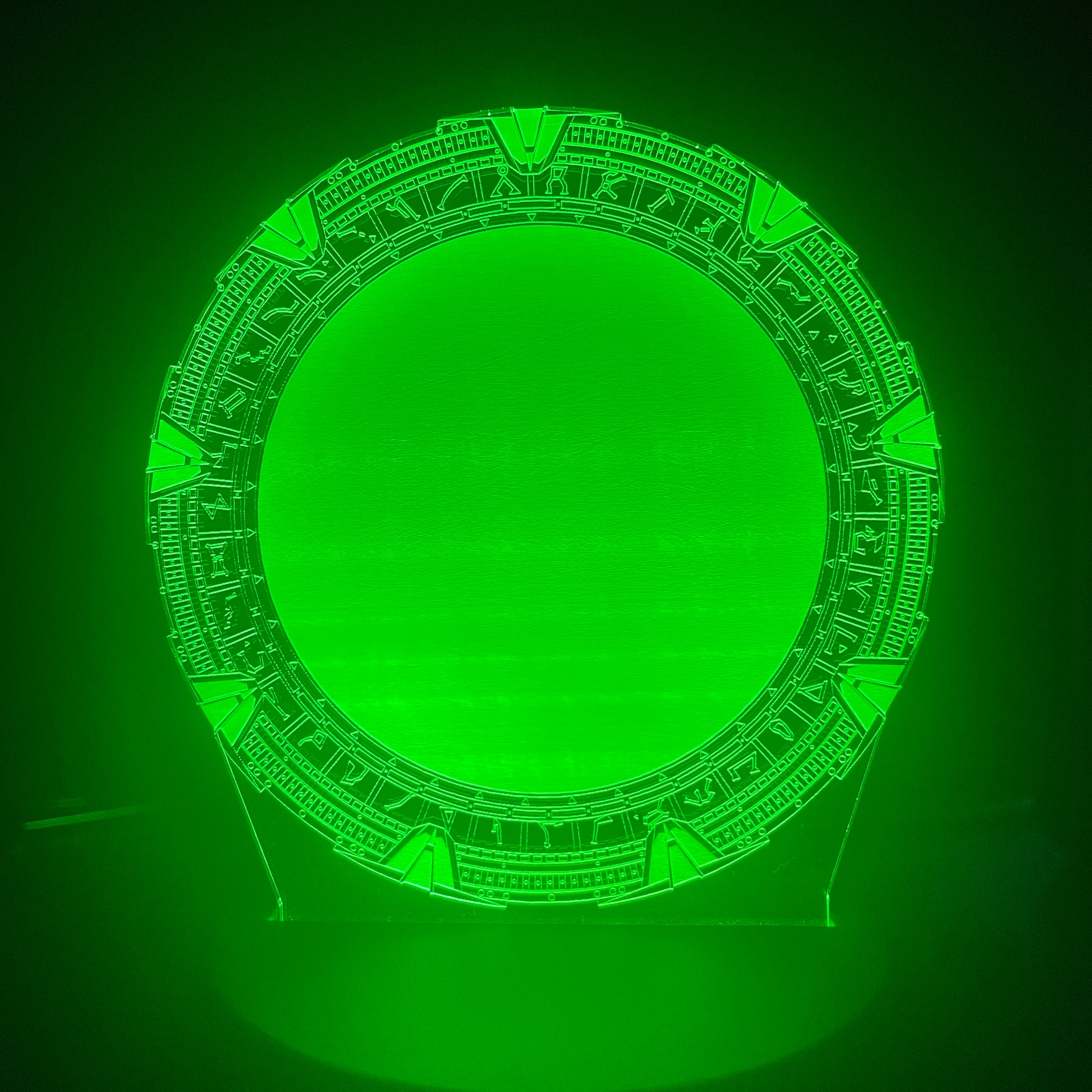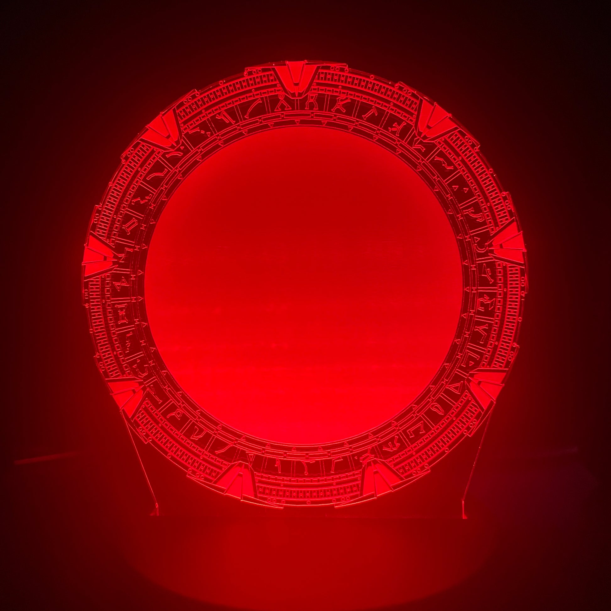Etched acrylic model of the SG-1 STARGATE. Each model comes with their own mutli-color changing LED light base. Colors include, Red, Yellow, Green, Blue, Magenta, Cyan, Orange and White. The base is either USB powered or battery powered (batteries not included). A great display item for that Stargate fan in your life. Put it on your desk, display rack or bookshelf. It even can be used as a night light!