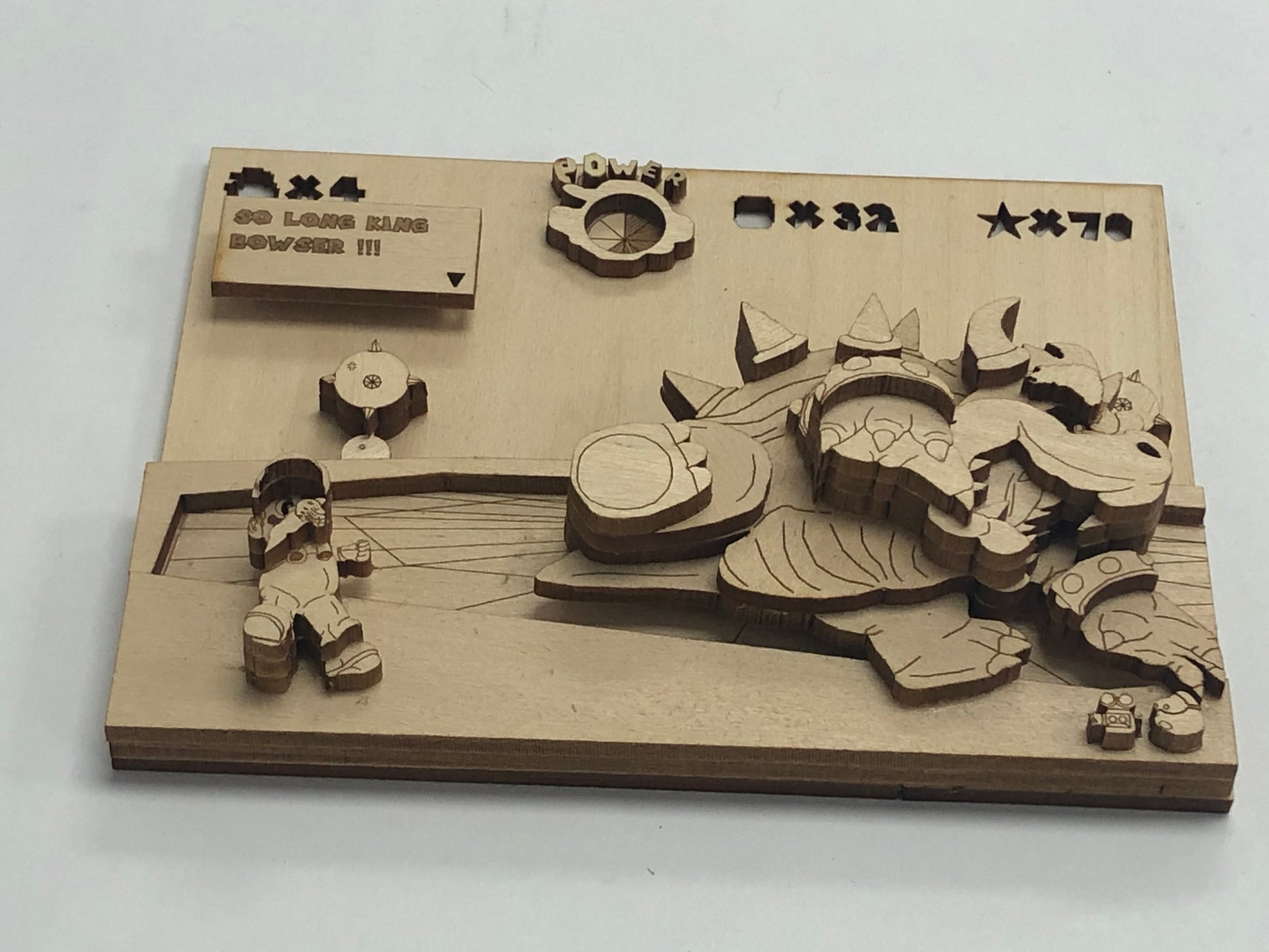 So Long King Bowser! A wood pop art recreation of Mario battling Bowser in Super Mario 64. Already in mid throw, Mario is ready to do what it takes to save Princess Peach. Built from layers of durable plywood and hand assembled. A perfect piece of art for any gamer's shelf, desk or wall.