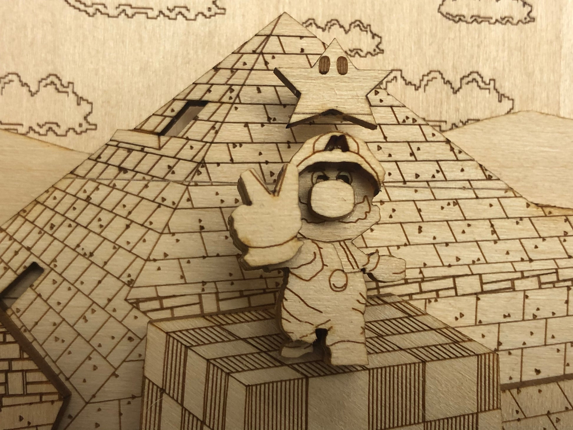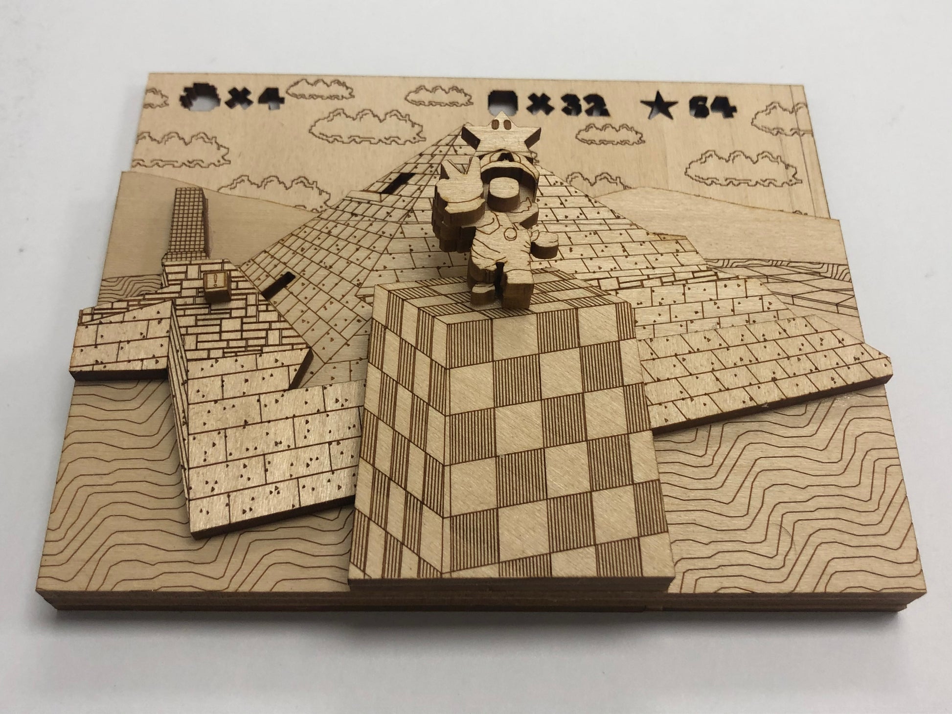 Here we go! Remember that feeling of joy collecting Super Mario 64 power stars? This pop art wood model recreates of Mario collecting one of those precious stars in Shifting Sand Land brings that back to life. Built from layers of durable plywood and hand assembled. A perfect piece of art for any gamer's shelf, desk or wall.