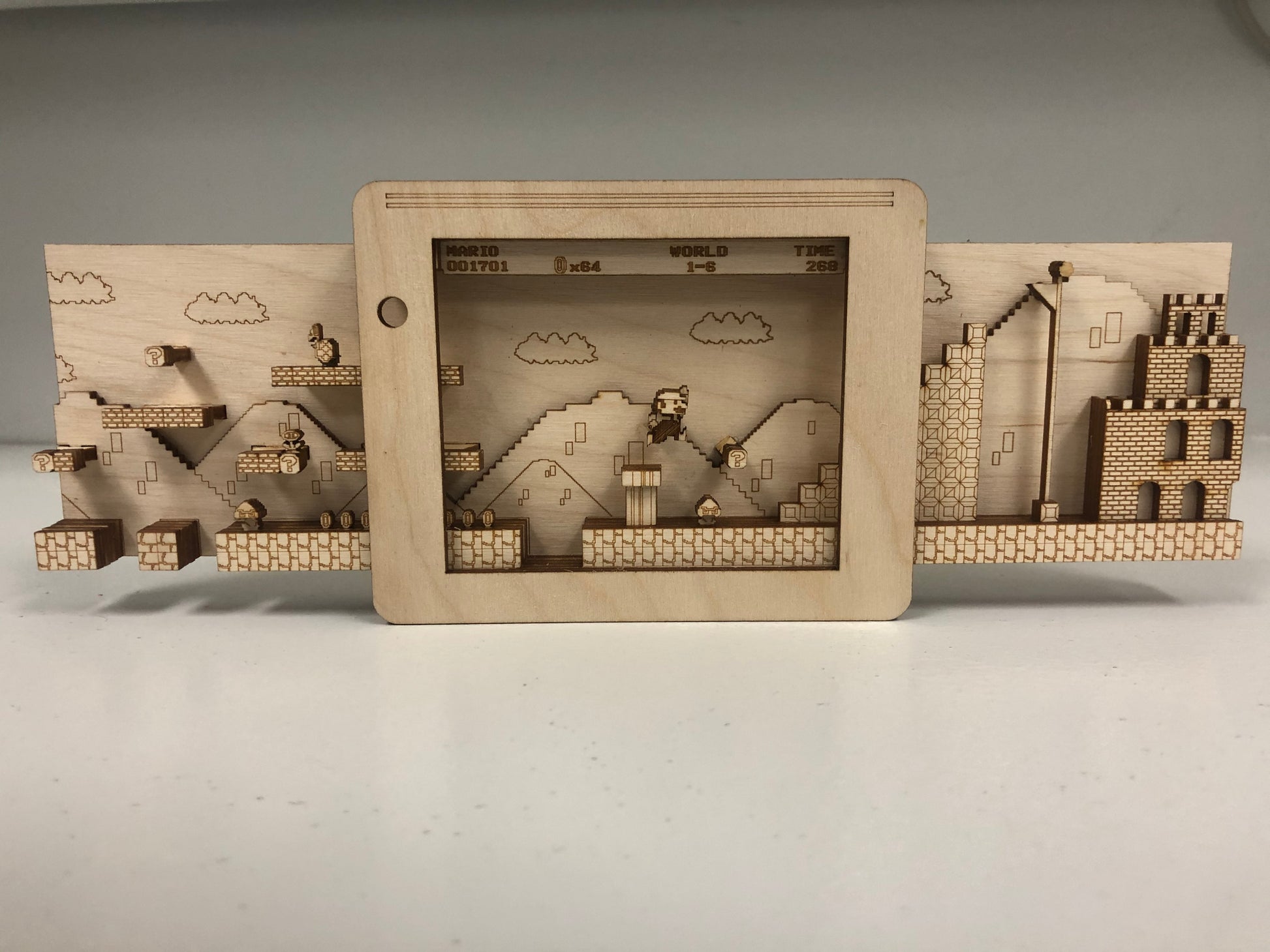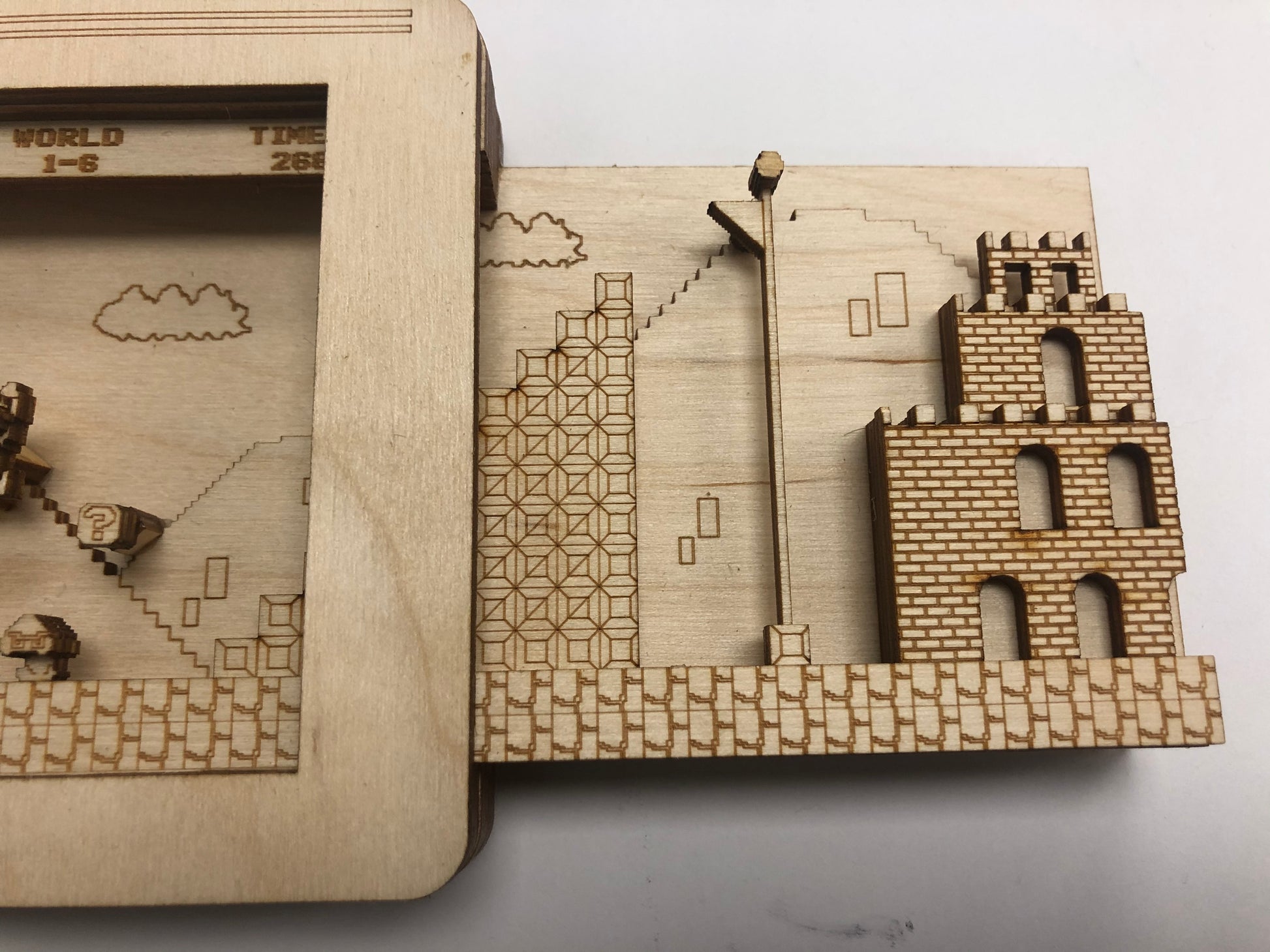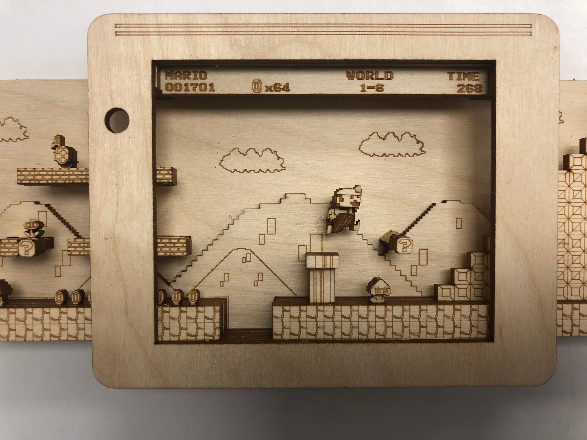 A highly detailed panorama of a classic/retro Mario platforming game in the style of Super Mario Brothers, inspired by the World 1-1 Level. Better get to the castle and capture the flag! Designed in the style of a triglyphs, this wooden pop part model shows the player where they are in the level within the Gameboy style viewing box, where they were and where they are going in the level. Built as a pop art model, the durable layers of plywood give an immerse experience for what is normally a two-dimensional world. A perfect gift for that classic gamer in your life. Perfect on a desk, wall or shelf.