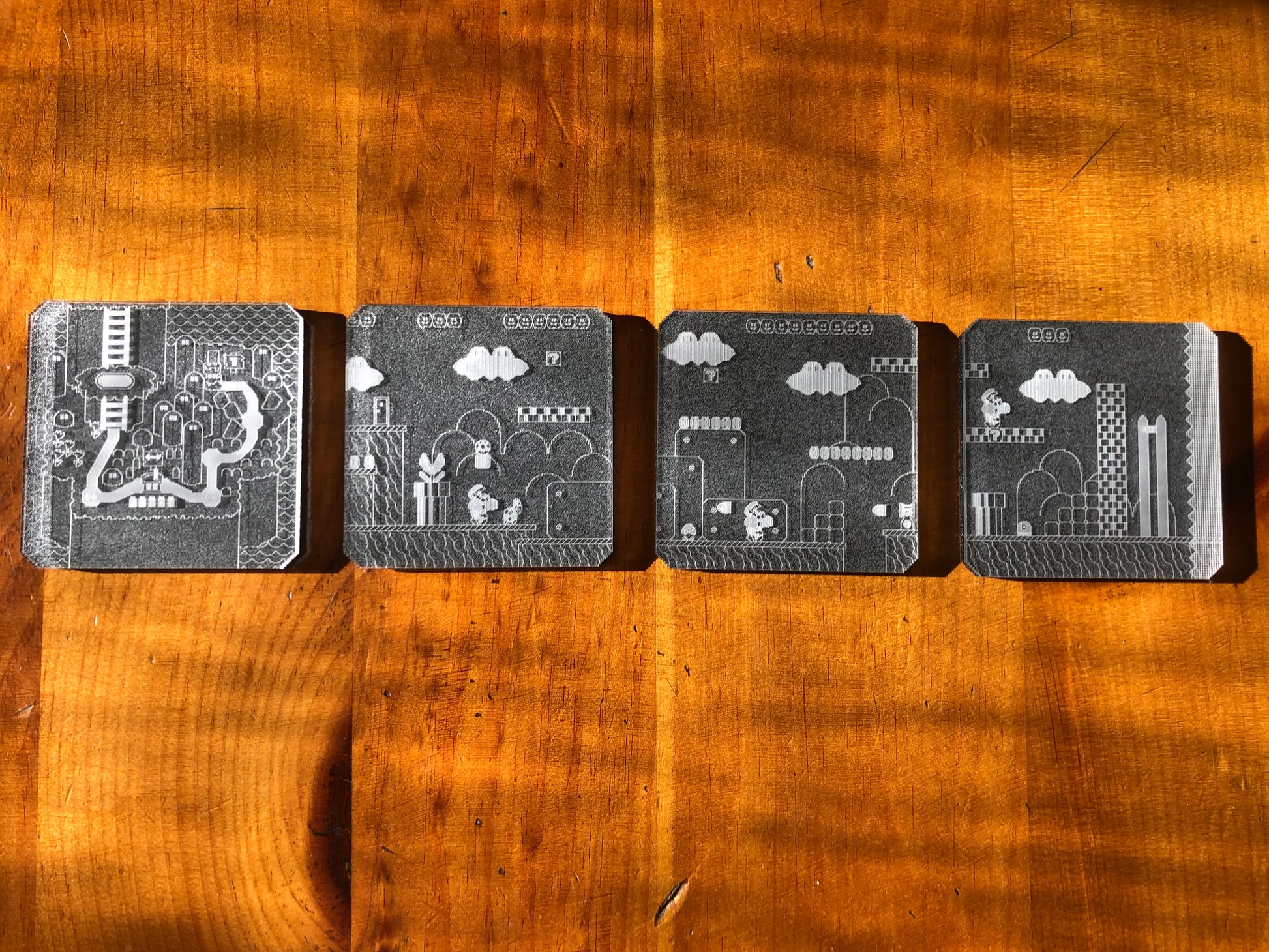 A wonderful set of Acrylic Mario coasters depicting inspired designs Super Mario World 3 platforming game. This set includes four coasters per set. Each coaster is made from 1/8" thick durable clear acrylic sheets with a felt backer to prevent slipping/scratching.