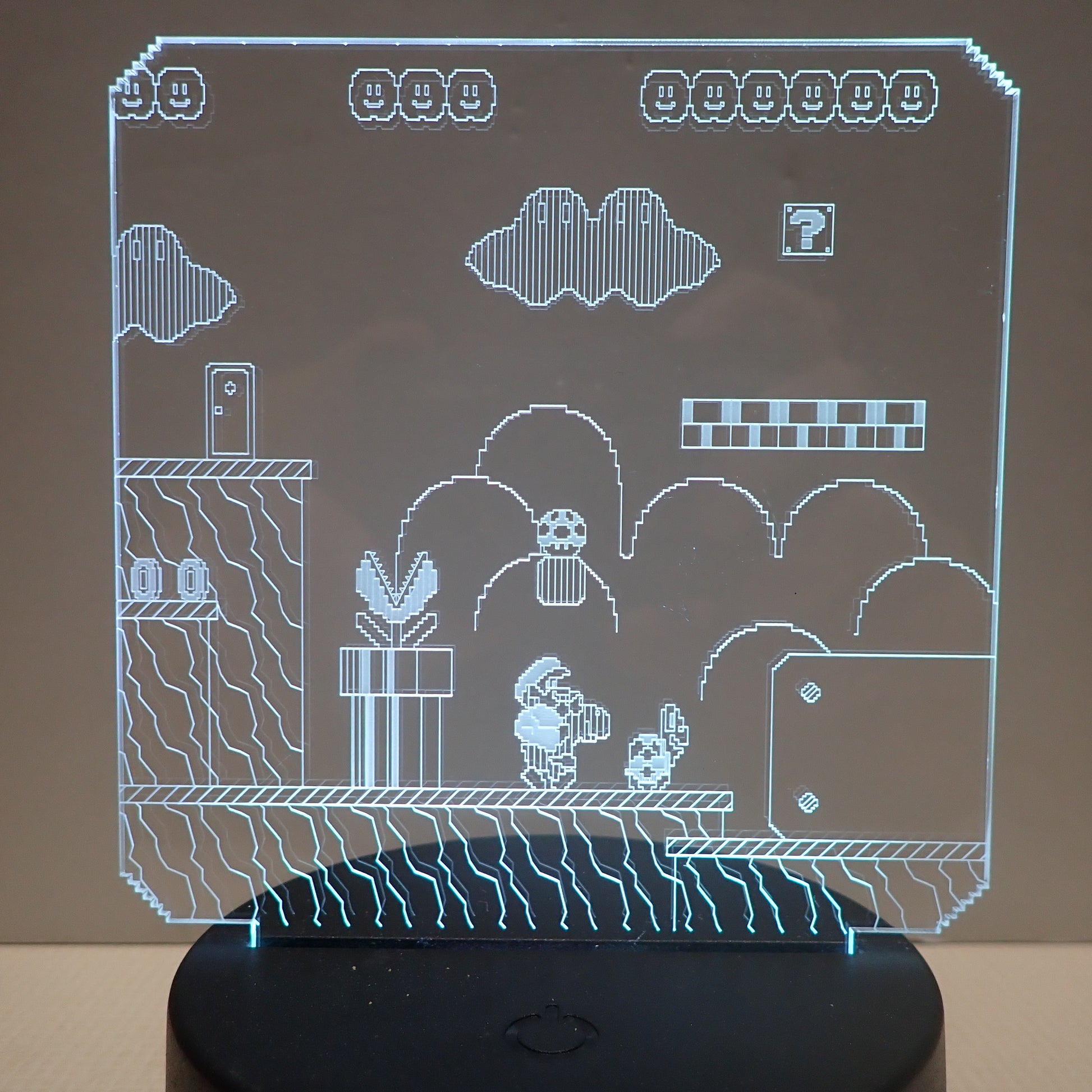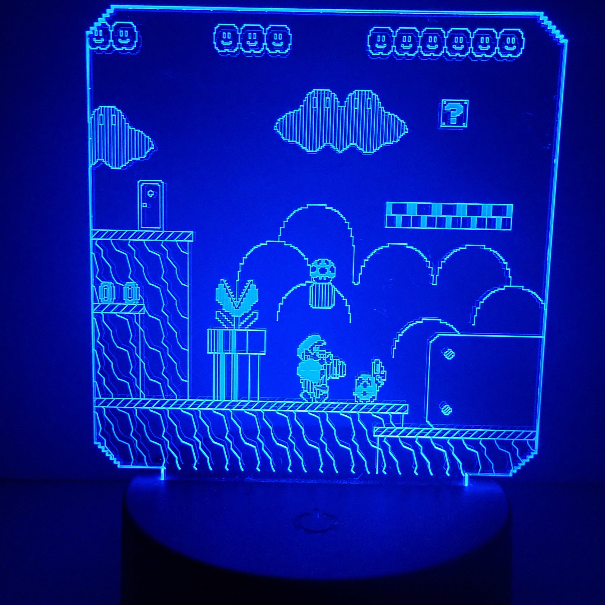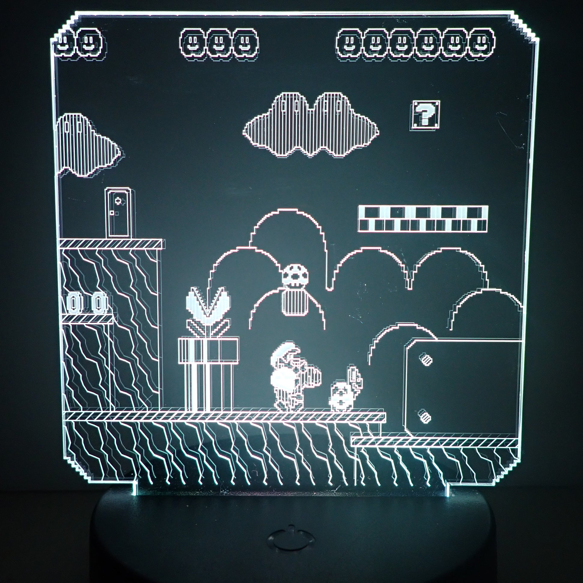 Etched acrylic plate of the SUPER MARO BROTHERS 3 LEVEL. Each model comes with their own mutli-color changing LED light base. Colors include, Red, Yellow, Green, Blue, Magenta, Cyan, Orange and White. The base is either USB powered or battery powered (batteries not included). A great display item for that Mario fan in your life. Put it on your desk, display rack or bookshelf. It even can be used as a night light!