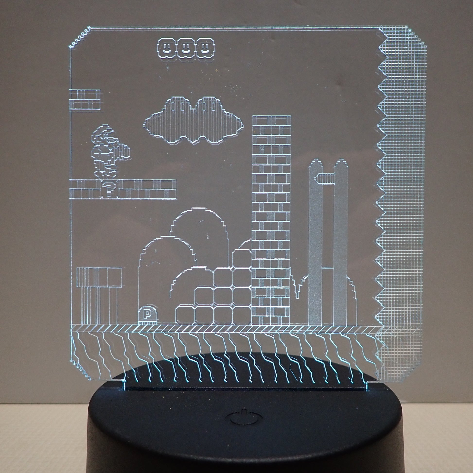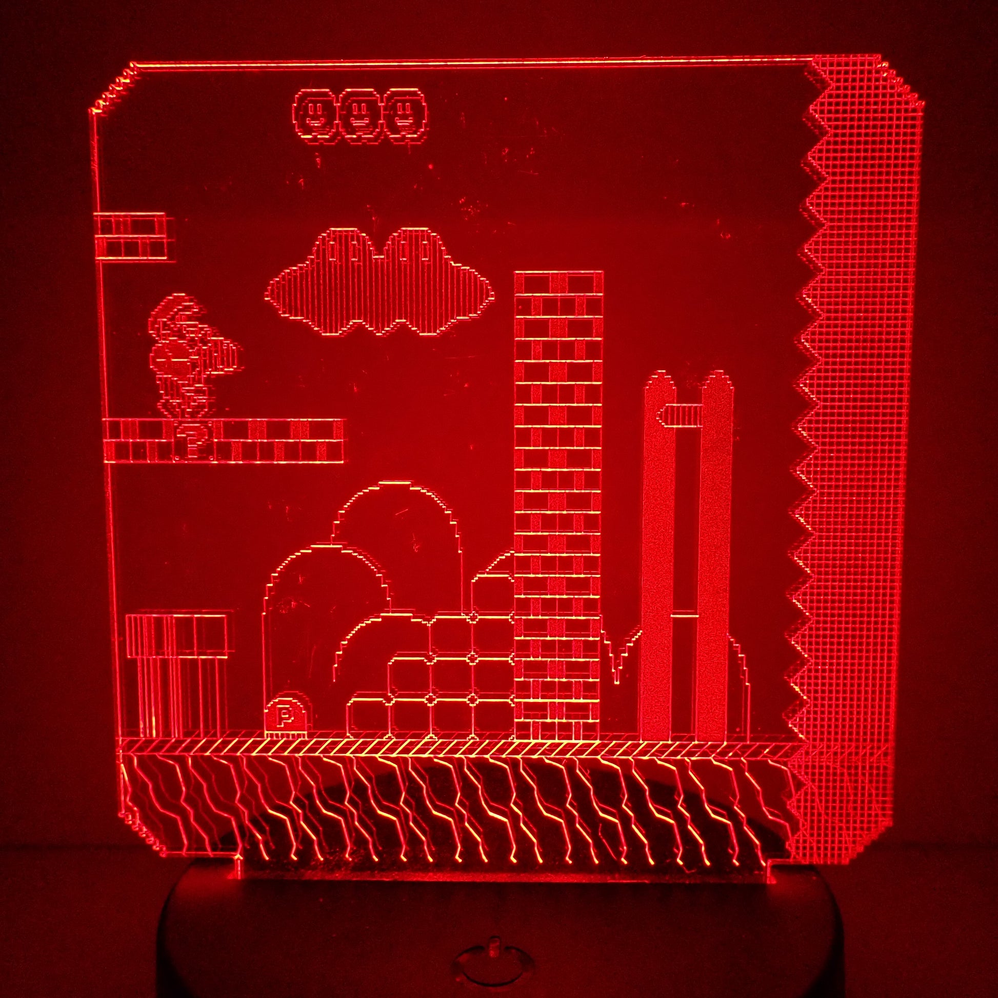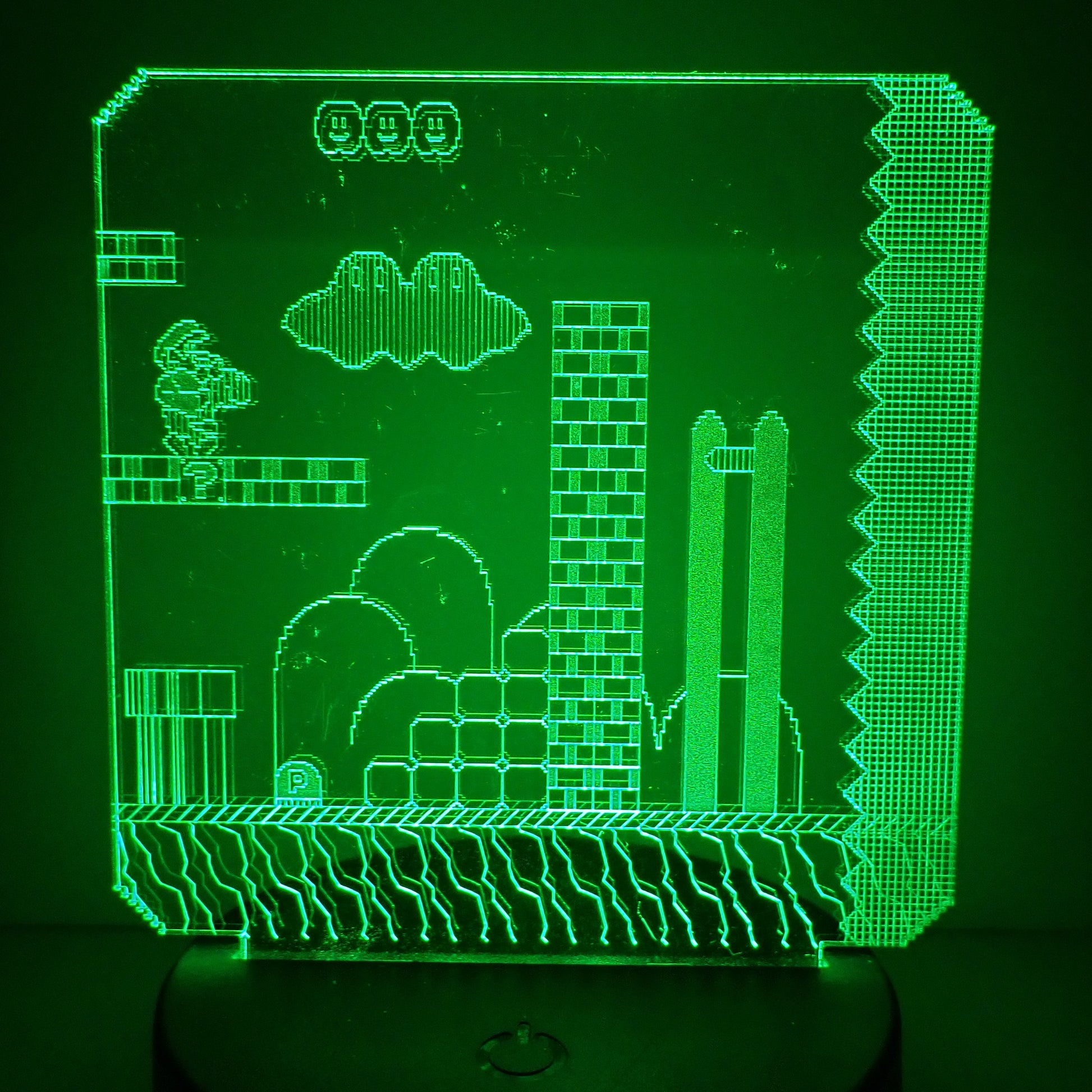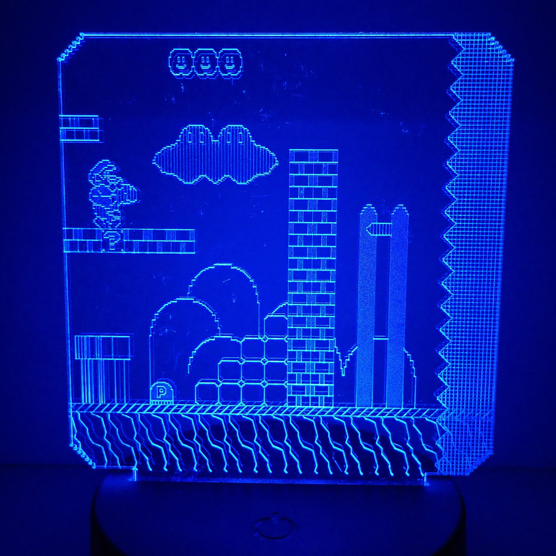 Etched acrylic plate of the SUPER MARO BROTHERS 3 LEVEL. Each model comes with their own mutli-color changing LED light base. Colors include, Red, Yellow, Green, Blue, Magenta, Cyan, Orange and White. The base is either USB powered or battery powered (batteries not included). A great display item for that Mario fan in your life. Put it on your desk, display rack or bookshelf. It even can be used as a night light!