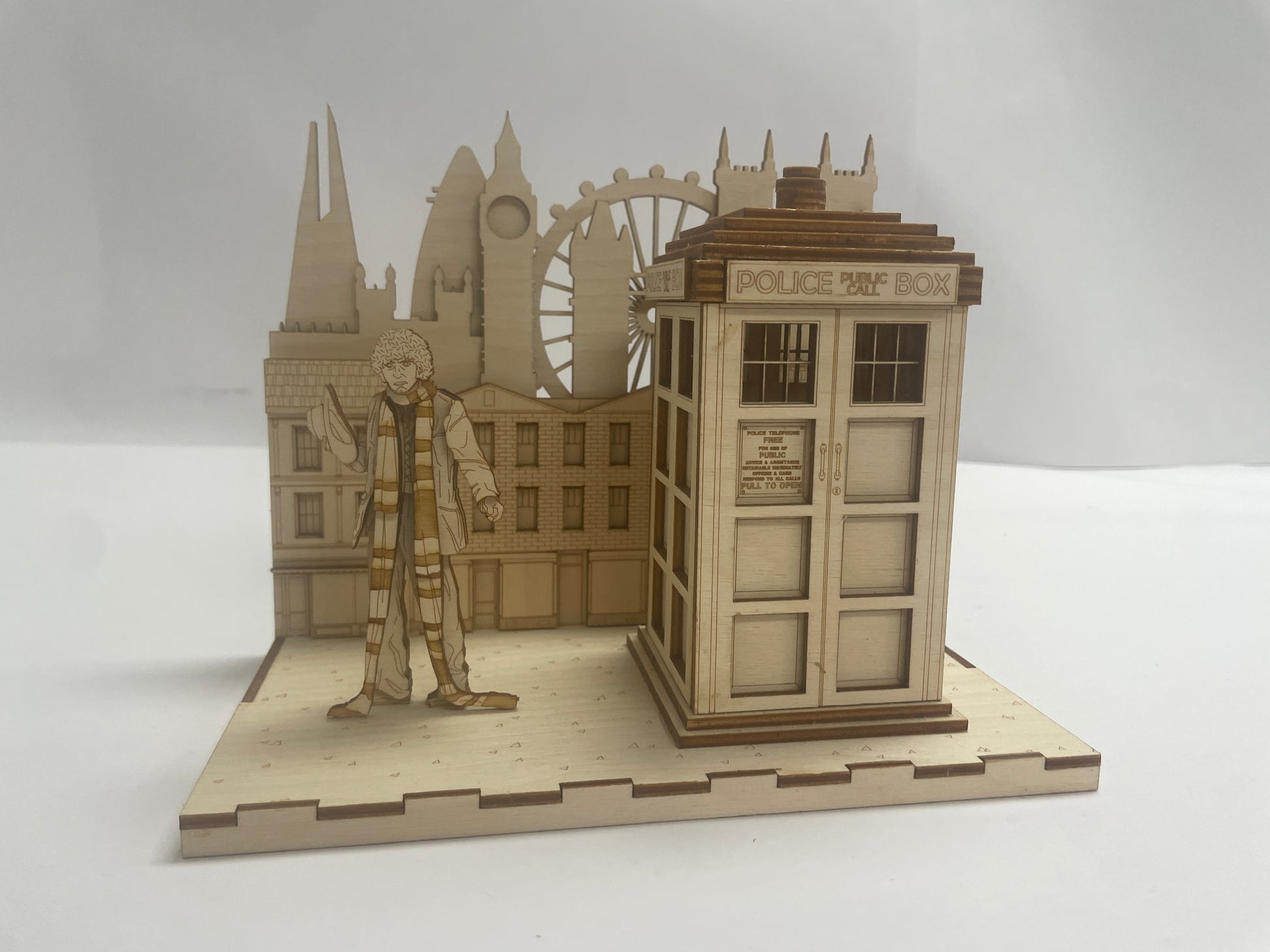 A wonderful panoramic scene of the Doctor with the TARDIS on the streets of London. You get to customize the model with the Doctor of your choosing. Built from durable layers of plywood to create a three dimensional effect. A perfect model for your Whovian in your life. It can sit on a desk, a shelf, inside a display case. This model is a great addition to your Doctor Who collection. Own this one of a kind product showing off one of the iconic scenes of the franchise.