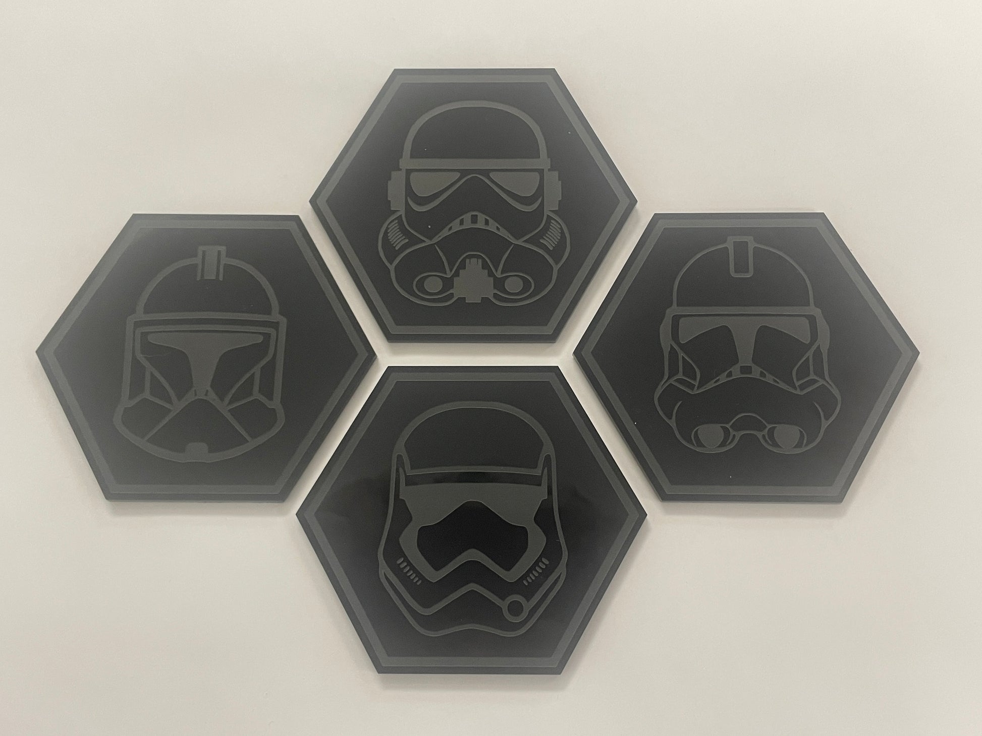 A wonderful set of Acrylic Helmet coasters. This set includes Storm Trooper, Clone Trooper Version 1, Clone Trooper Version 2, First Order. Each coaster is made from 1/8" thick durable clear acrylic sheets with a black felt backer to prevent slipping/scratching.