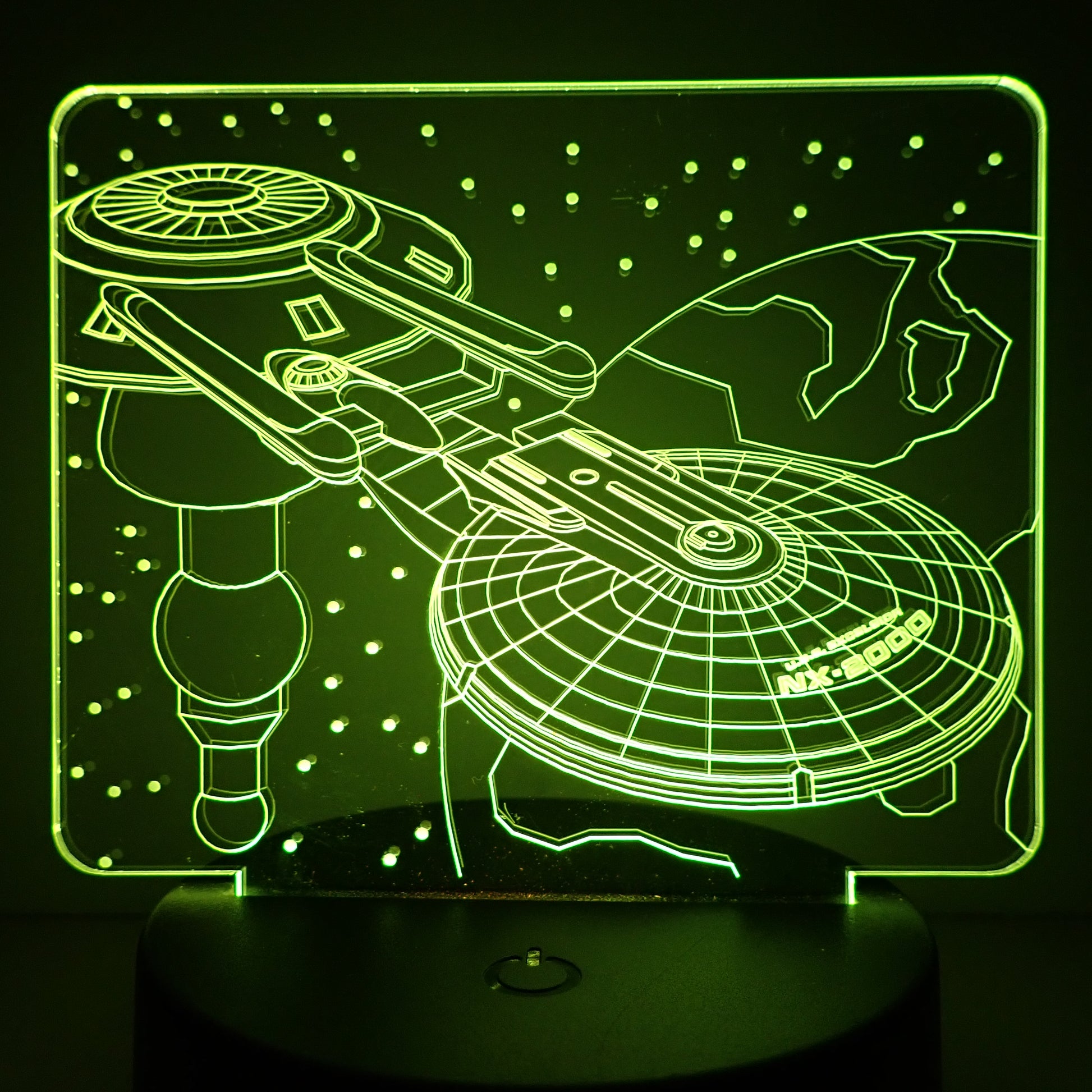 Etched acrylic display plate of the USS Excelsior, leaving space dock for its maiden voyage. Go exploring Captain Sulu and his crew. Each model comes with their own mutli-color changing LED light base. Colors include, Red, Yellow, Green, Blue, Magenta, Cyan, Orange and White. The base is either USB powered or battery powered (batteries not included). A great display item for that Trekkie in your life. Put it on your desk, display rack or bookshelf. It even can be used as a night light!